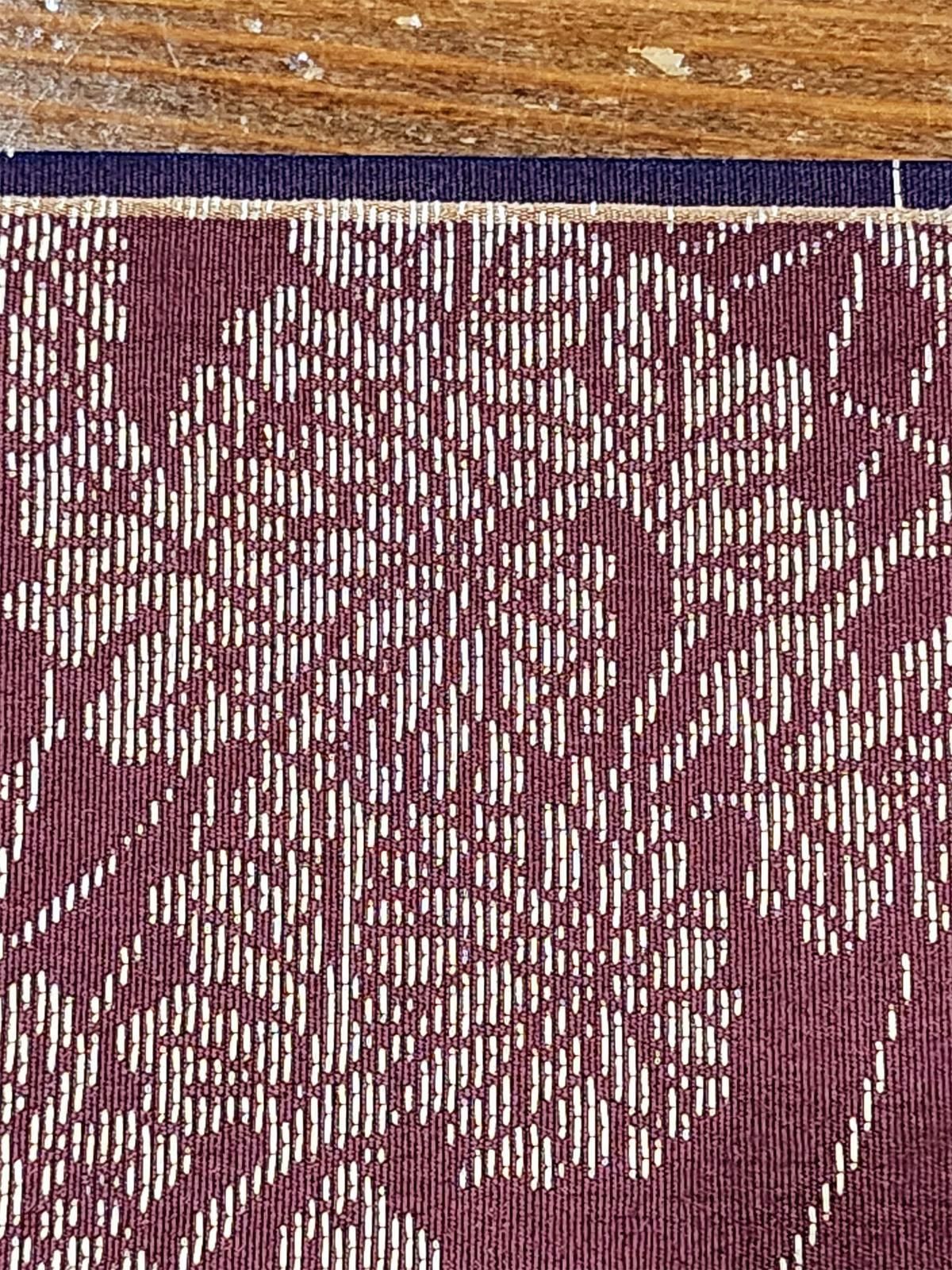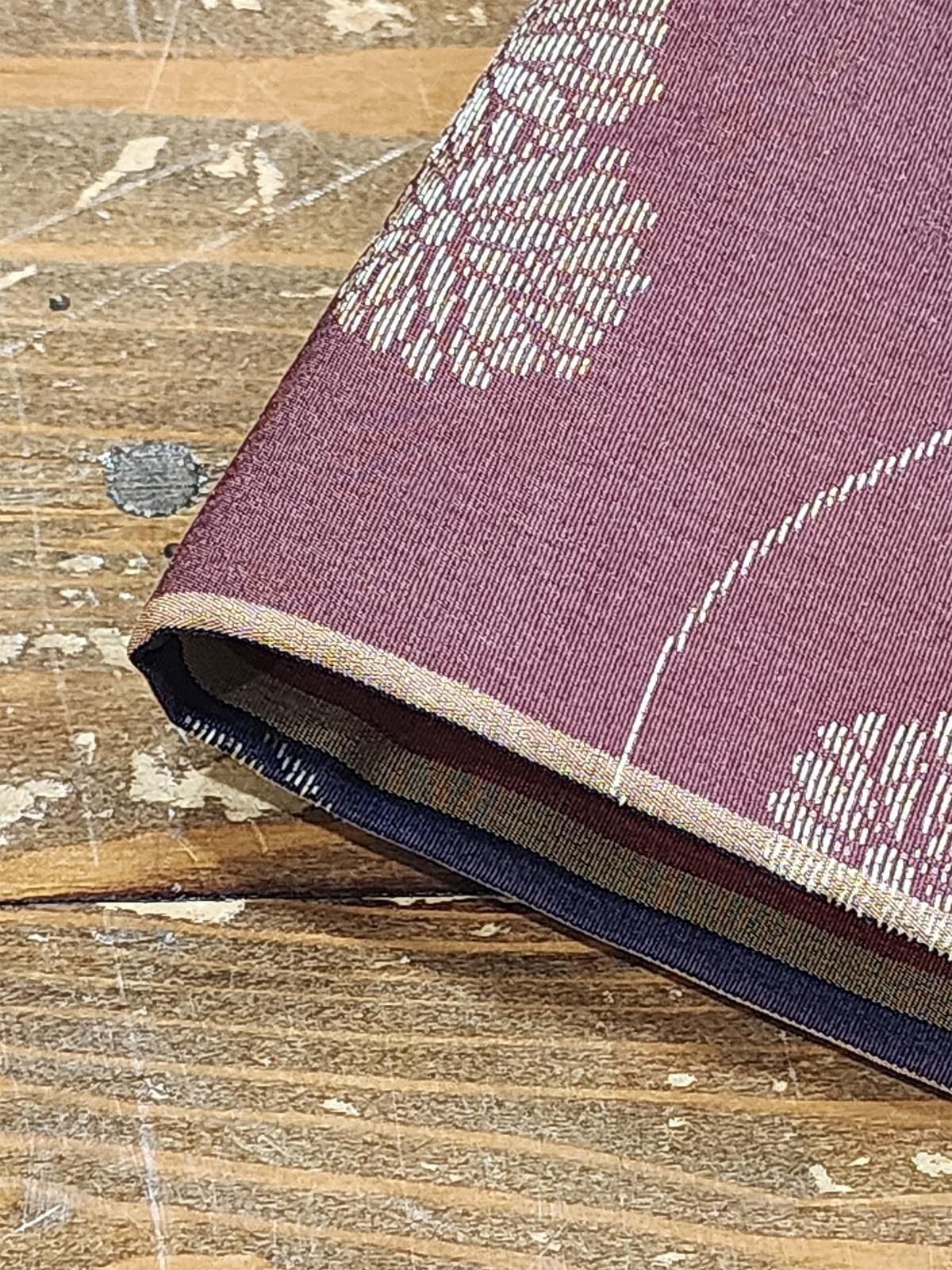 - デザイン: 銀朱のようなスモークがかったおだやかな朱色、蘇芳色に近い華やぎのある茶を基調に、紫紺の縞がきりりとしたアクセントに。金糸で織り出した菊花や尾花などの繊細な秋草模様が工芸品のように美しく洗練された風雅な物語をつむぎだします。縞の直線と草花模様の優美なラインが奏でるコントラストが印象的です。