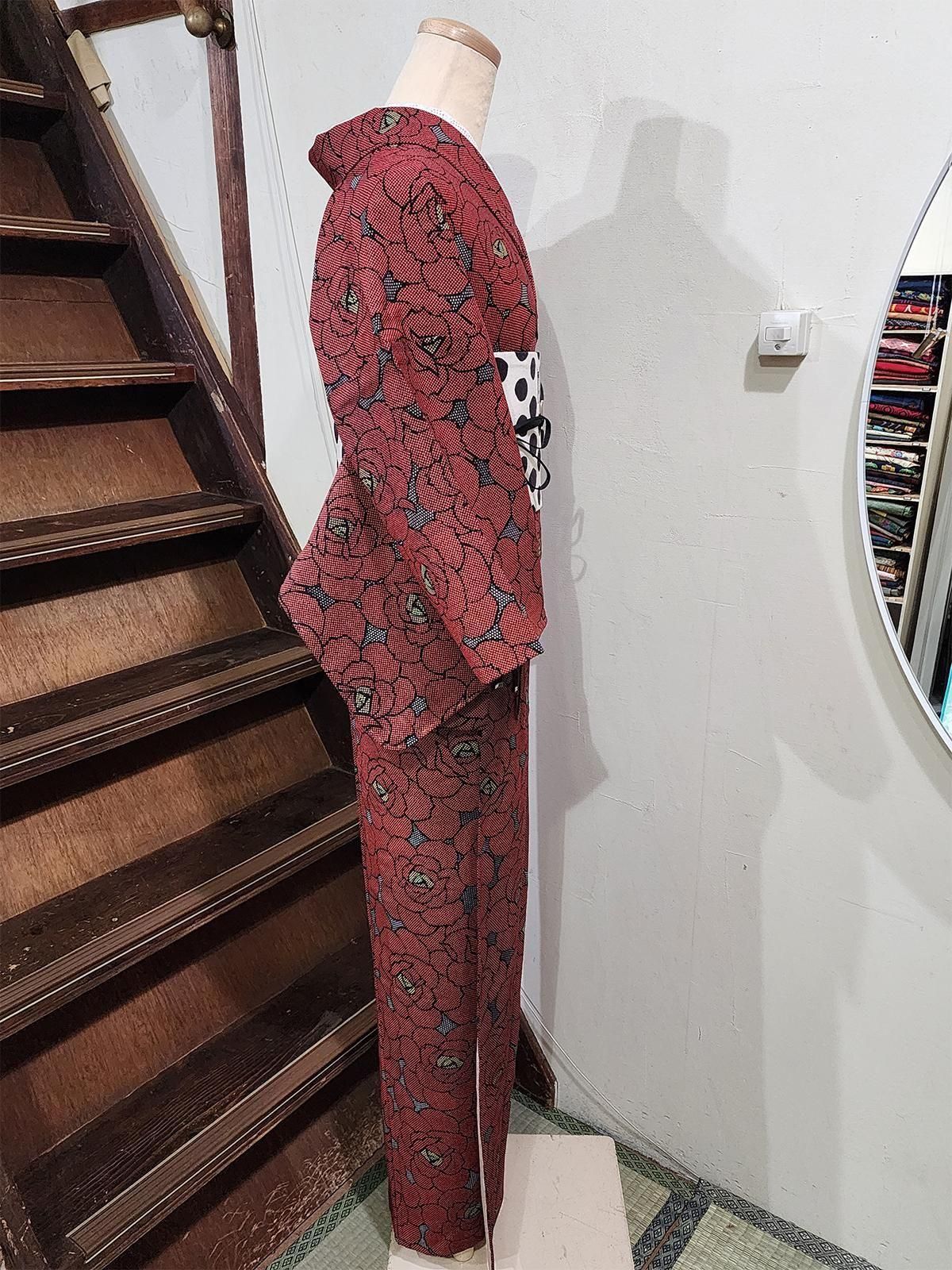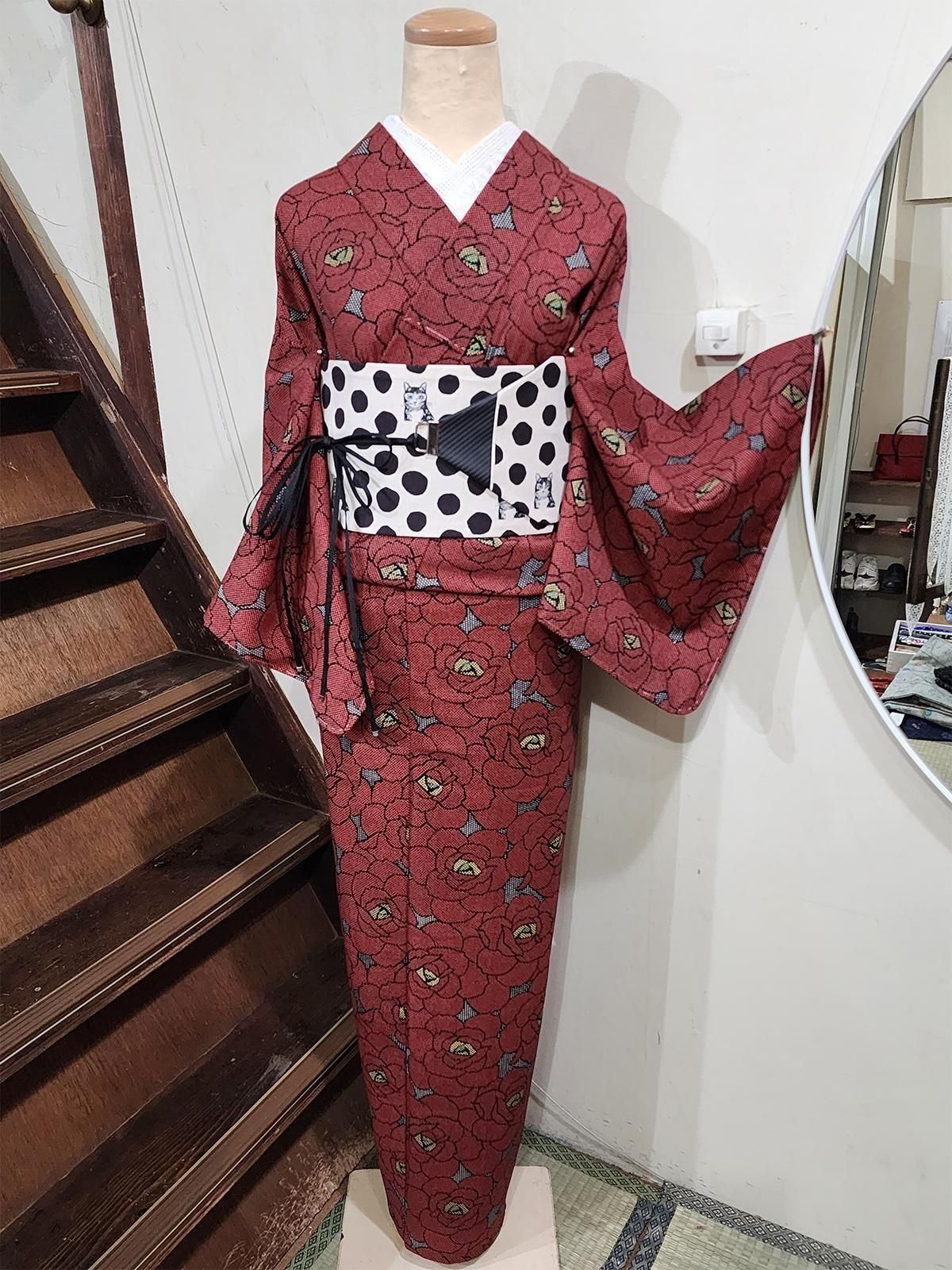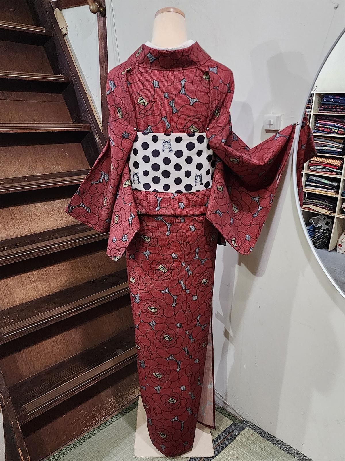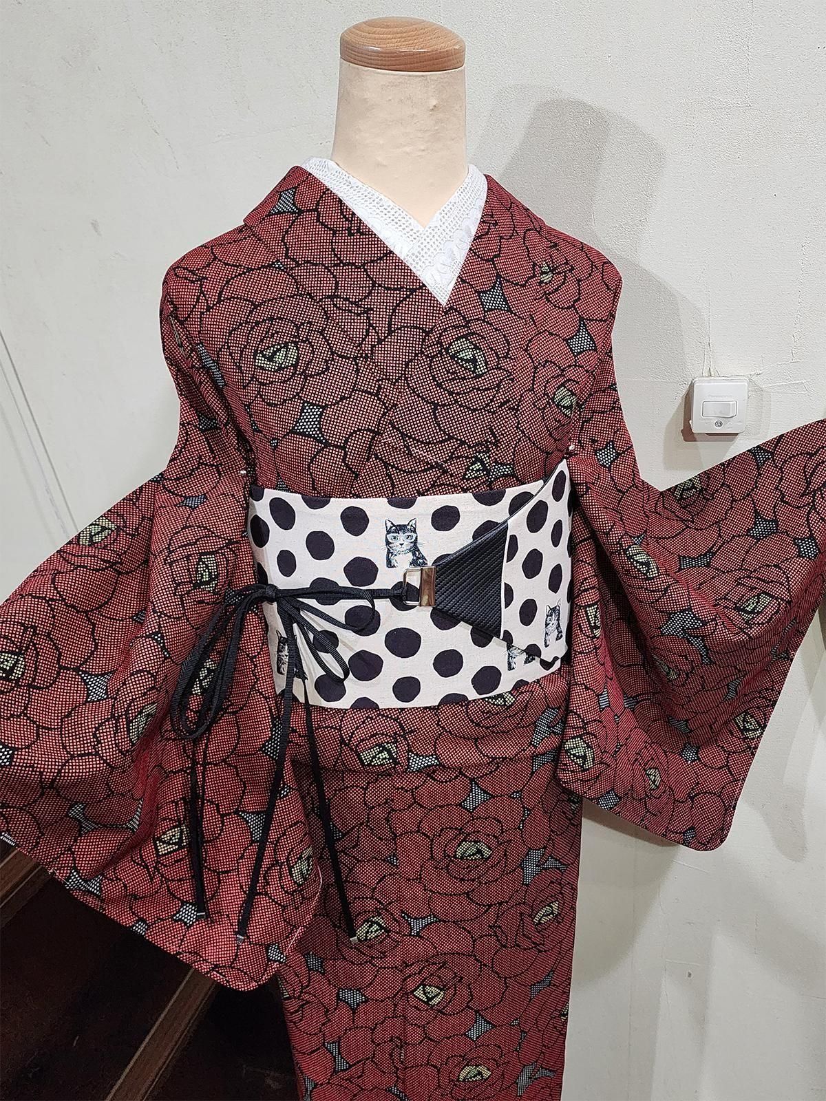 スカーレットルージュの薔薇にブラックチェックを重ねたグラフィカルでアートなデザインにときめくウール単着物