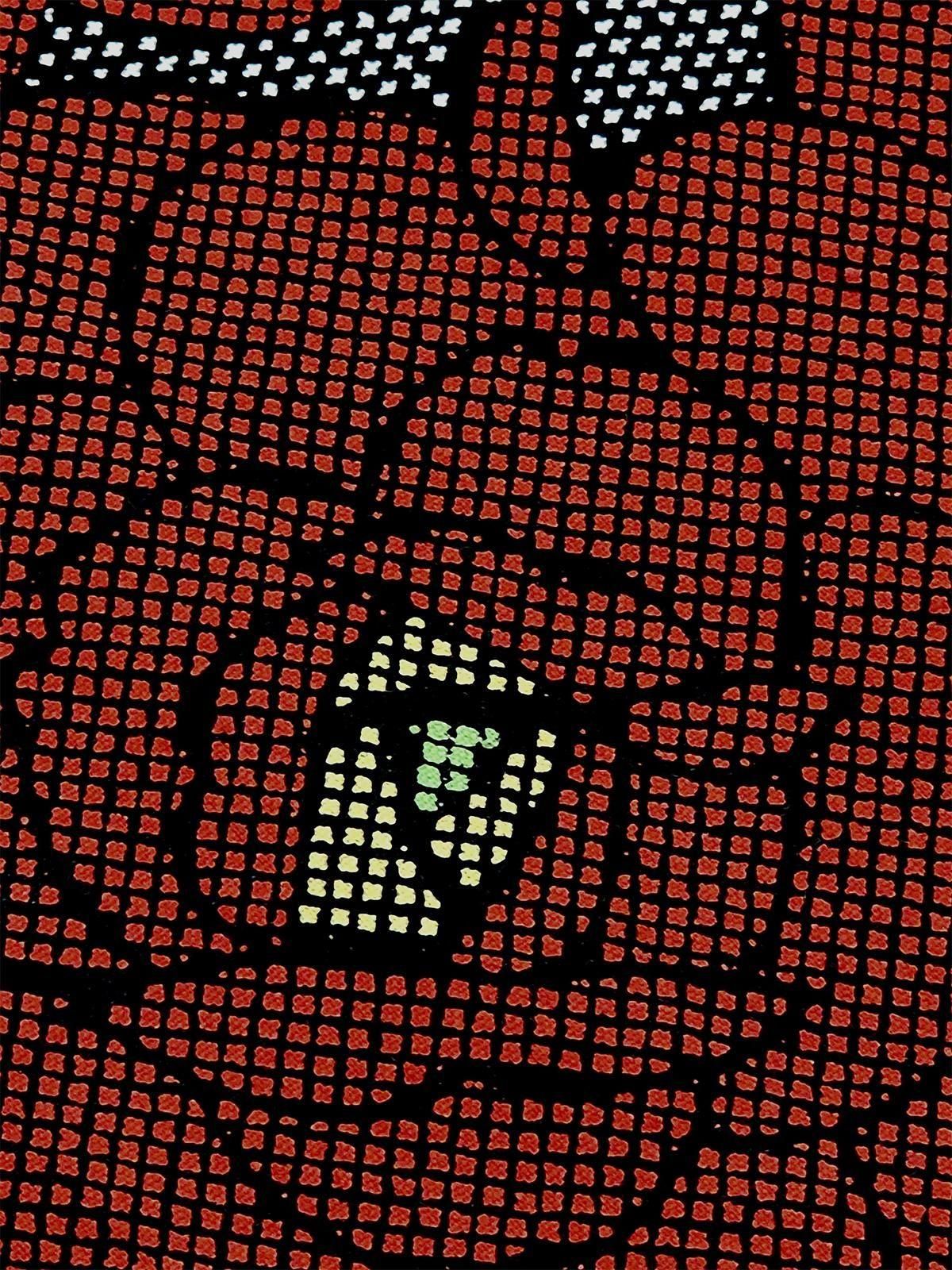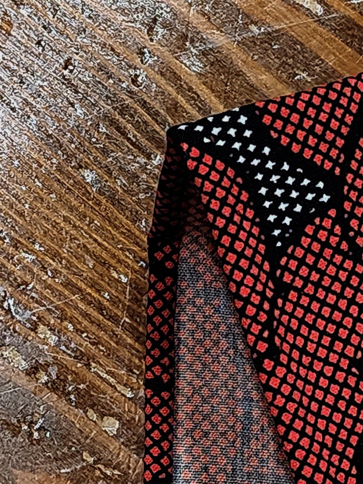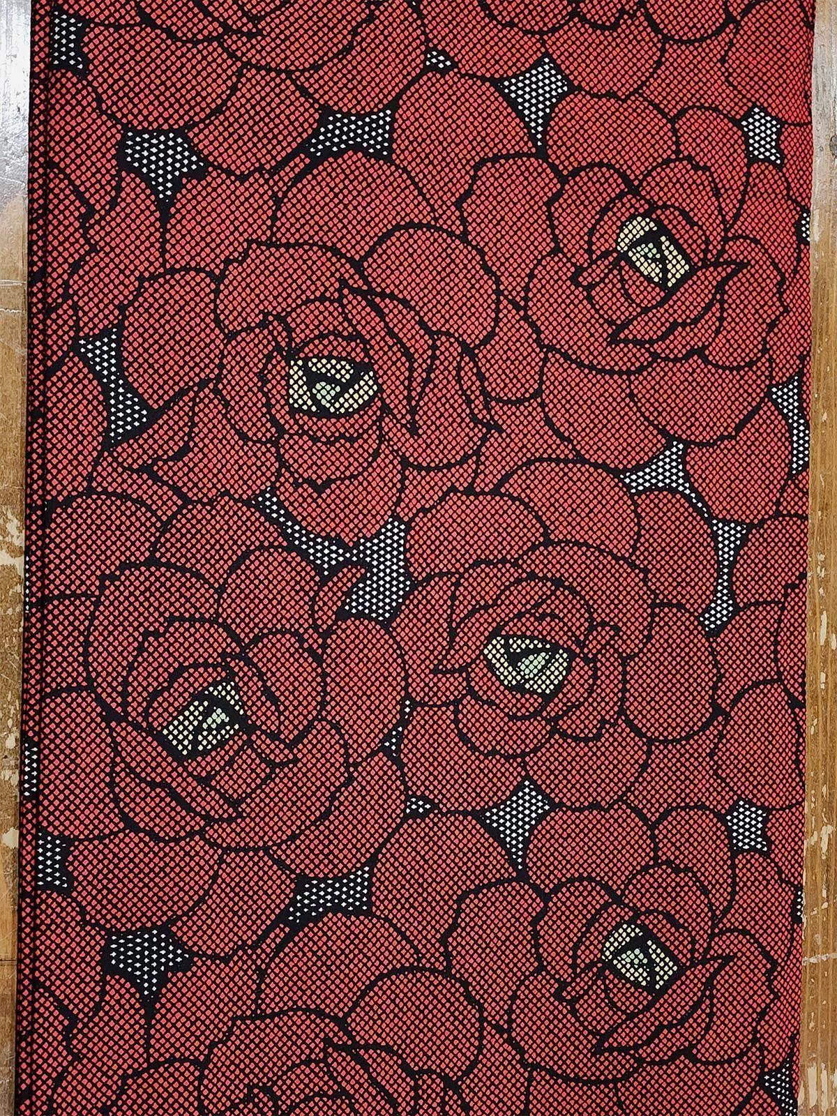 - デザイン:黒と白のクロスドットをベースに、スカーレットルージュ美しい大輪の薔薇がデザインされたアートなテキスタイル。薔薇模様に重ねられた繊細なダイアゴナルチェックがチュールレースを重ねたようなモードな遊び心をプラスしてくれています。