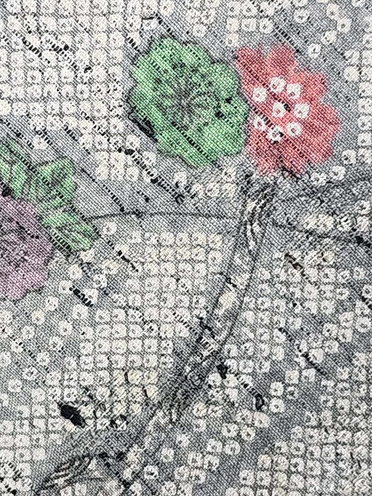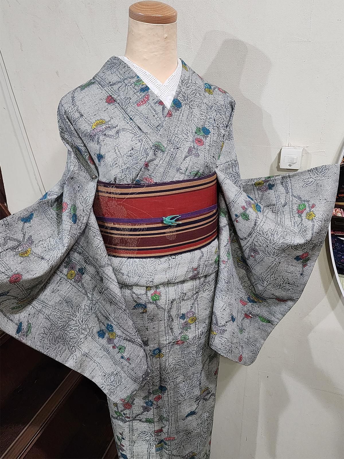 - 印象: 知的で落ち着いたグレーのに、さりげなく華やぐ彩りが映える気品ある佇まい。古典の優美さとモダンな感性が調和した、大人の装いにぴったりな上質な一枚です。