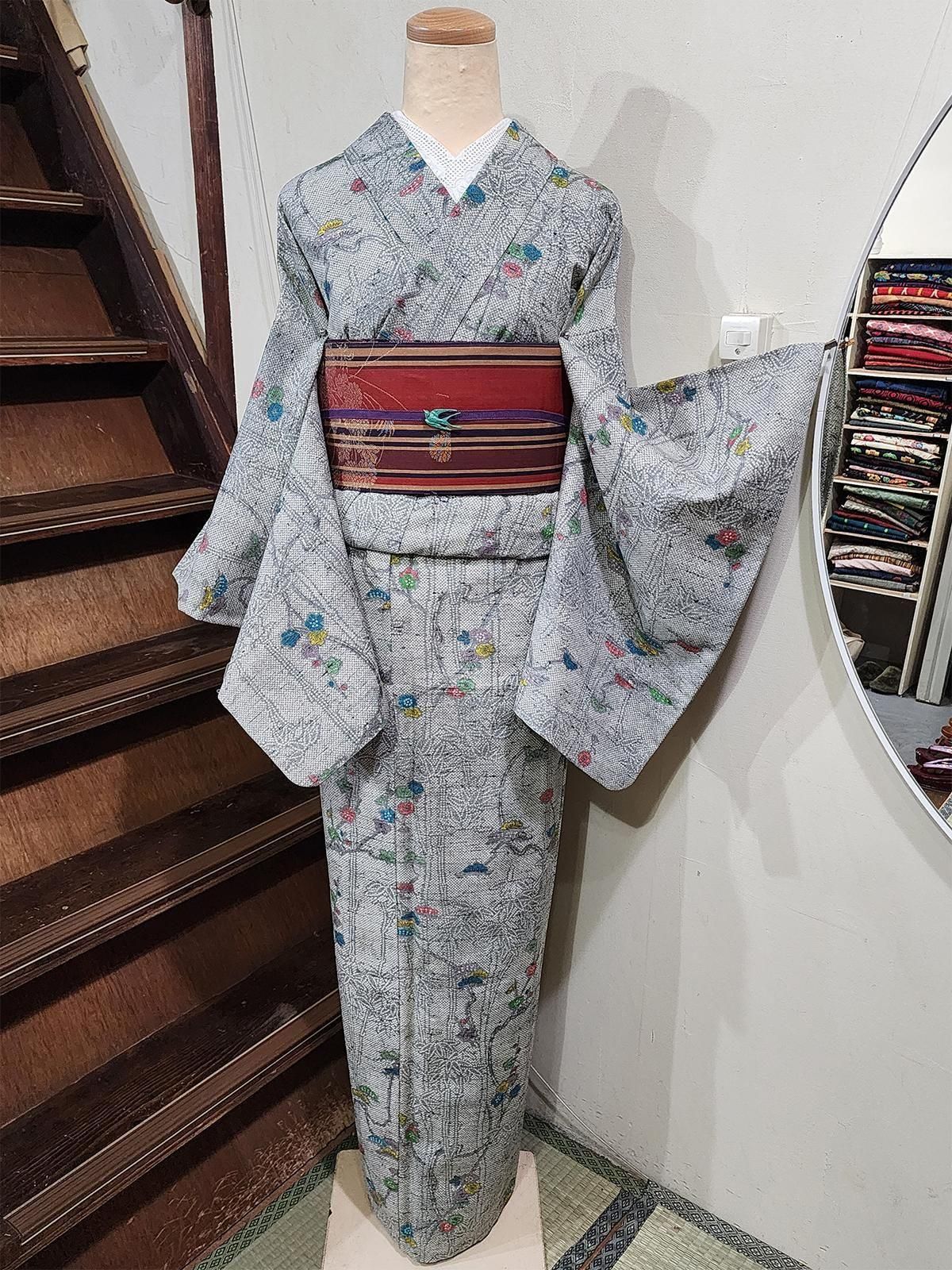グレーの鹿の子模様に、笹の縞がゆらめき、梅と松の彩りが映える古典草花模様美しい、しょうざんウールの単着物
