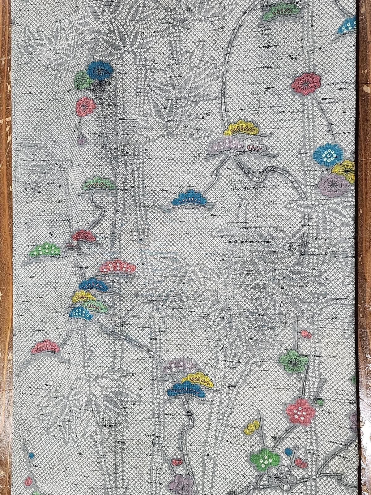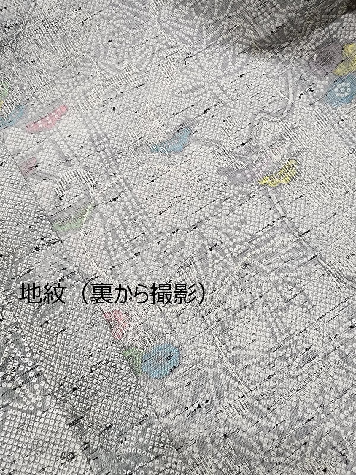 - デザイン: 品の良いおだやかなグレーで染め出された一面の鹿の子模様に、流れるような笹の縞が浮かび、紅・青・若草・黄・鼠藤色などの彩り豊かな梅と松が染重ねられた風雅なデザイン。黒の節糸が全体を引き締め、優美なアラベスクの地紋が光の加減で幻想的に浮かび上がりり奥行きと立体感を添えます。。