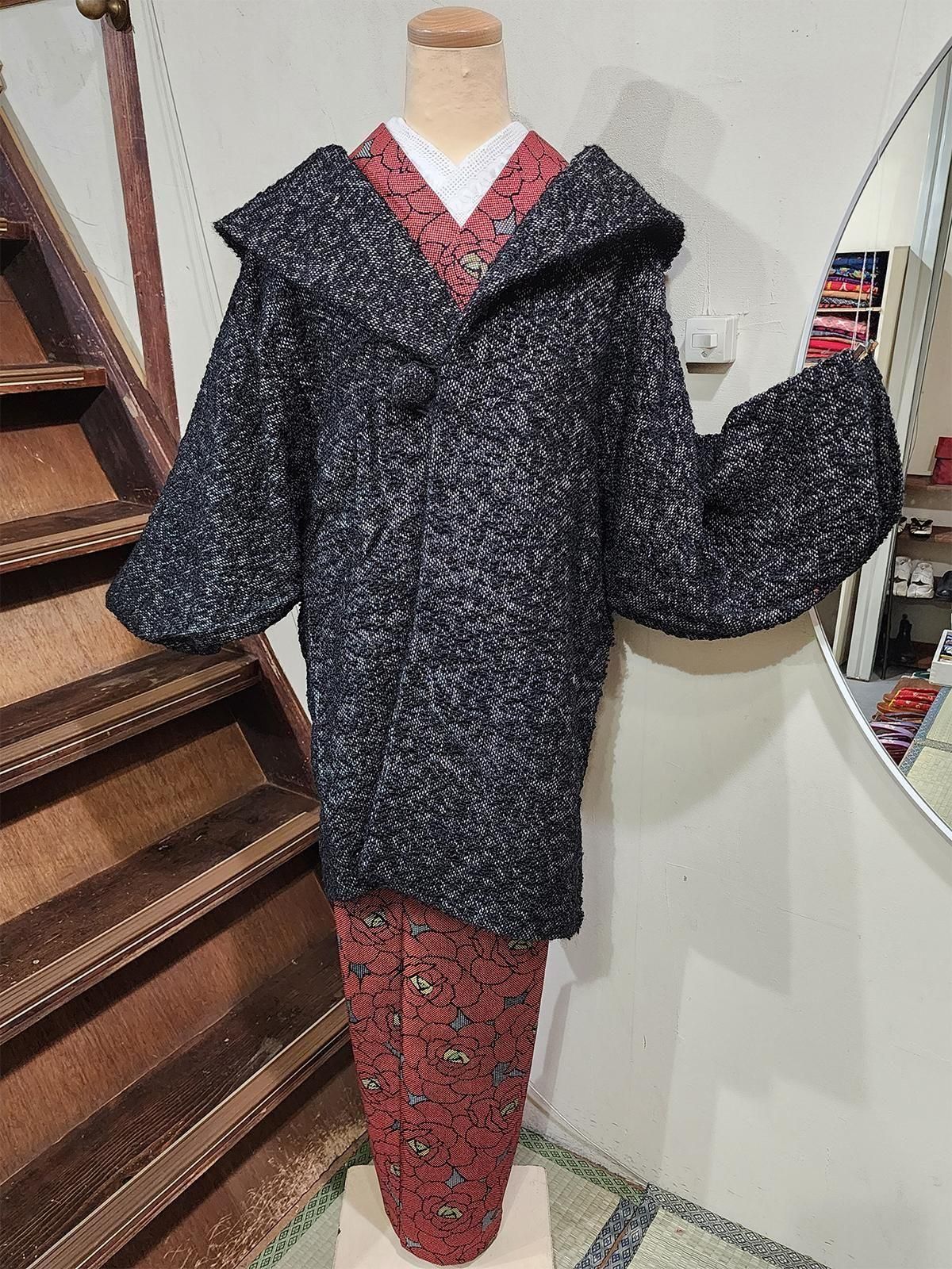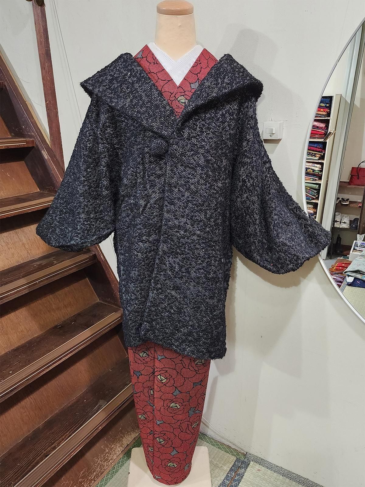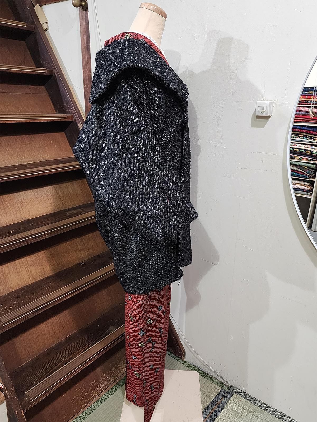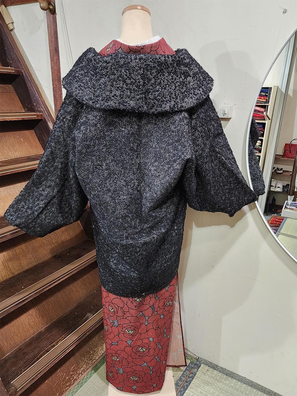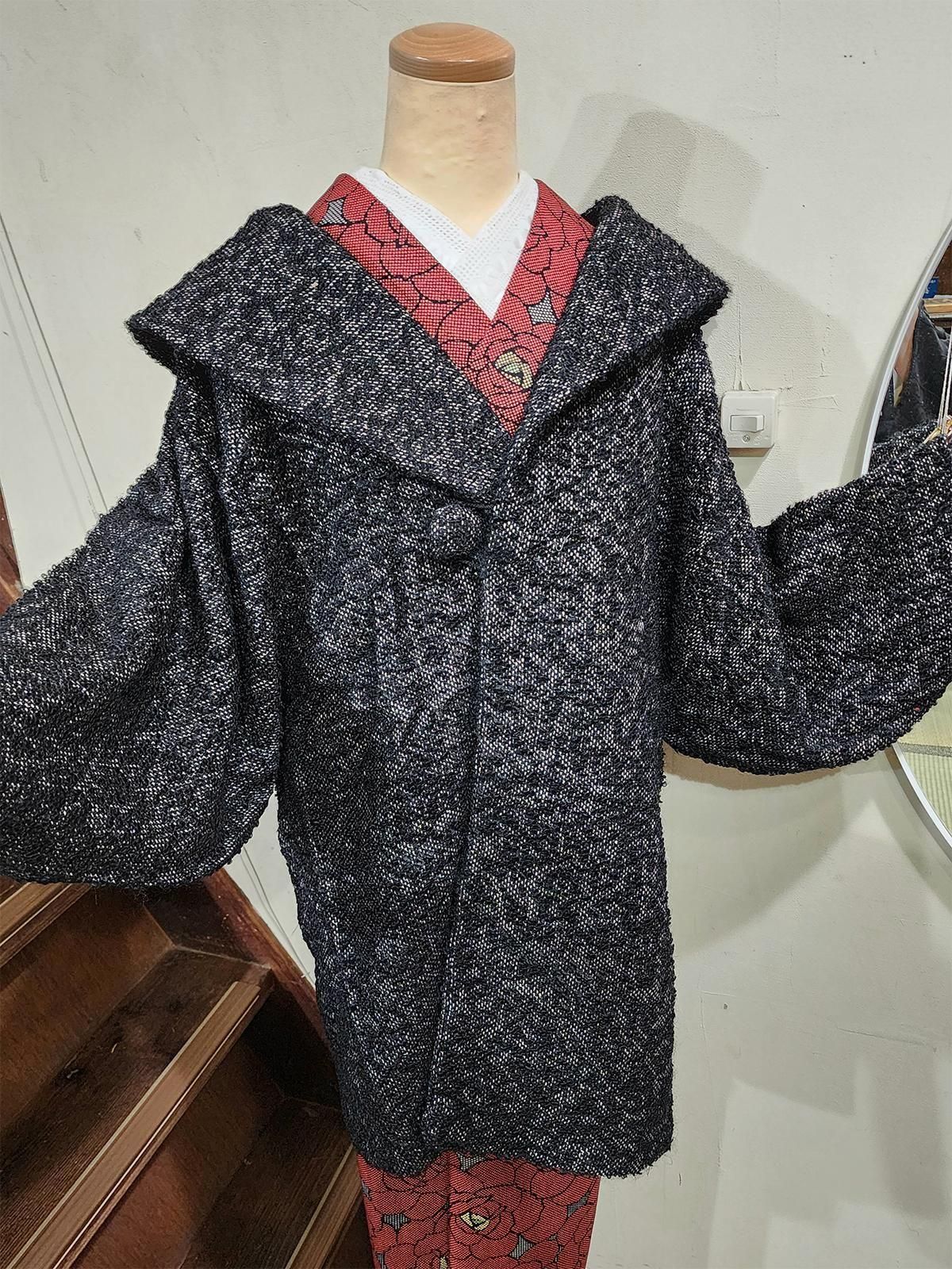モノクロームにきらめくラメ糸がアクセントになったツイード調の風合い。ふっくら暖かな素材とビンテージならではの美しいシルエットが魅力の冬着物コート