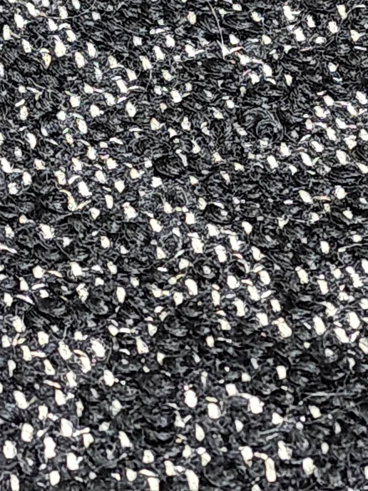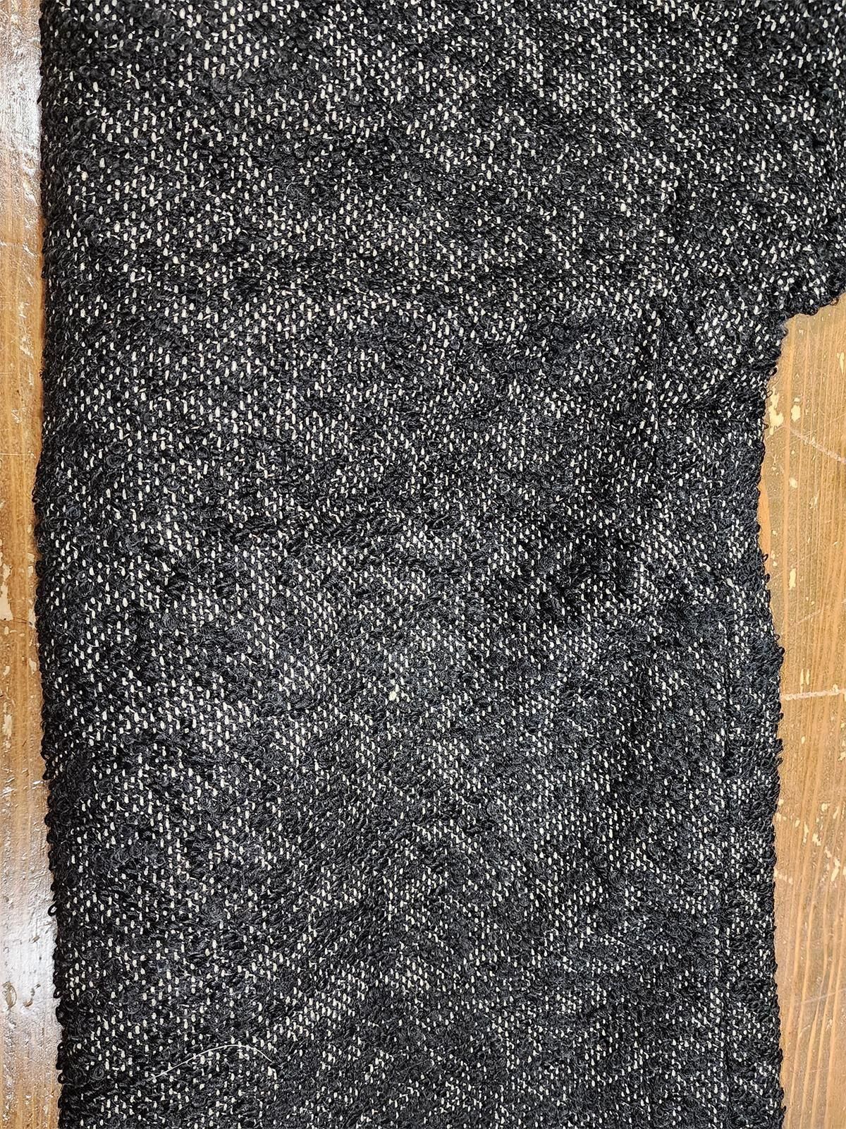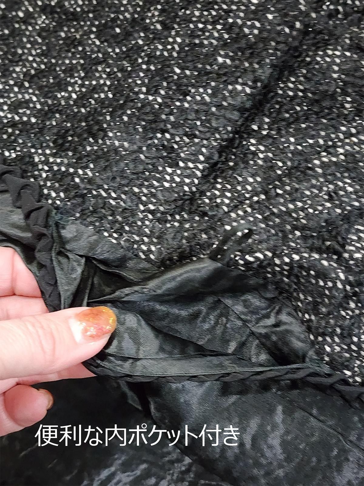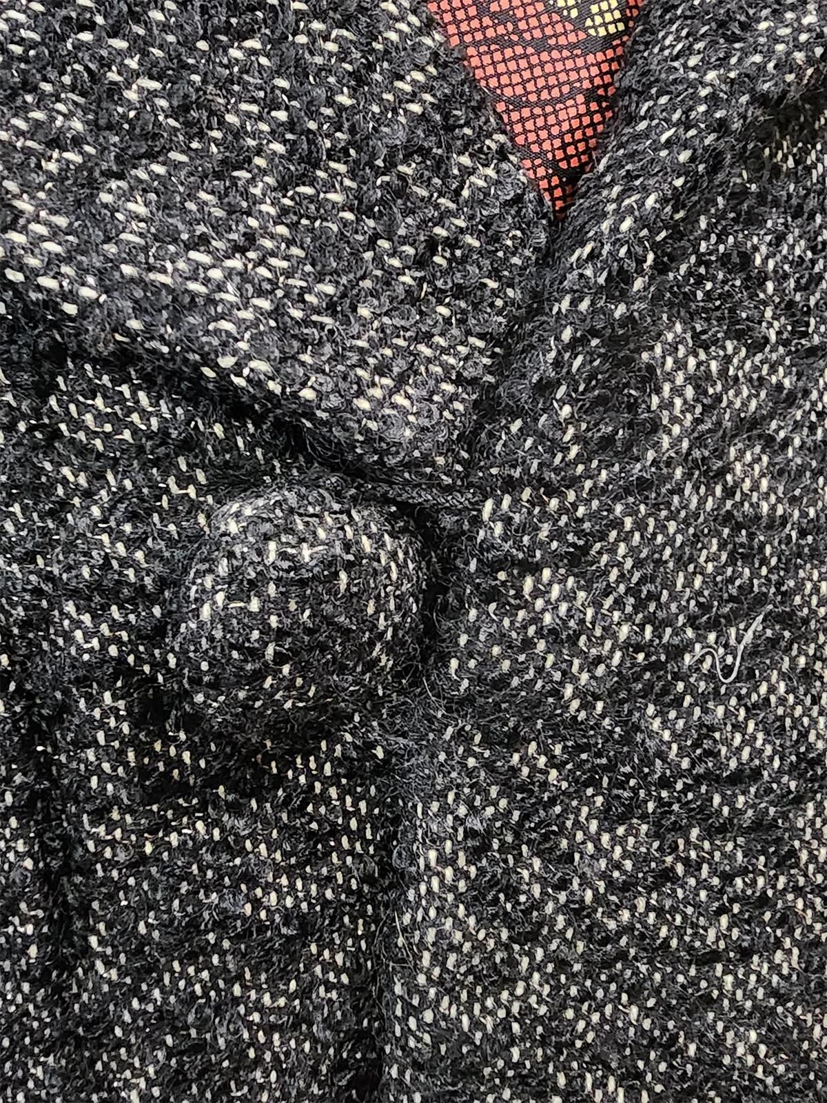 - デザイン: 黒と白の太糸に光沢糸を織り込んだツイード調の生地が、立体感のある陰影を生み出す上品なデザイン。形の美しい大きな衿が、ボリューム感のあるシルエットをすっきりと見せてくれます。共布のくるみボタンがクラシックなアクセント。