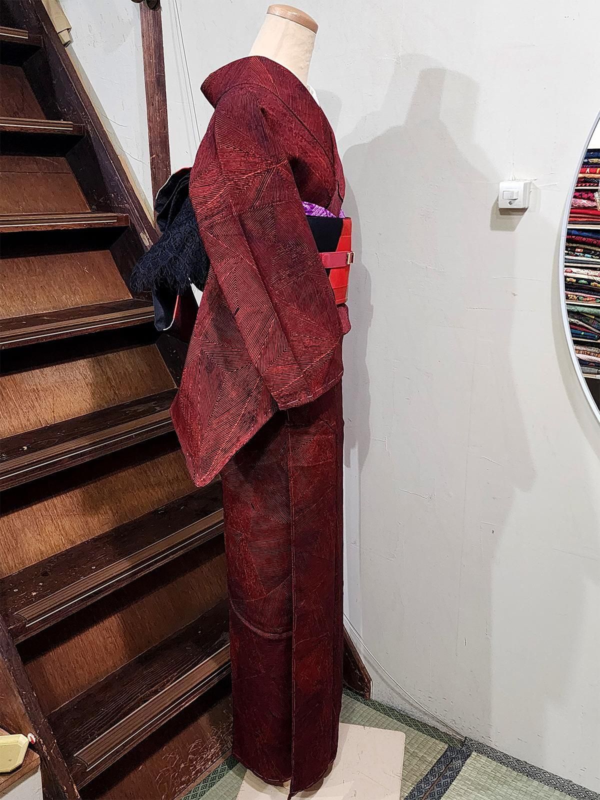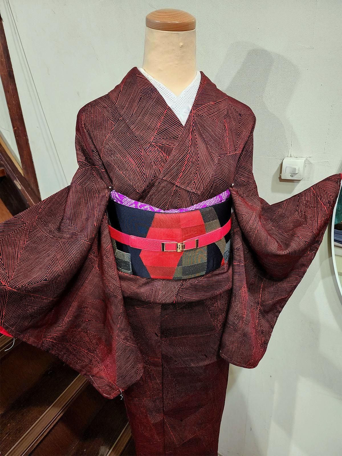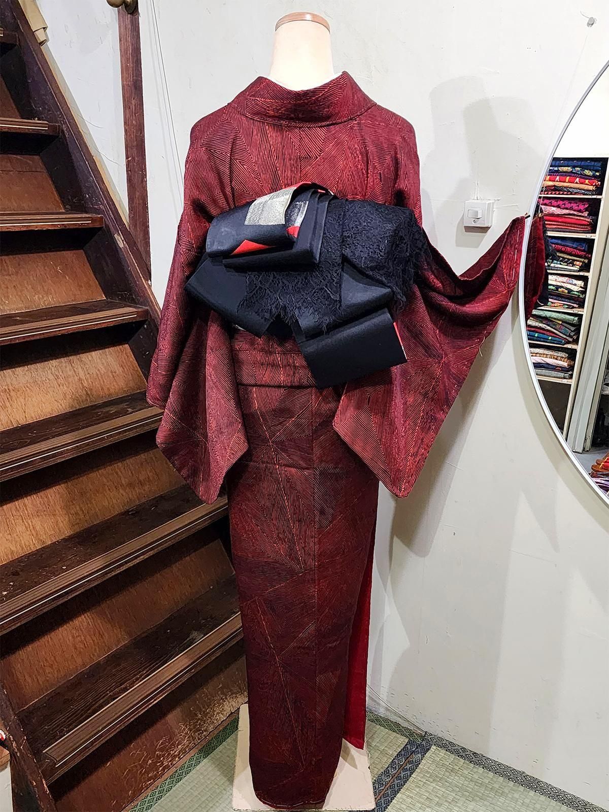ブラックにルージュレッドの微細なラインがはしり、アートな幾何学模様を描き出す正絹袷着物
