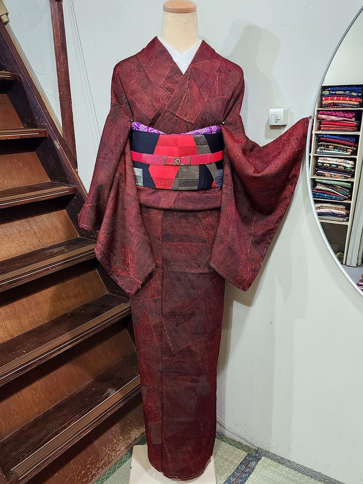- 印象: シックなトーンにリズミカルな幾何学模様が映え、凛として都会的。繊細なパターンのモードなバイカラーが大人の落ち着きを生み、帯合わせでロックにもモードにも振れる一枚です。