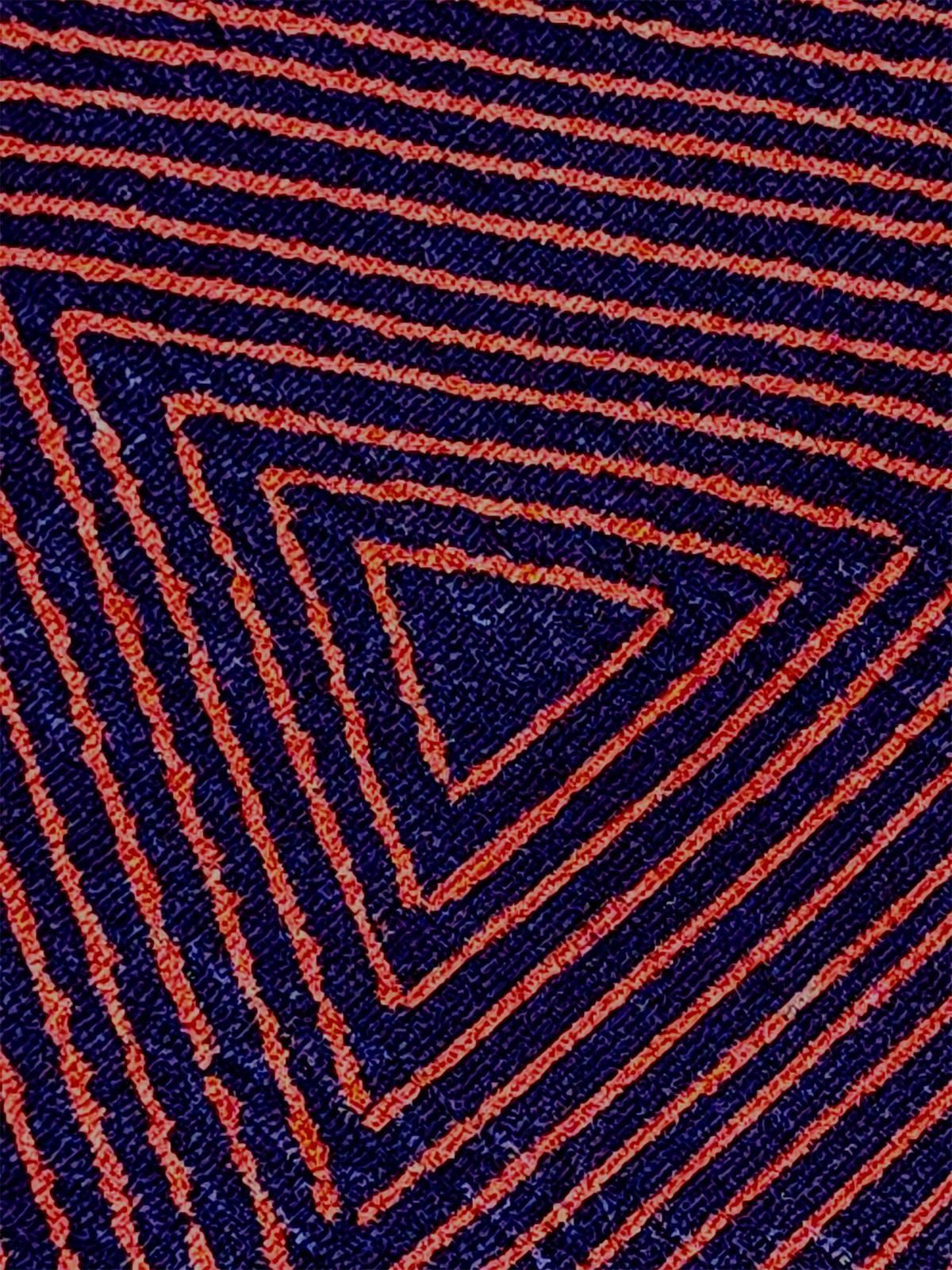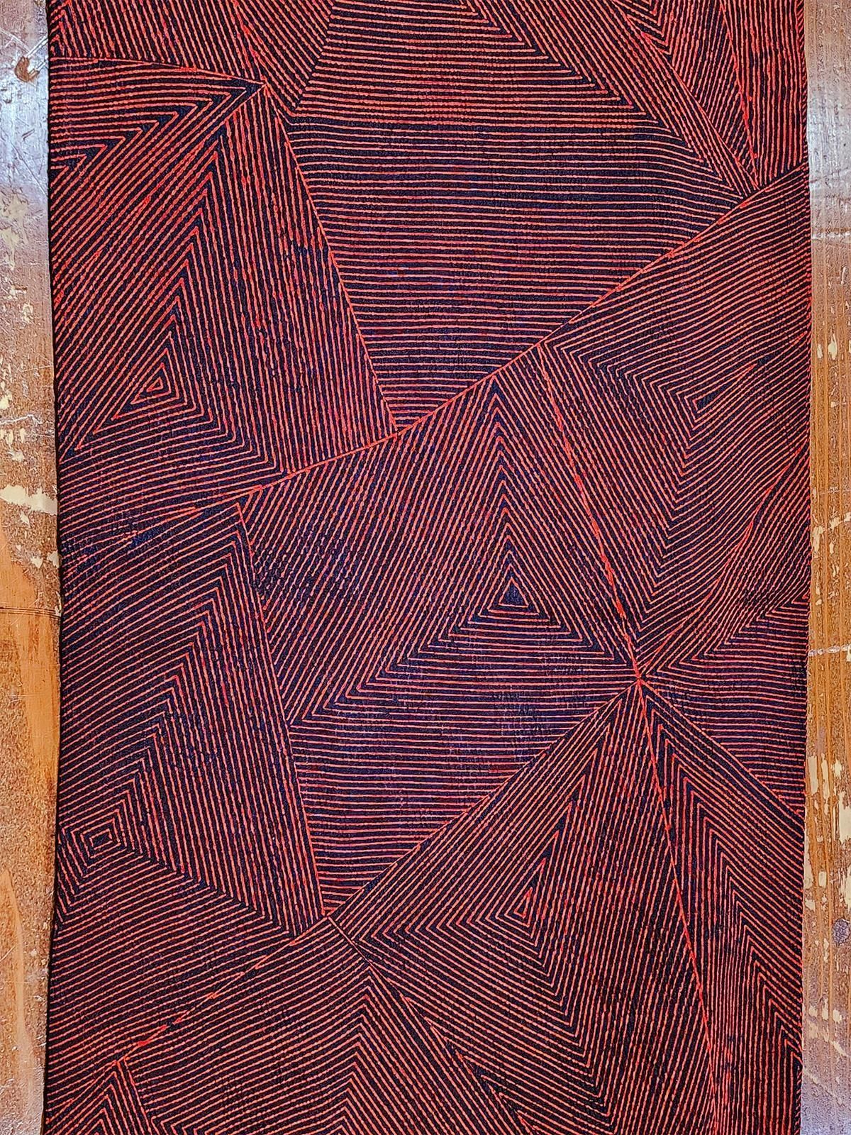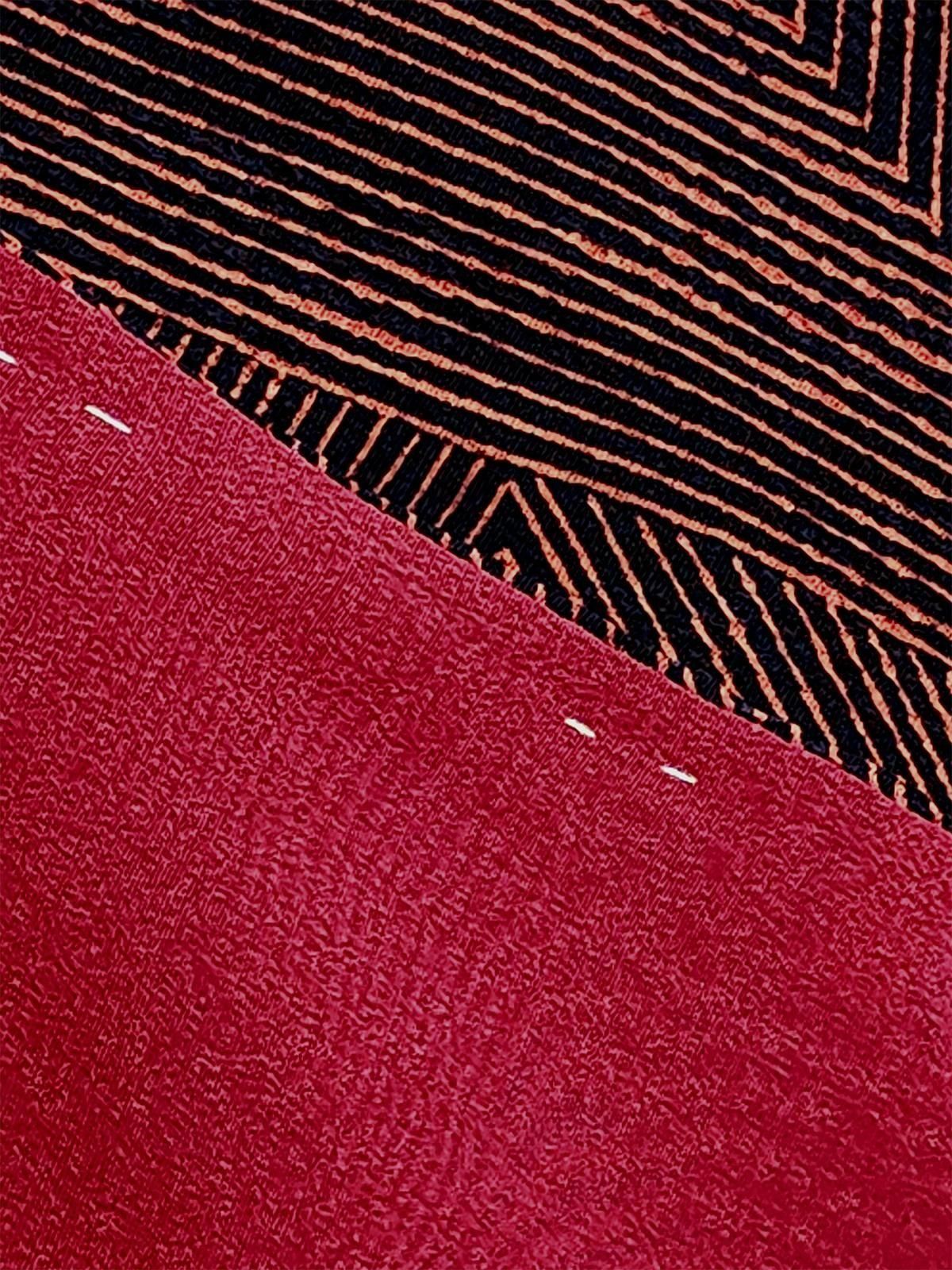 - デザイン: 黒地に赤の極細のラインを重ねて、トライアングルやスクエアをパッチワークのように組み合わせたモダンなグラフィカルパターンがデザインされたアートな一枚。斜めの立涌縞のような曲線美しい地紋が光の加減で浮かび上がり、曲線と直線の重なりがつくりあげる奥行きのある表情が美しく、シンプルでいて他にはない存在感と個性を感じさせてくれます。