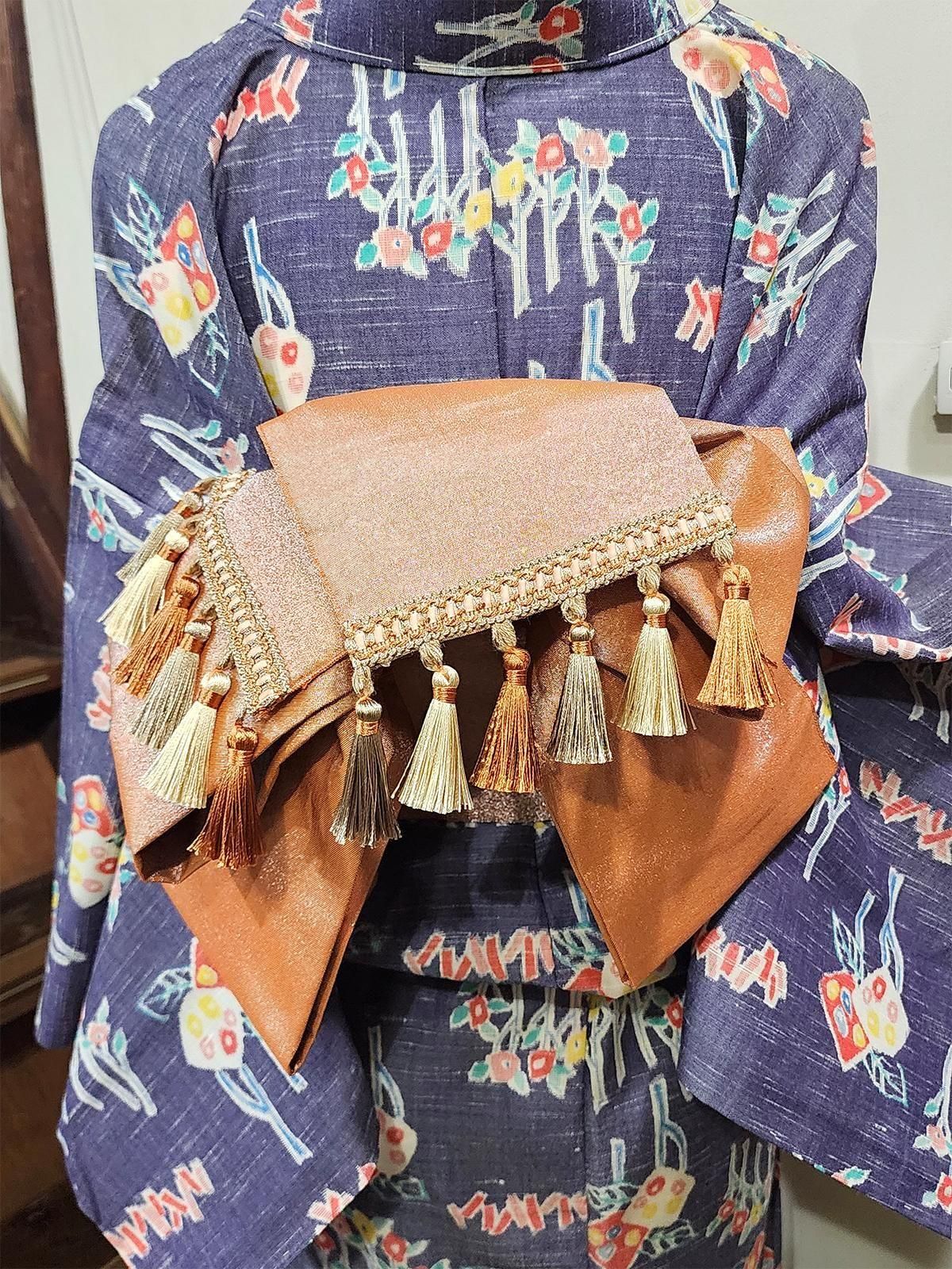- 着物の帯ならではのしっかりとした素材で、浴衣にもお着物にもマッチしてくれ、一年を通して楽しんでいただけ、特別な日も、ふだんの日も、装いにときめきを添えてくれます