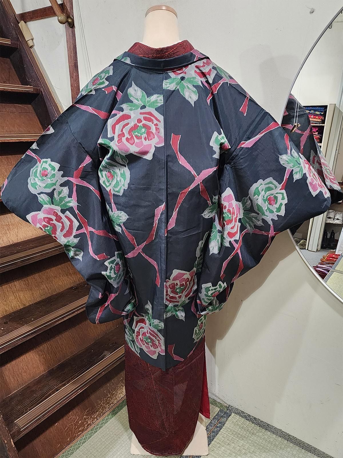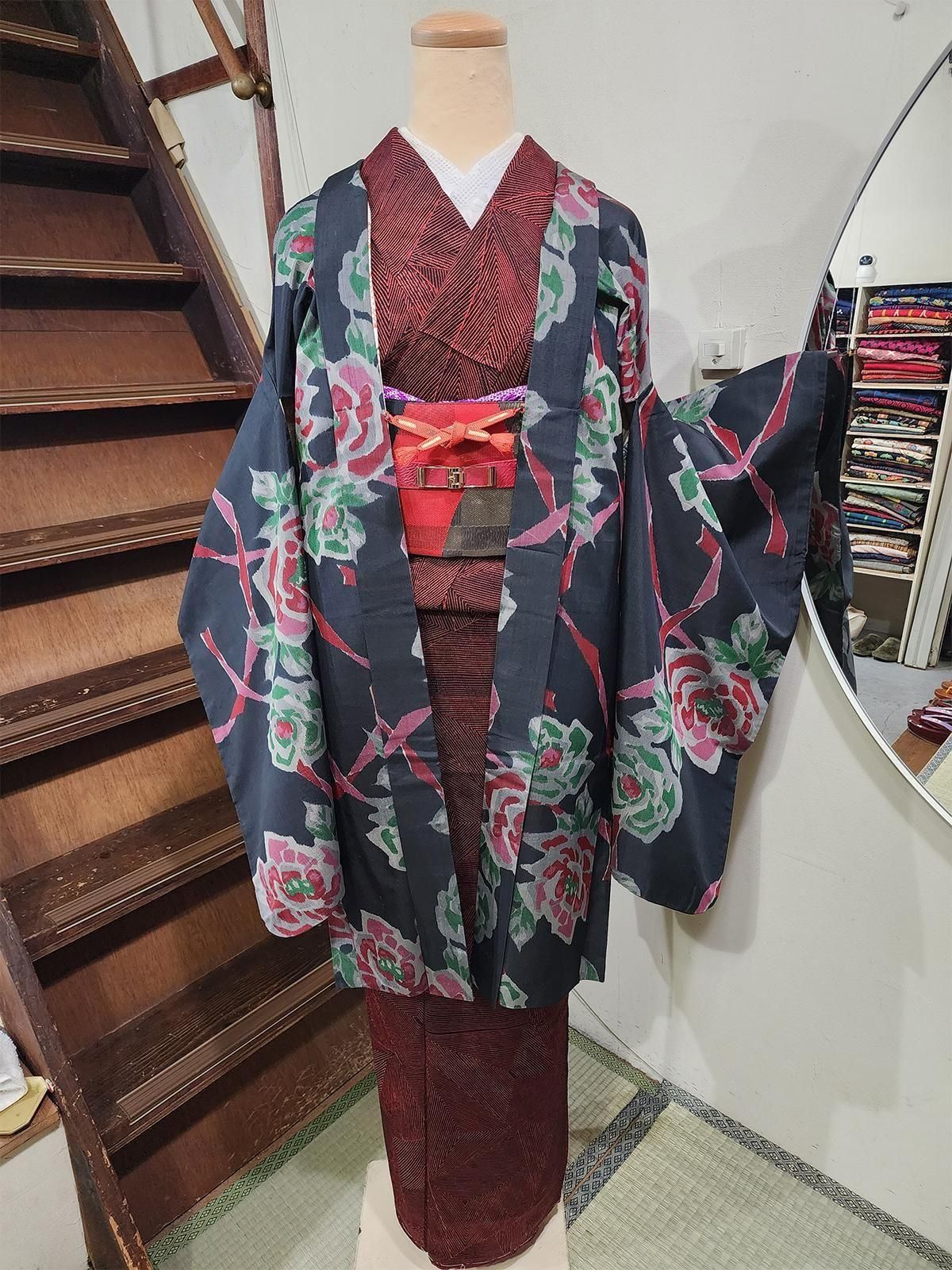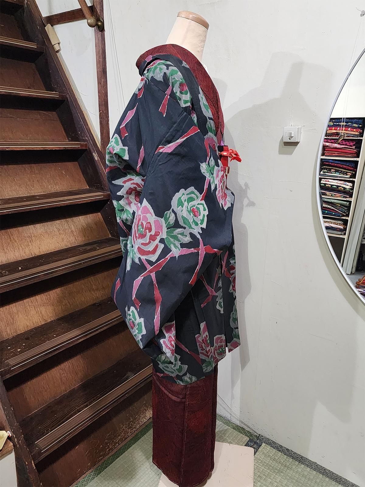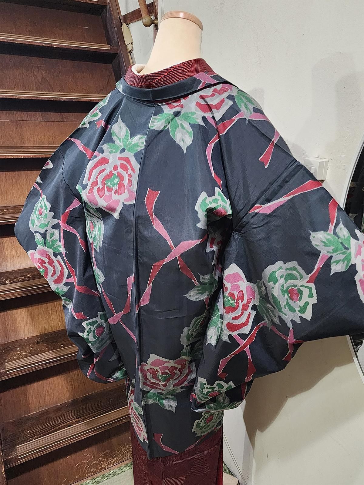 アッシュがかったブラックに咲く大輪の薔薇と、風にひらりと舞うようなローズ色のリボン。ノスタルジックな詩情とモードなセンスが重なるアンティーク銘仙の長羽織