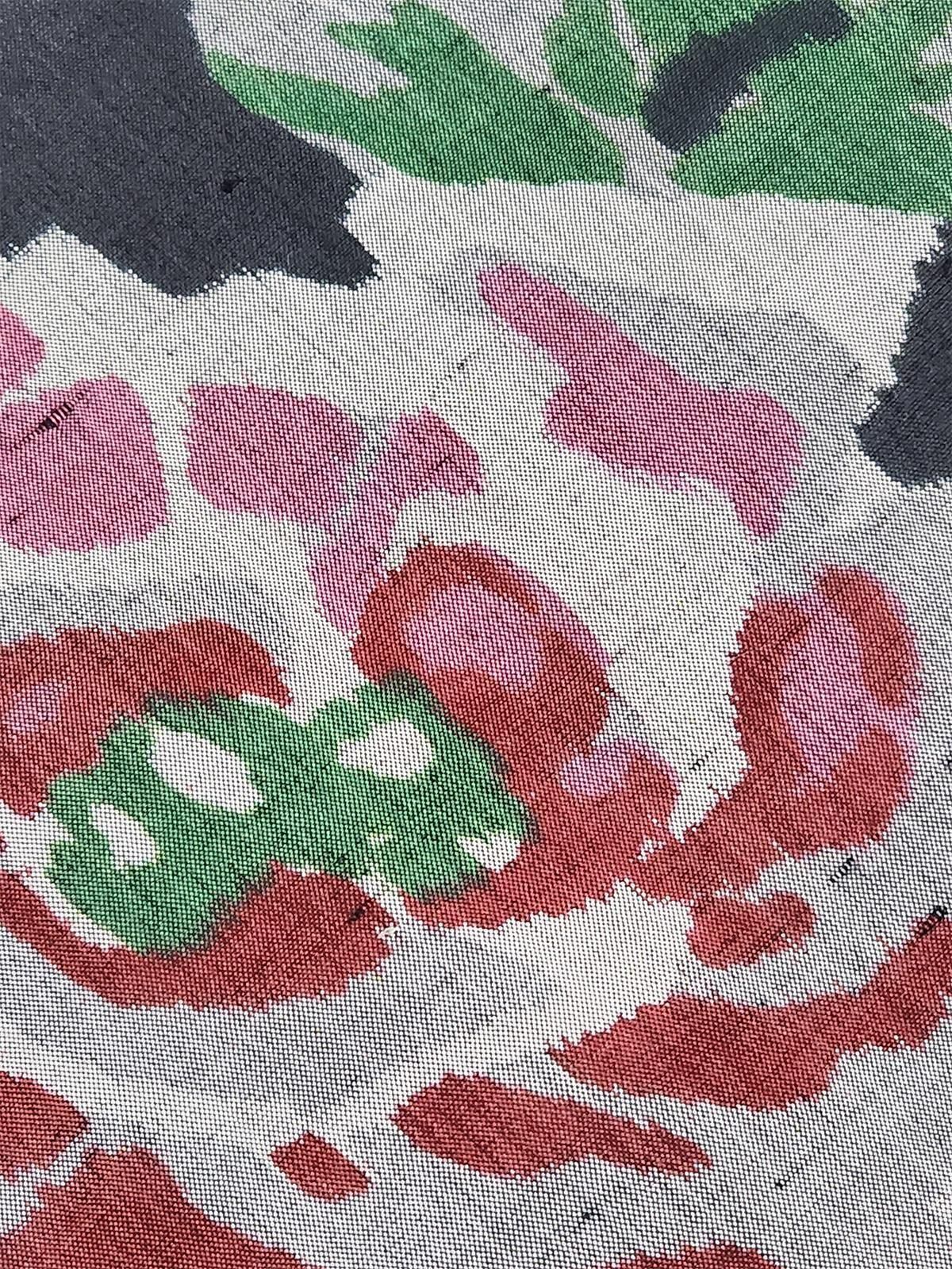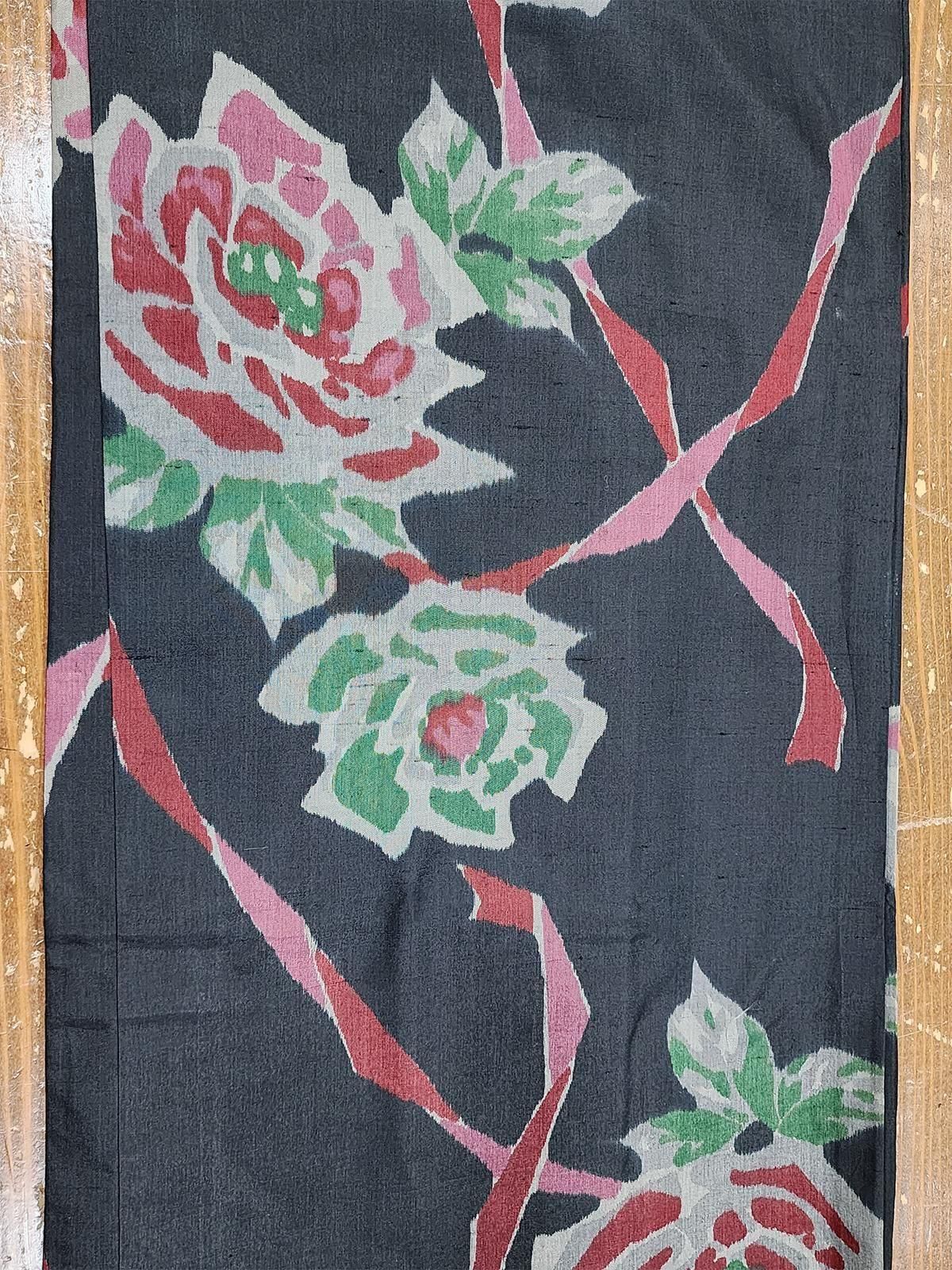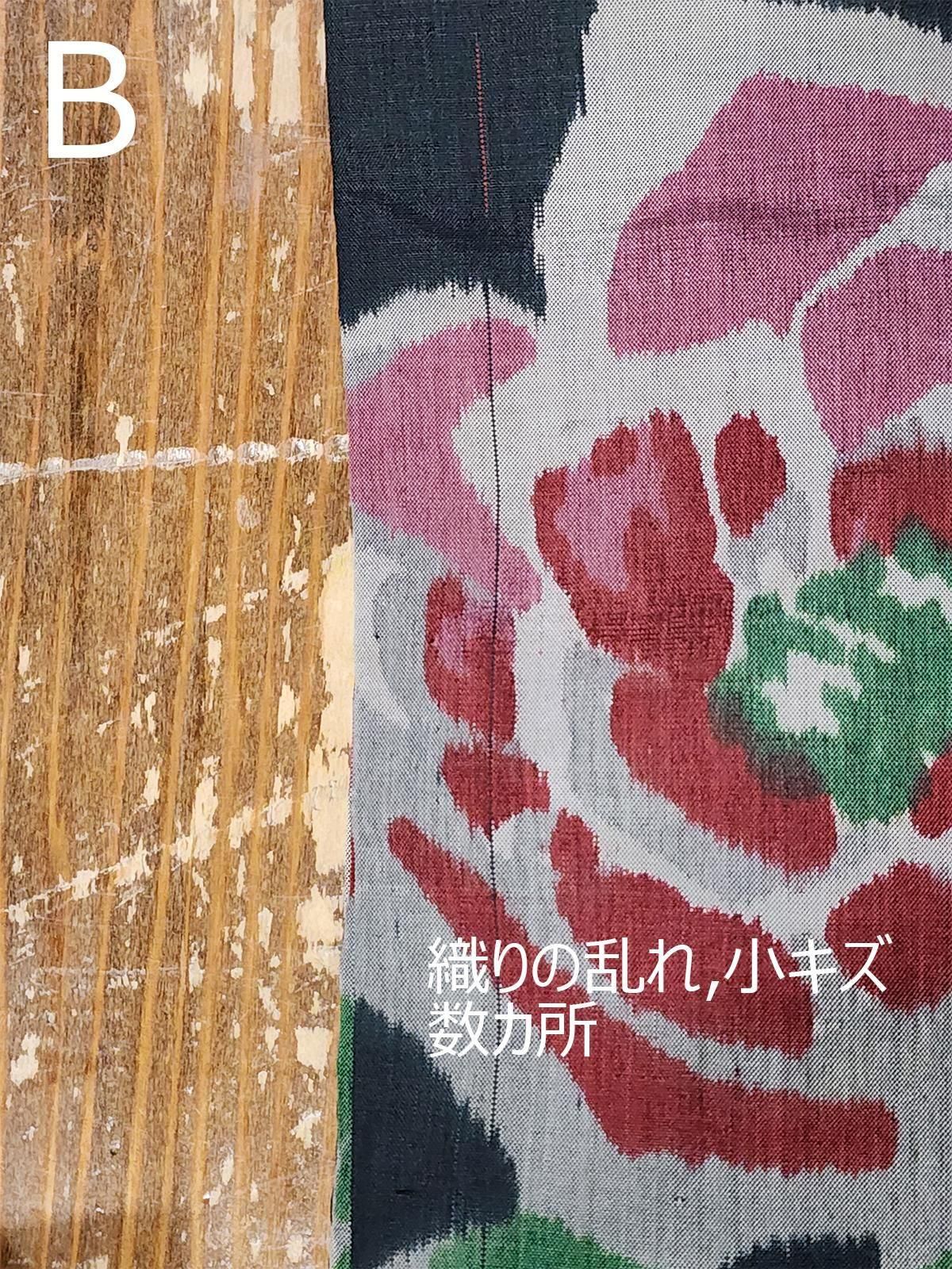 - デザイン:憂いをおびたアッシュブラックの地に、ルージュとスモークピンク、グリーンのカラーリング美しく織りだされたドラマチックな大輪の薔薇。ローズ色のリボンが空間をつなぎ、銘仙ならではのアートな遊び心を生み出します。