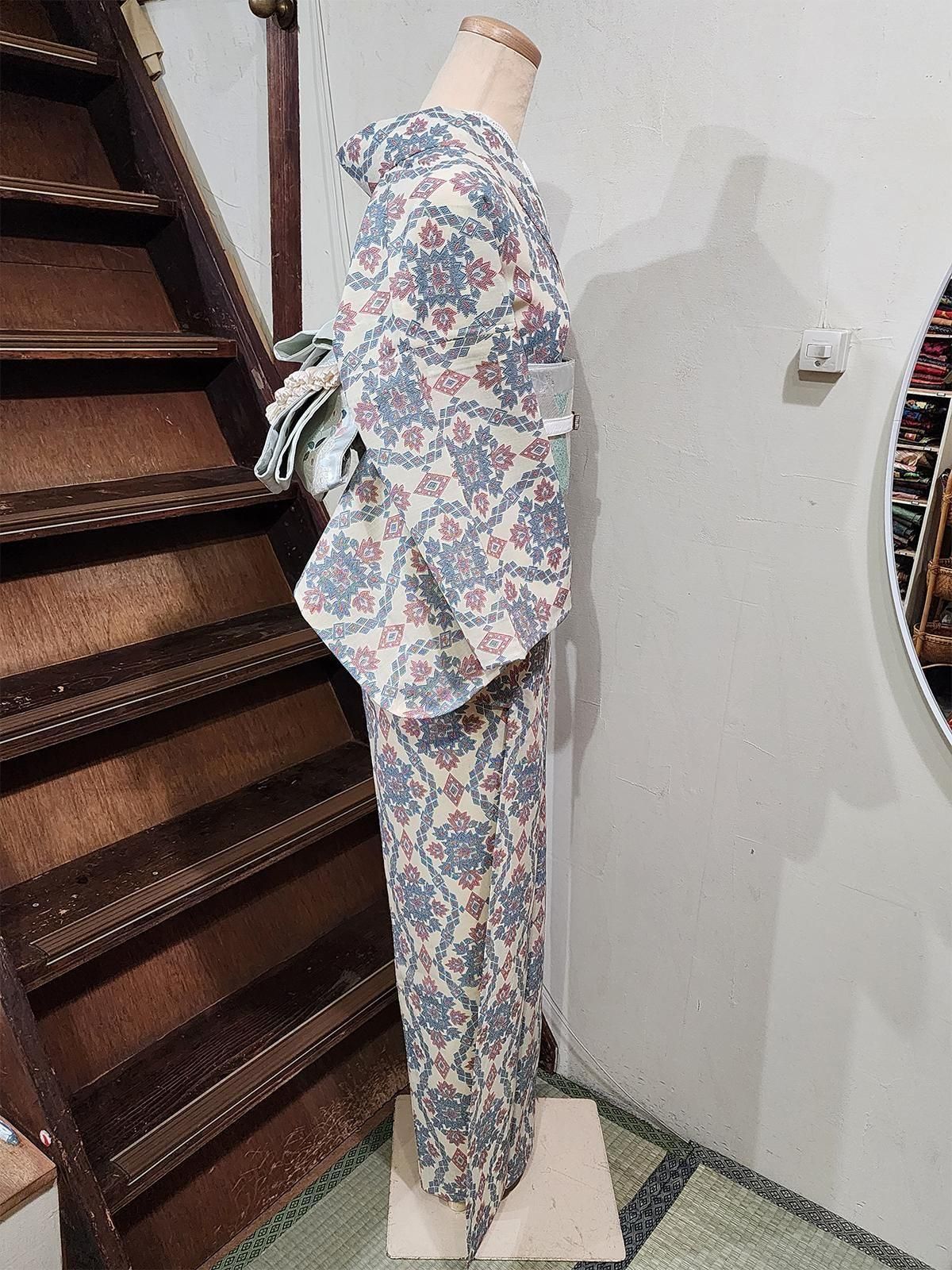 クリーム色地に雪の女王の物語のような装飾模様が染め出されたウール単着物