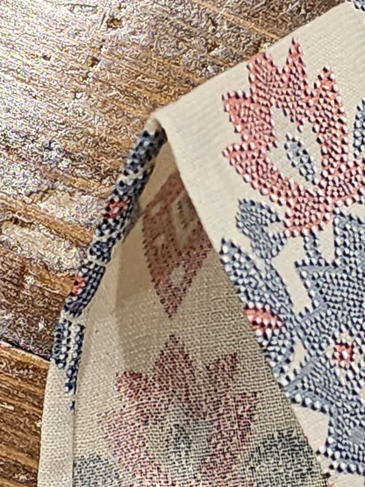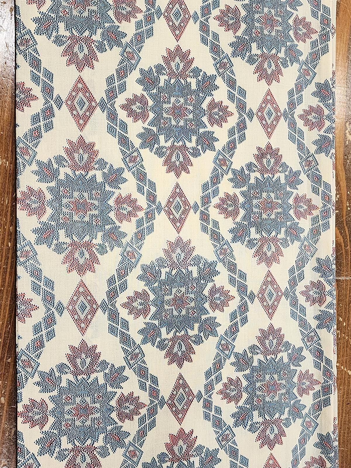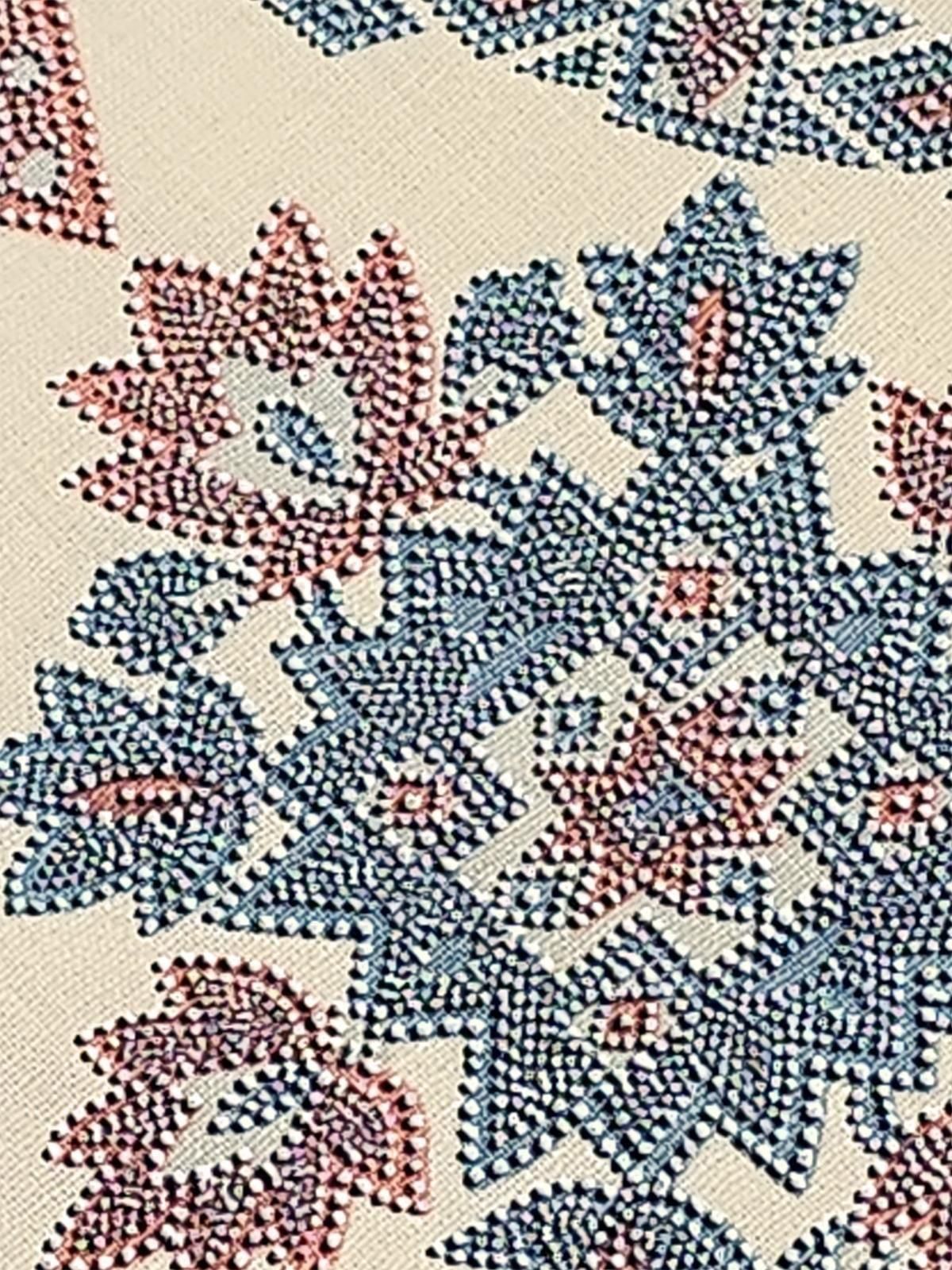 - 印象:クリーム色地に、淡いくすみブルーと優しいパウダリールージュが描き出す装飾模様に、繊細なドットが重なり、まるできらめくイルミネーションや光を透かす万華鏡がようなロマンチックな世界をつくりだします。ファンタジックな物語のような世界観と、フォークロアなぬくもりが調和した、優しく幻想的な印象の一枚です。