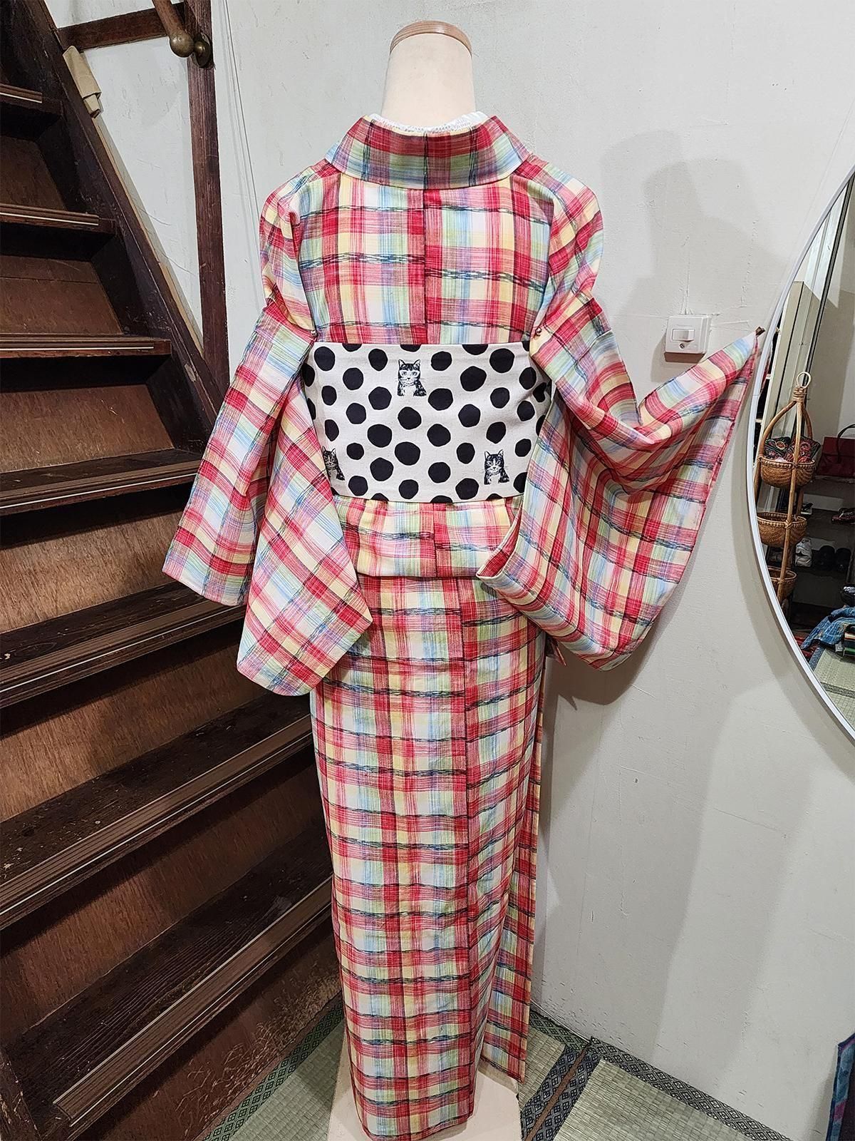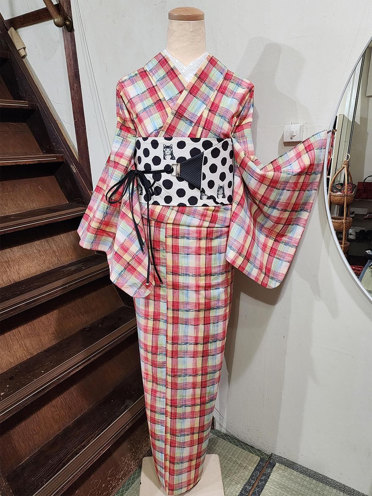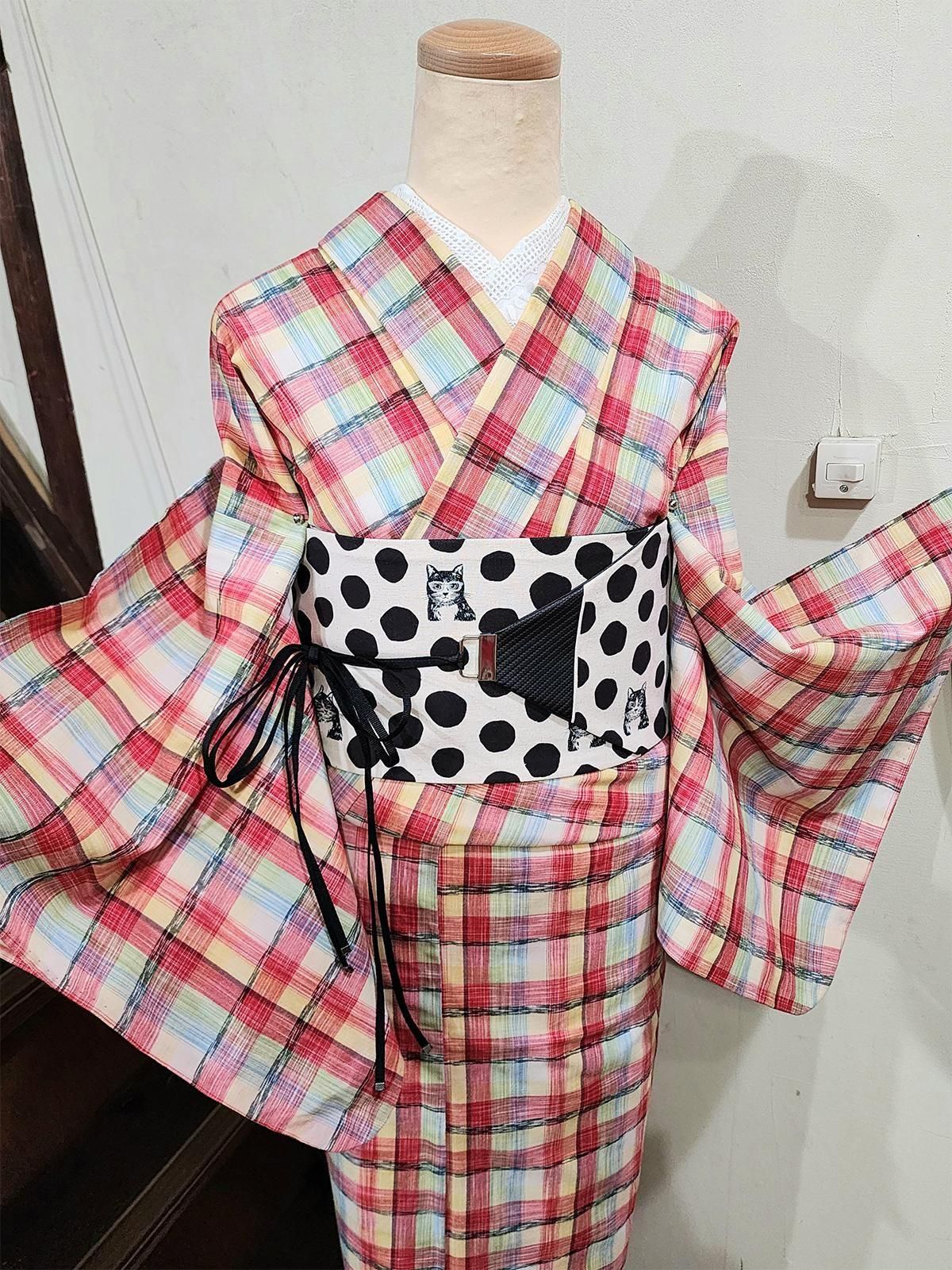 - コーデ提案: 水玉や猫柄など遊び心ある帯でレトロポップにしあげても、無地帯で大人っぽくしても素敵。マルチカラーのアイテムなので、柄色から一色とって帯をセレクトしたらまとまりよくきまります。キャップやハット、ブーツなどをあわせたミックスコーデも相性◎。