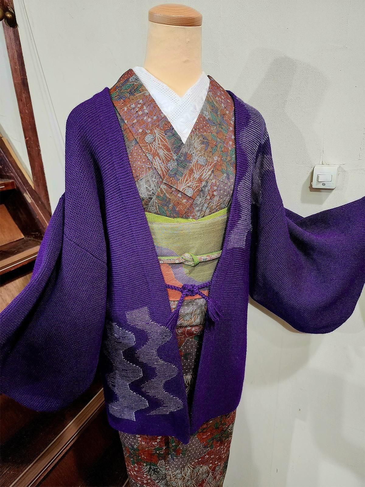 - コーデ提案:チェックやストライプ、水玉などのモダンデザインの着物にあわせてアートなコーデを楽しんでも素敵ですし、和の古典柄の着物にあわせても品よくきまる万能の一枚です。赤やオレンジ、イエローなどの暖色にも、青や紺などの寒色にもよくあい、緑や紫に重ねてもおしゃれにきまります。