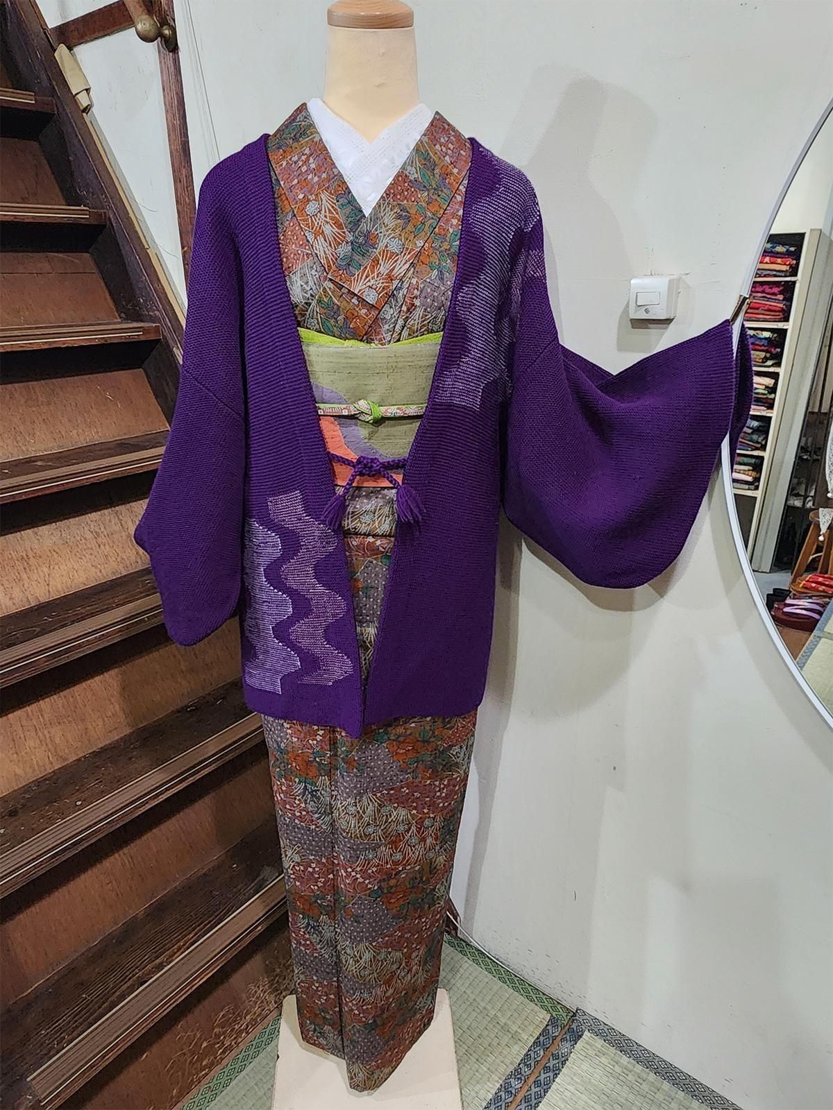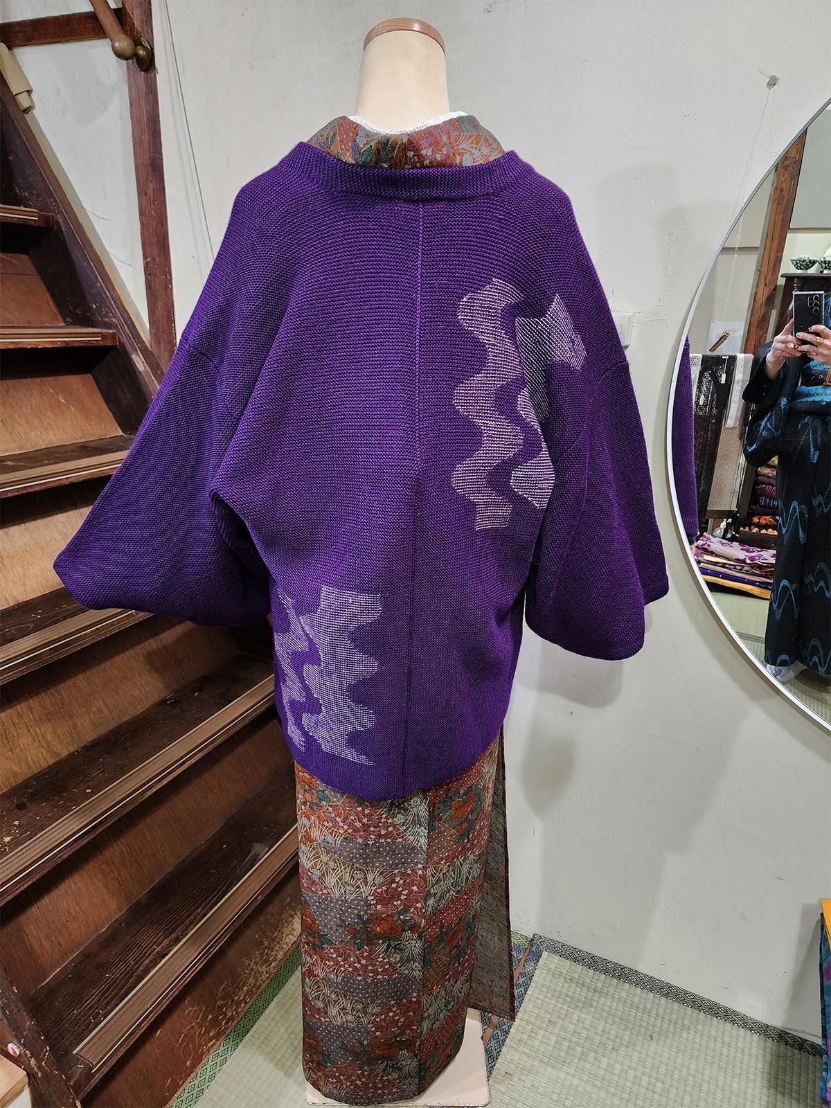 - 素材・着用感: あたたかなウール混紡と思われるニット素材。ふっくらとした風合いが心地よく、お着物用のアイテムならではのゆったりとしたシルエットで、お着物の上からもごわつかず快適に羽織れます。
