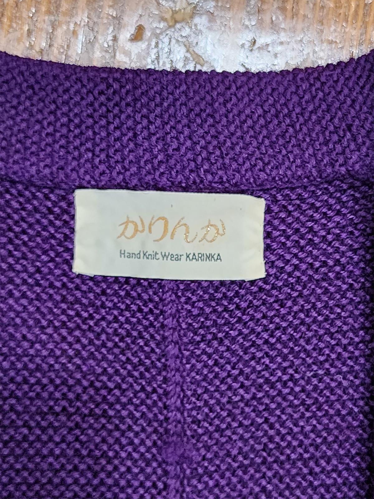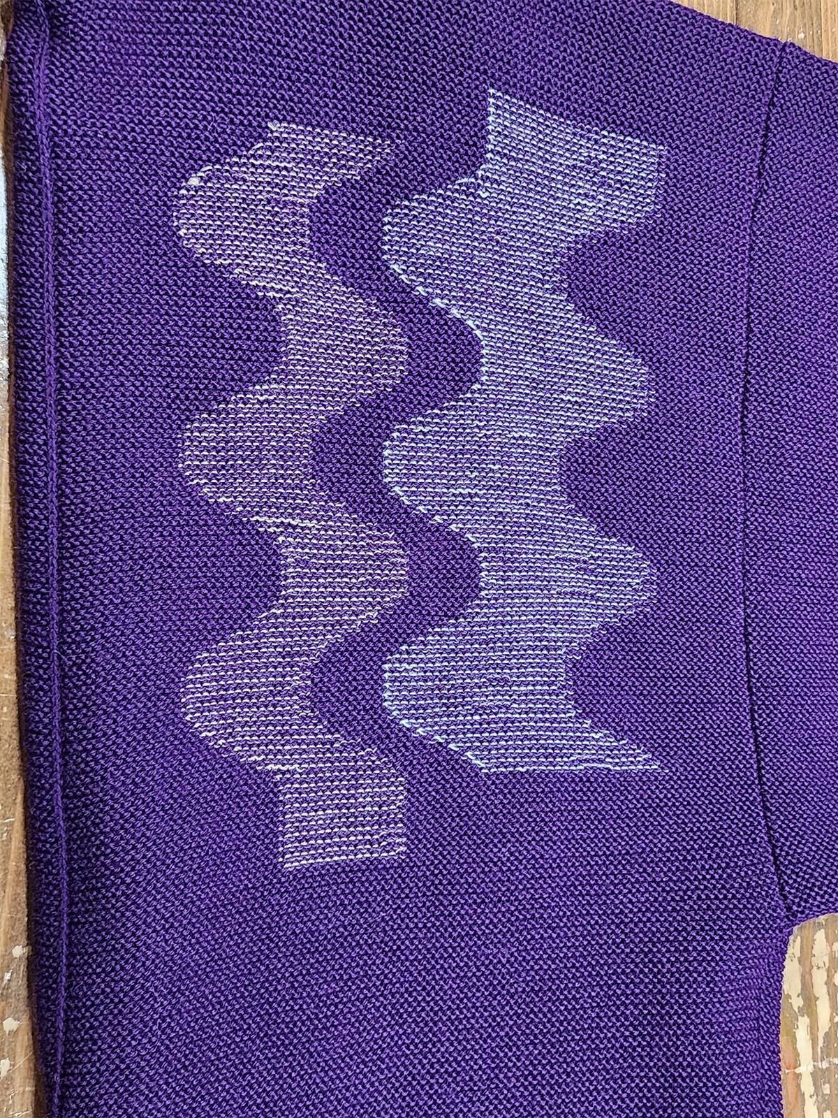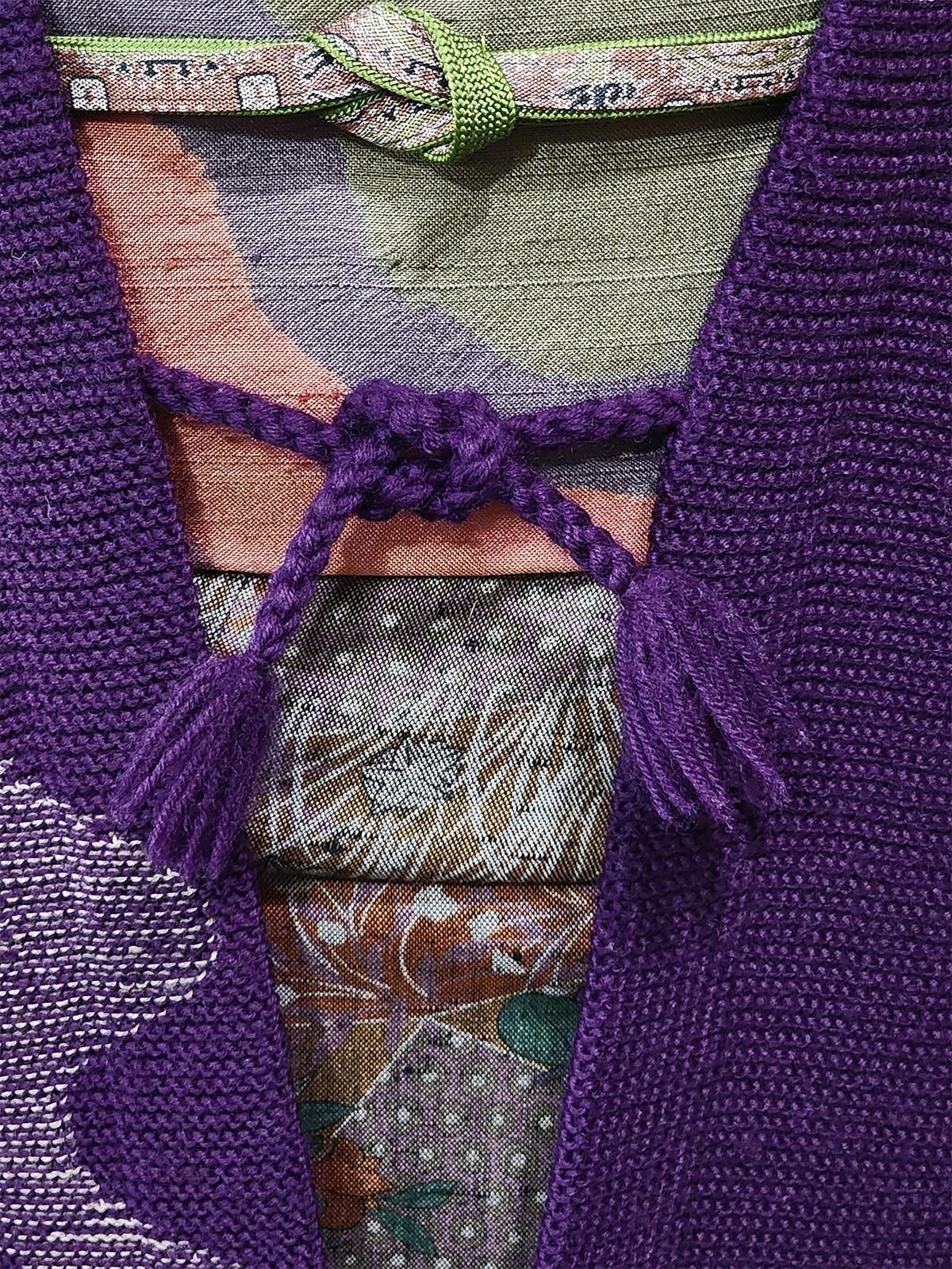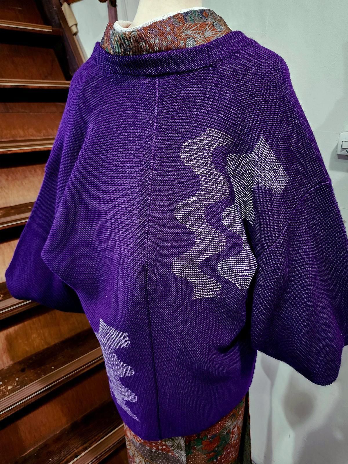 こっくりとした深い紫に、モダンアートのような抽象パターンがアクセントになった、カーディガン感覚で楽しめるニット羽織