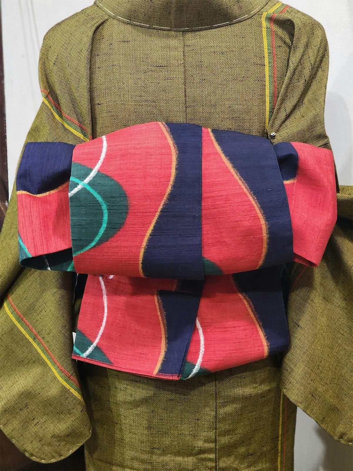 色と曲線のリズムで構成された抽象アートのようなモダンパターンが美しい正絹紬のロングサイズ・リファイン半幅帯