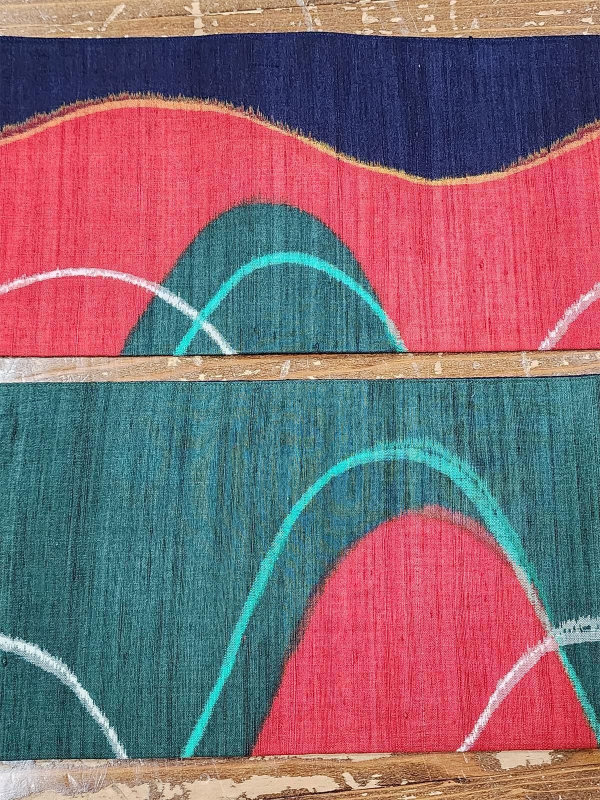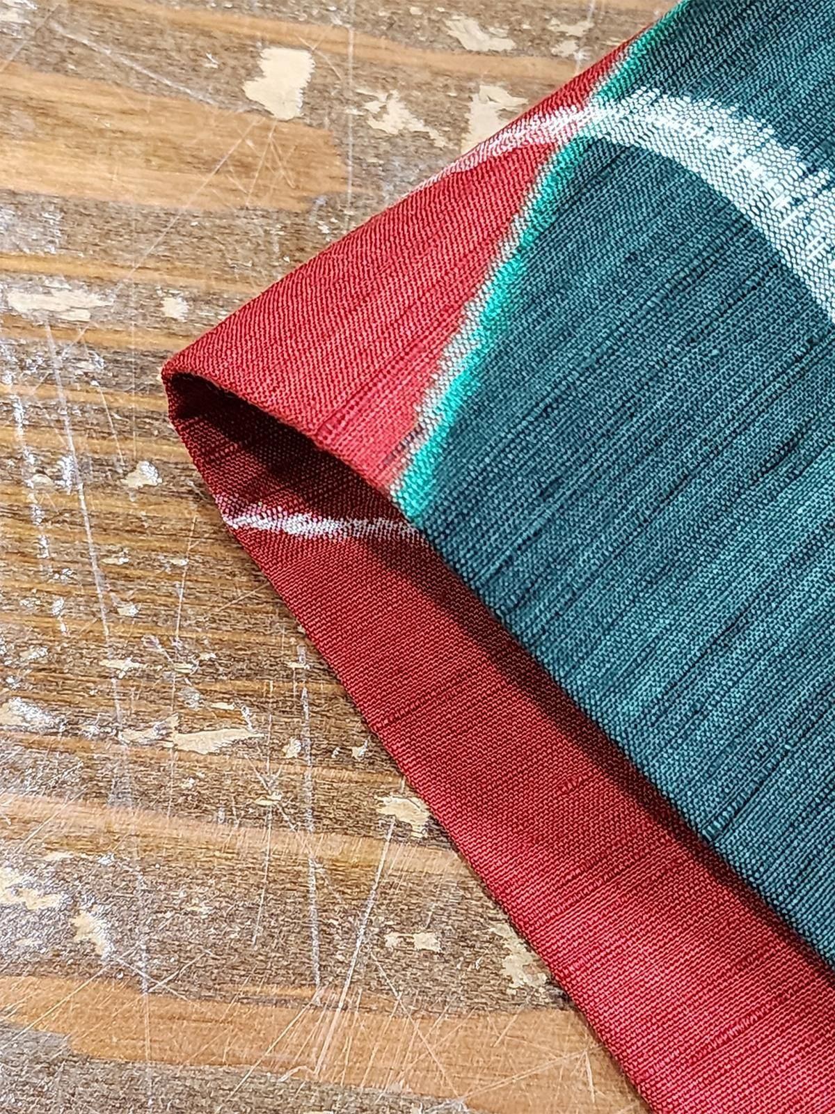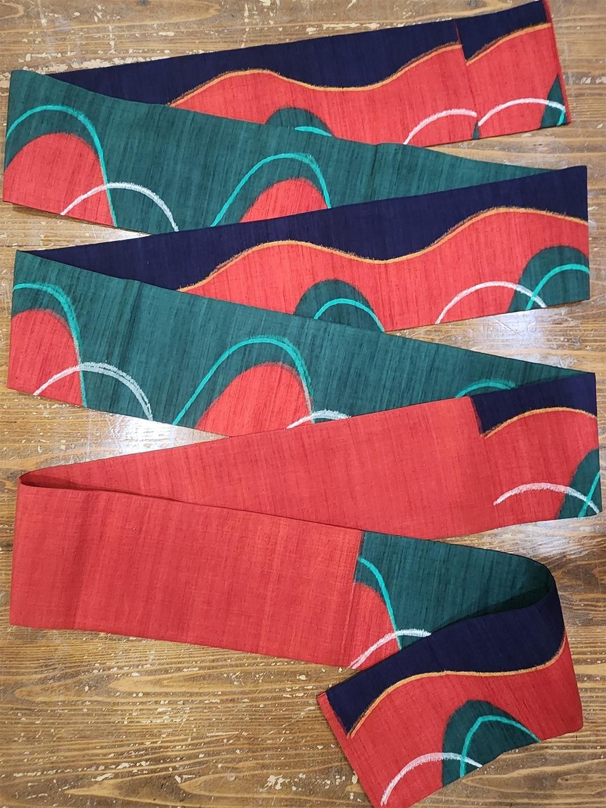 - デザイン: 朱赤・深緑・紺を美しい曲線で切り替え、ホワイトやミントの流線を重ねたアートな抽象パターン。裏表や場所によって赤・紺メイン/赤・緑メインと表情が変わり、結び方によって異なる表情を楽しんでいただけるリバーシブルの一本です。