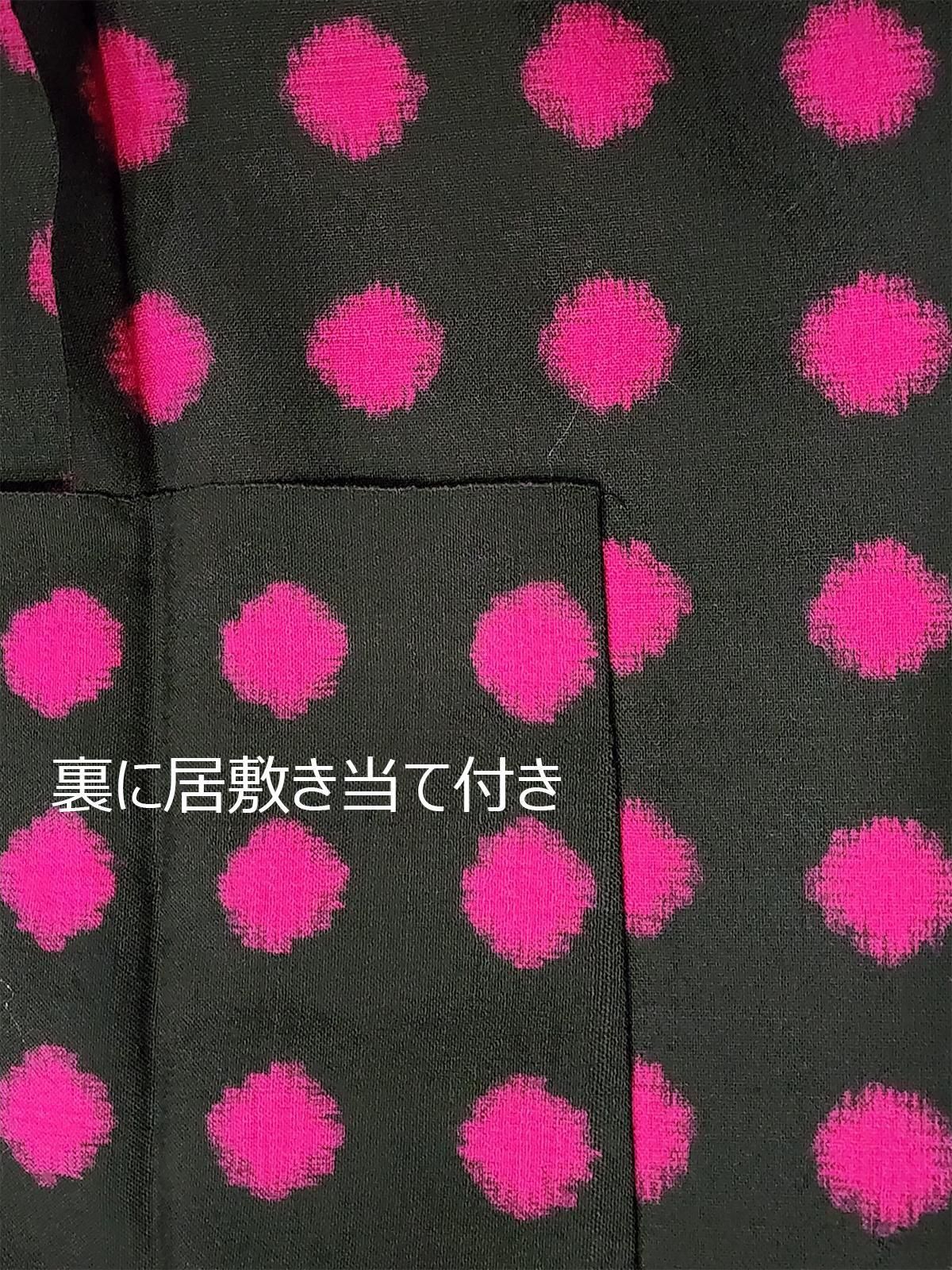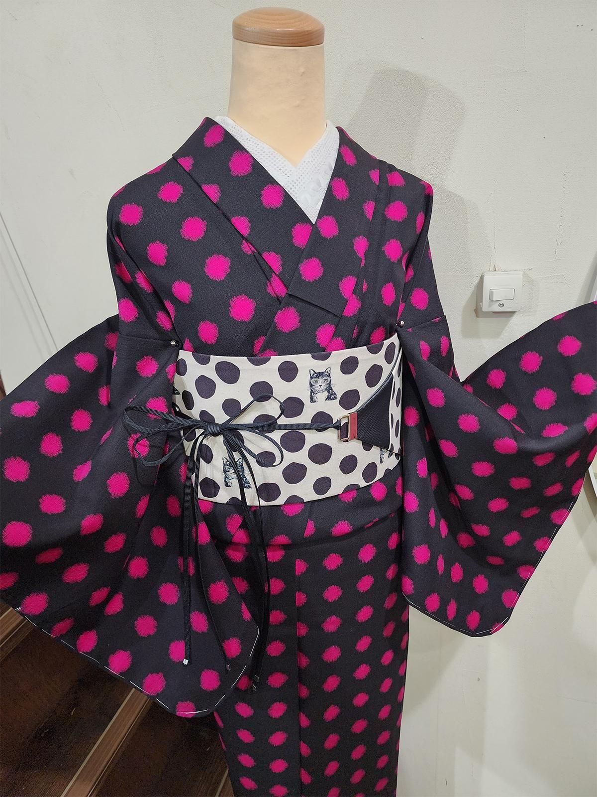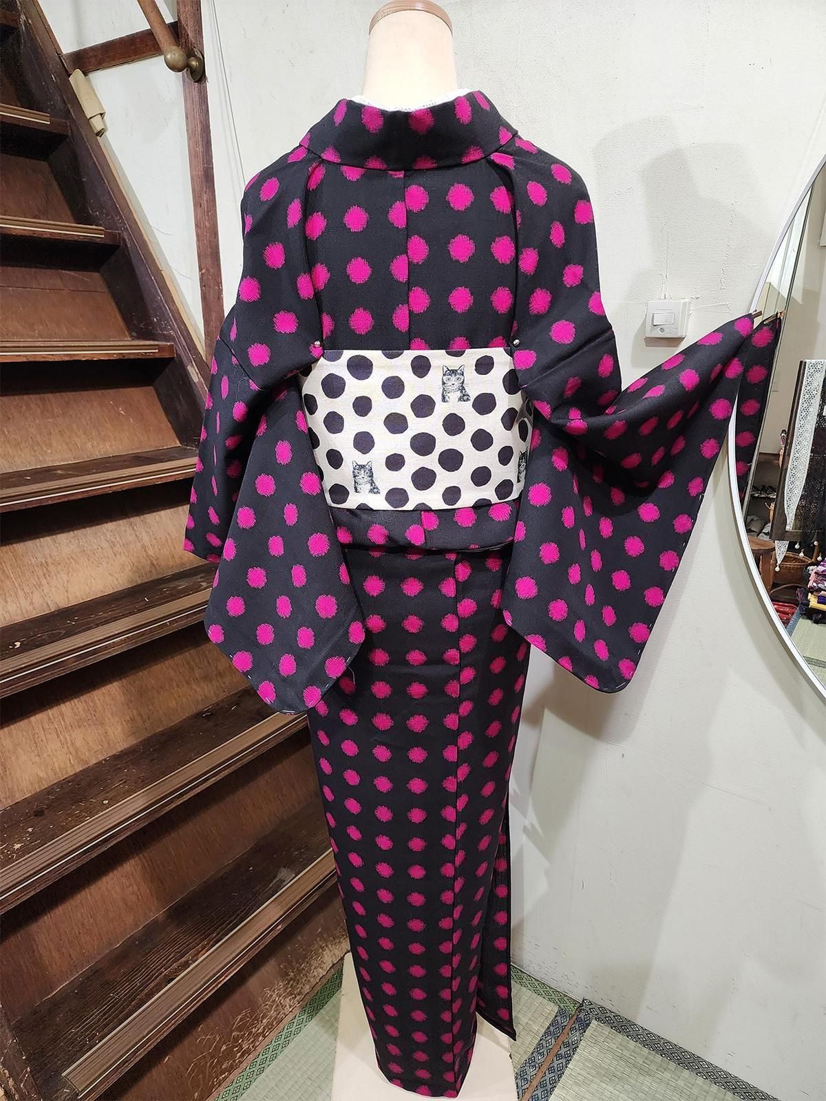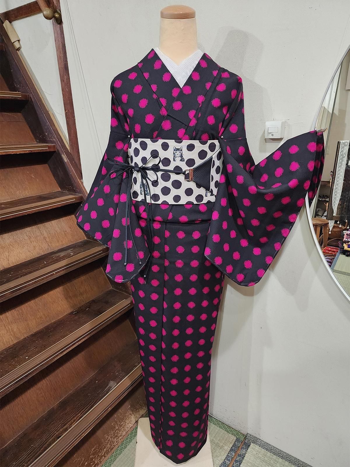 墨黒×フーシャピンクの大きめ水玉がモダンポップなウール単着物