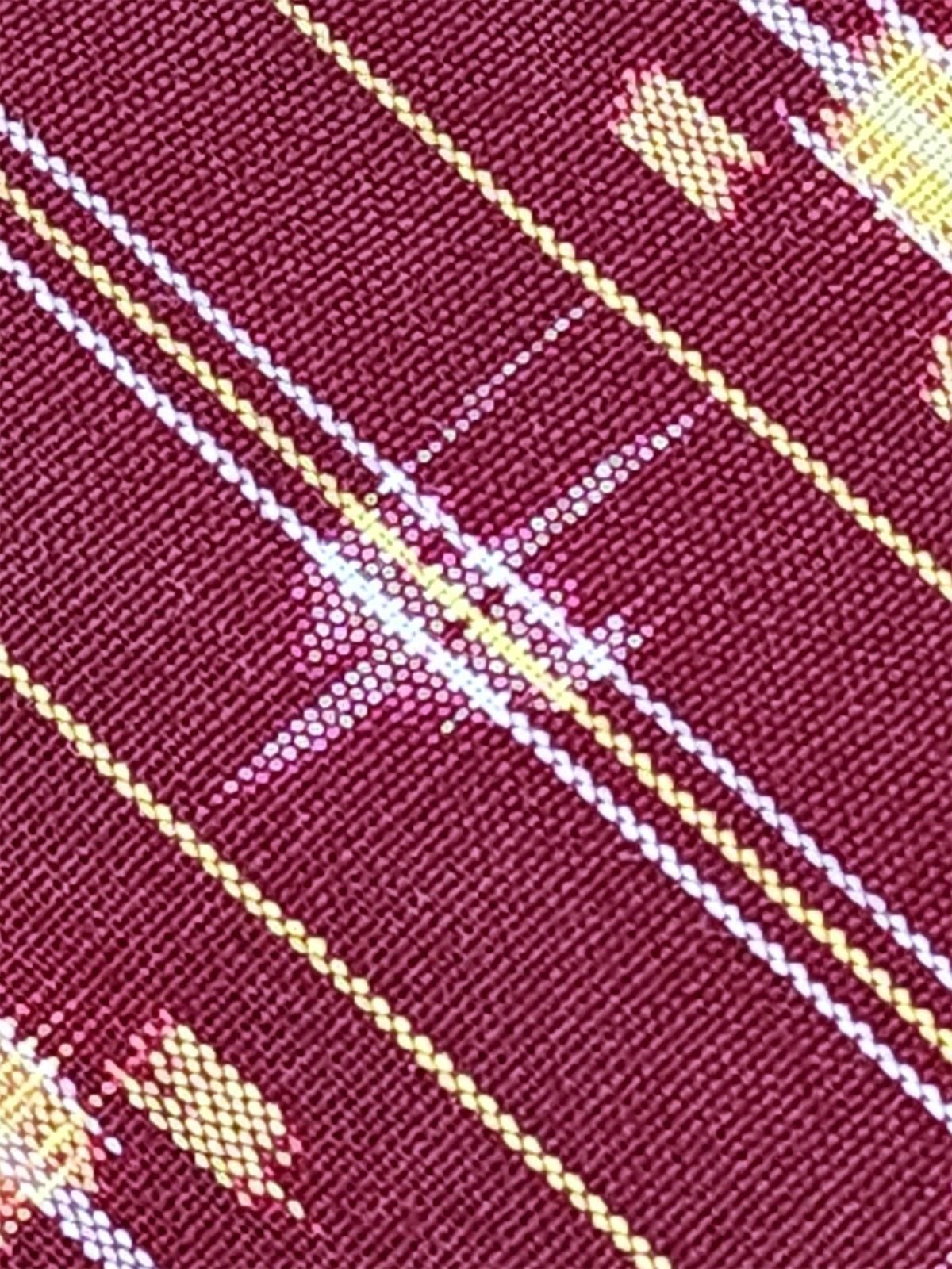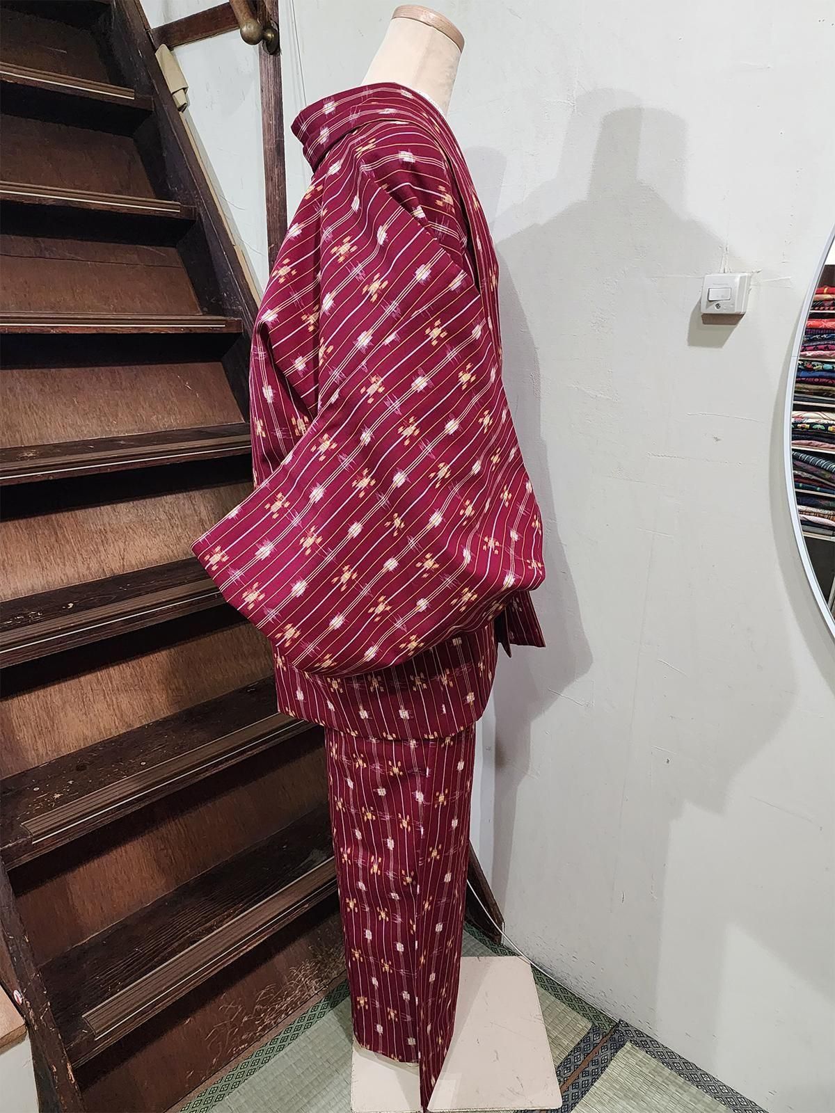 - デザイン: ボルドーをおびたような深みのあるブラウンに、洗練された縞がすっきりと走り、星や花、雪のようにも見える絣模様がリズミカルに重ねられたウールのアンサンブル(着物と羽織のセット)。