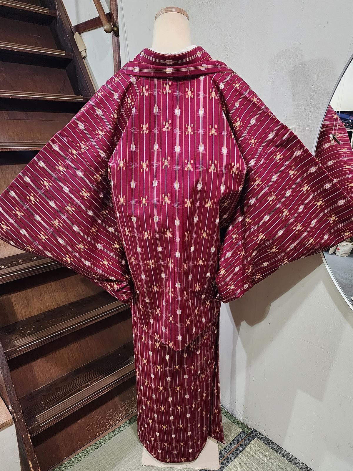マルーンブラウンに、端正な縞と軽やかな絣模様が織りだされたウールのアンサンブル(着物+羽織)