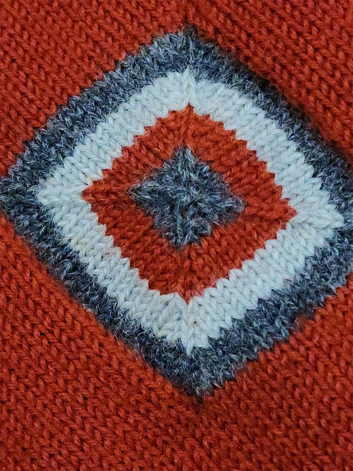 テラコッタのようなブラウンルージュにミッドセンチュリーなスクエアモチーフが遊ぶカーディガンみたいなニット羽織