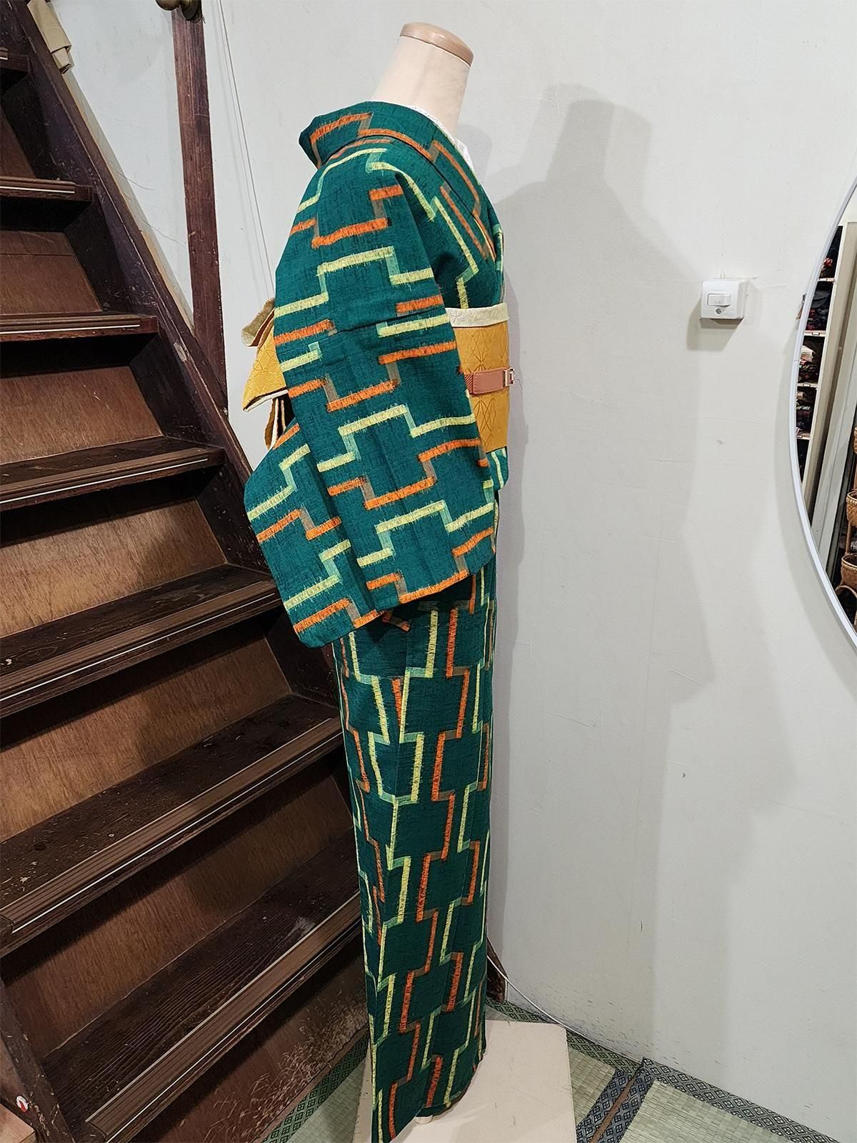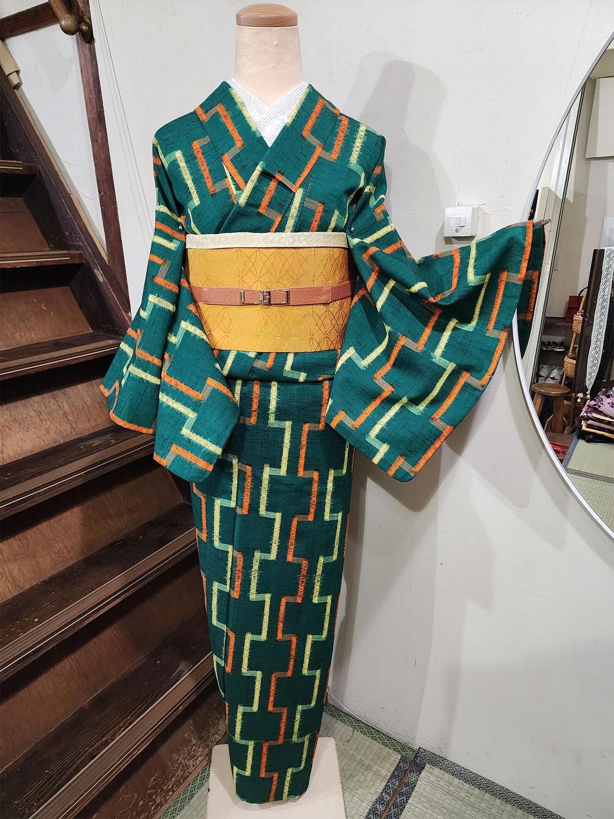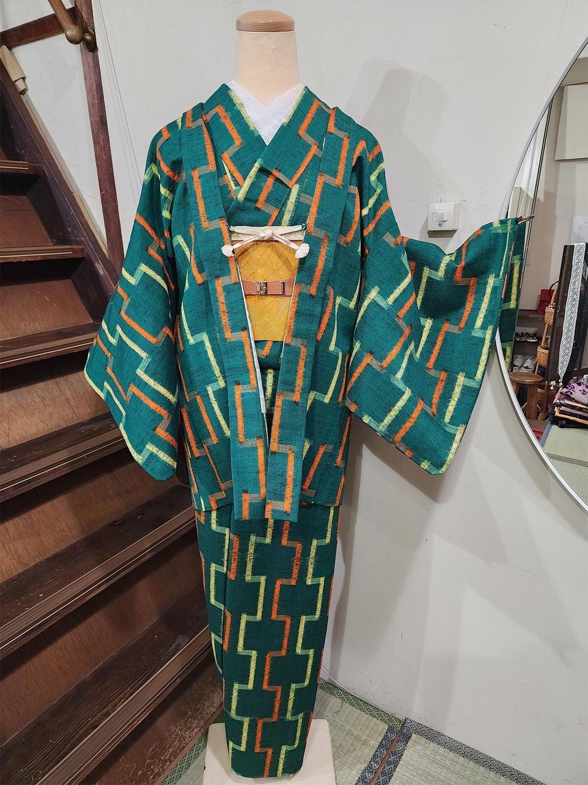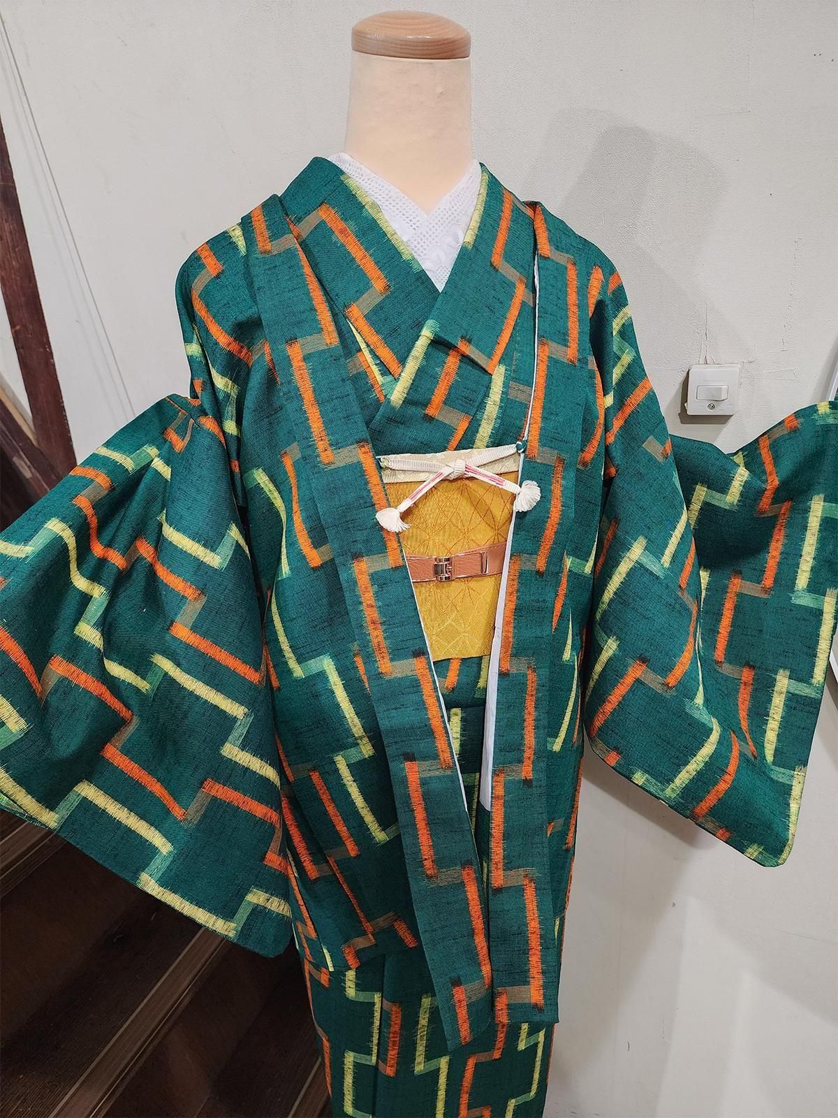 深いグリーンにイエロー×オレンジの幾何柄が映えるモダンでアートなウールのアンサンブル(着物+羽織のセット)