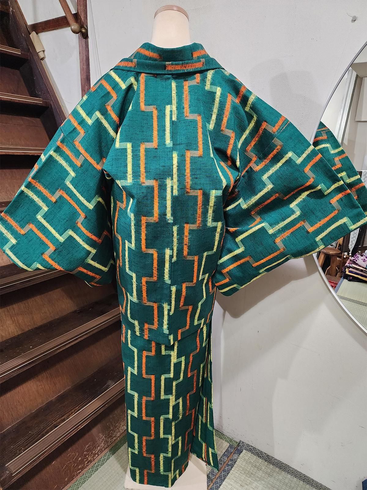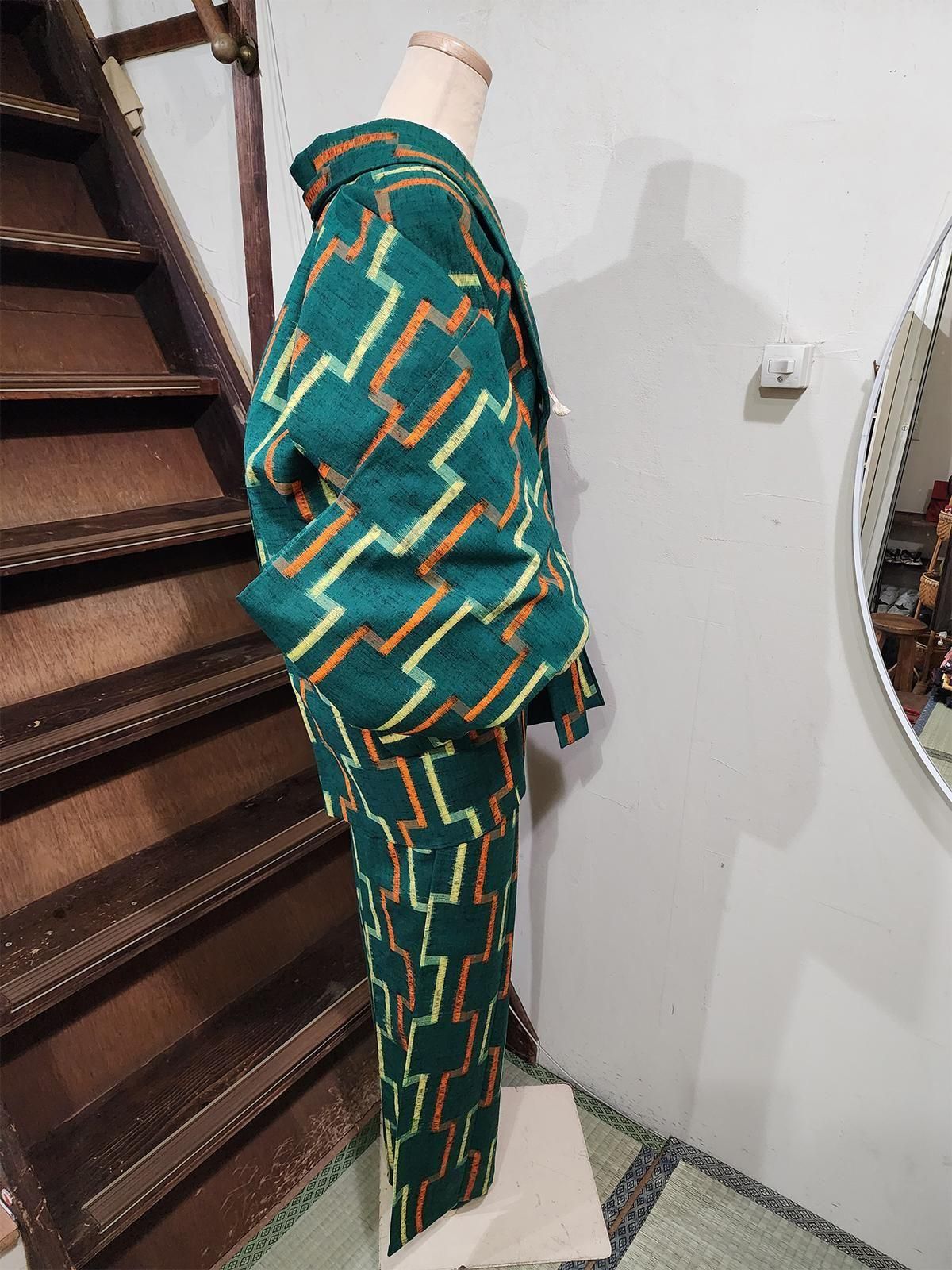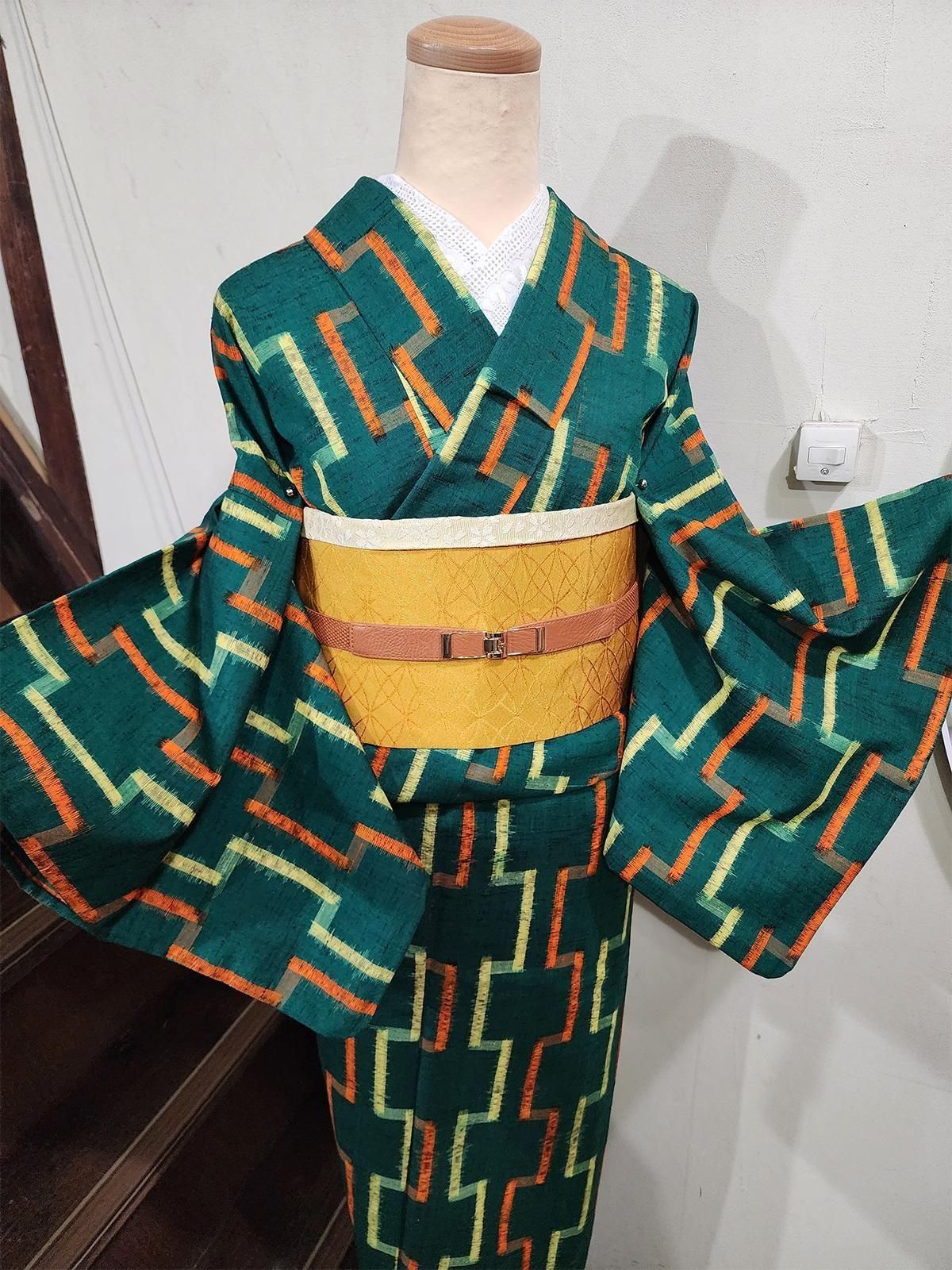 深いグリーンにイエロー×オレンジの幾何柄が映えるモダンでアートなウールのアンサンブル(着物+羽織のセット)