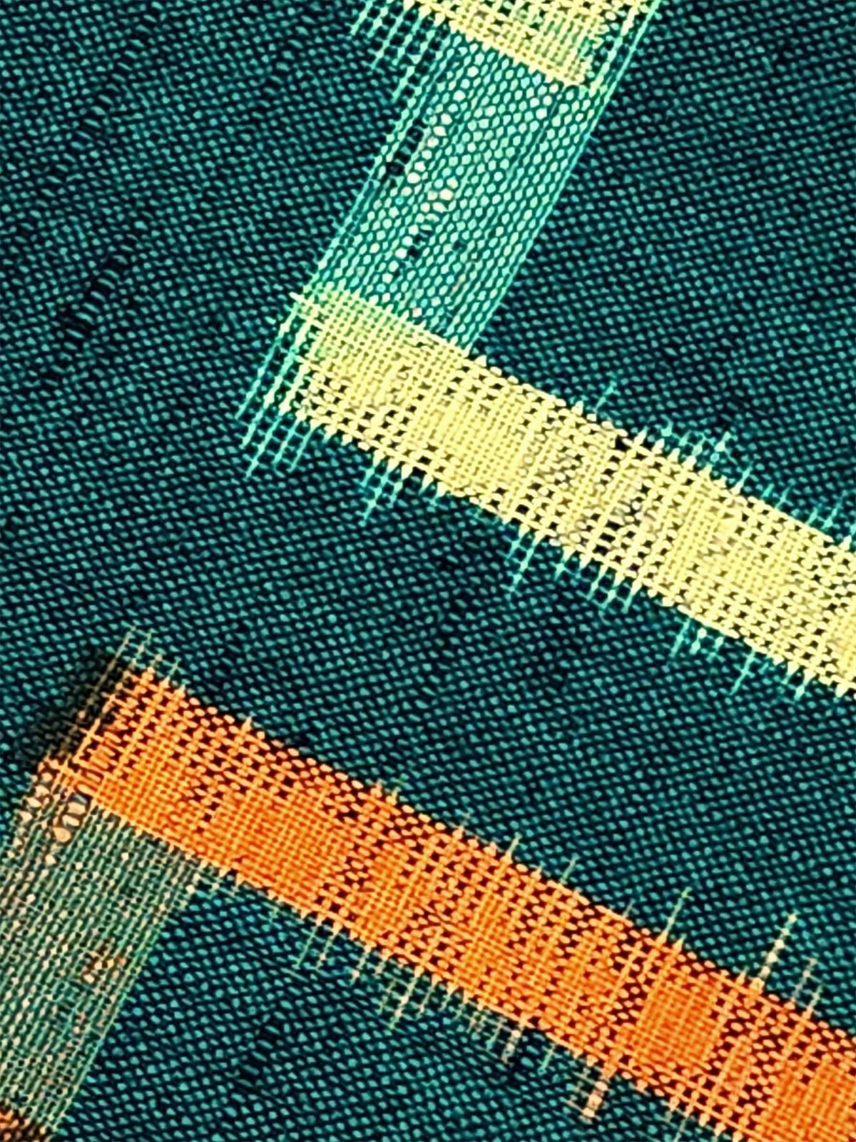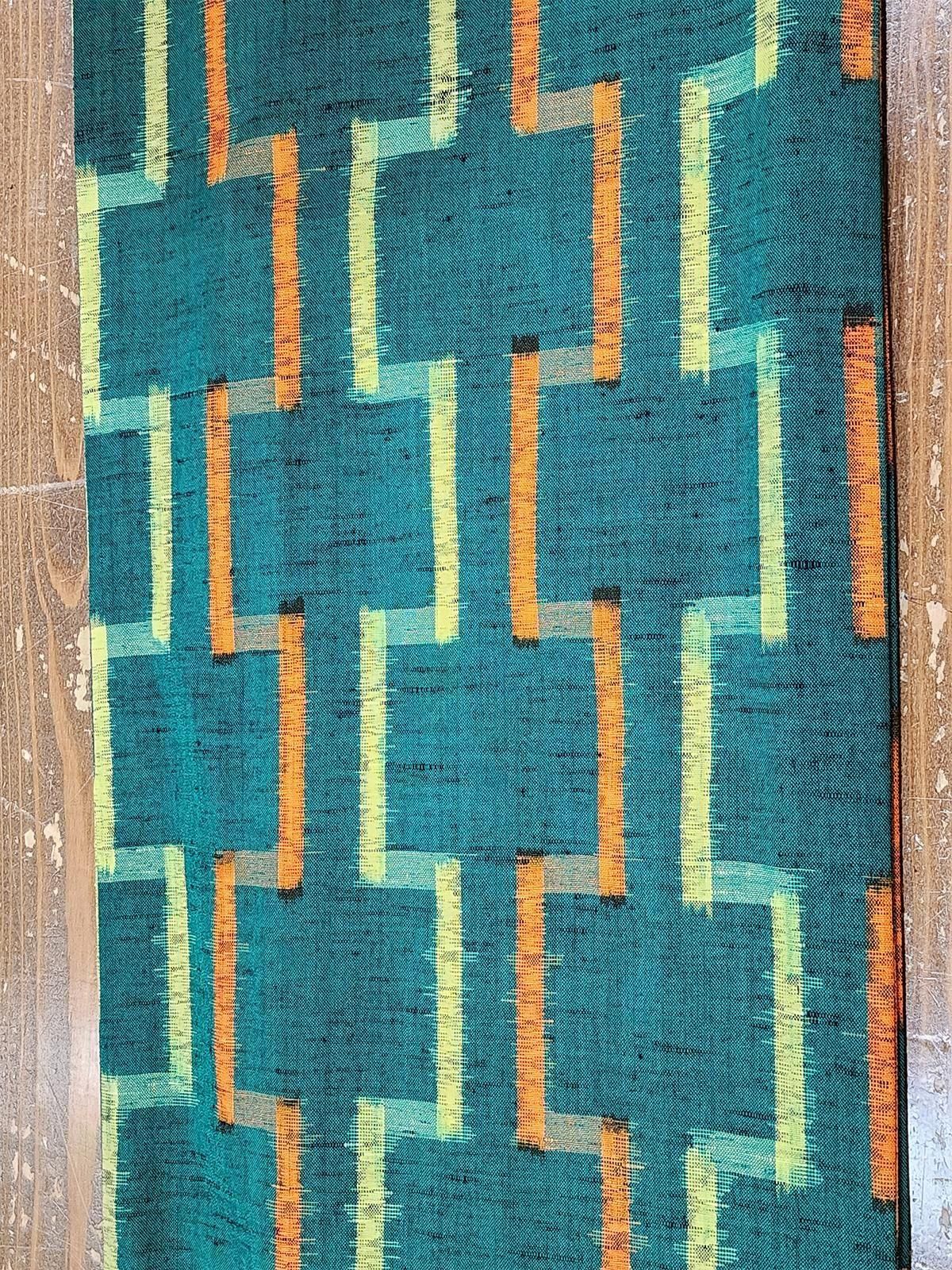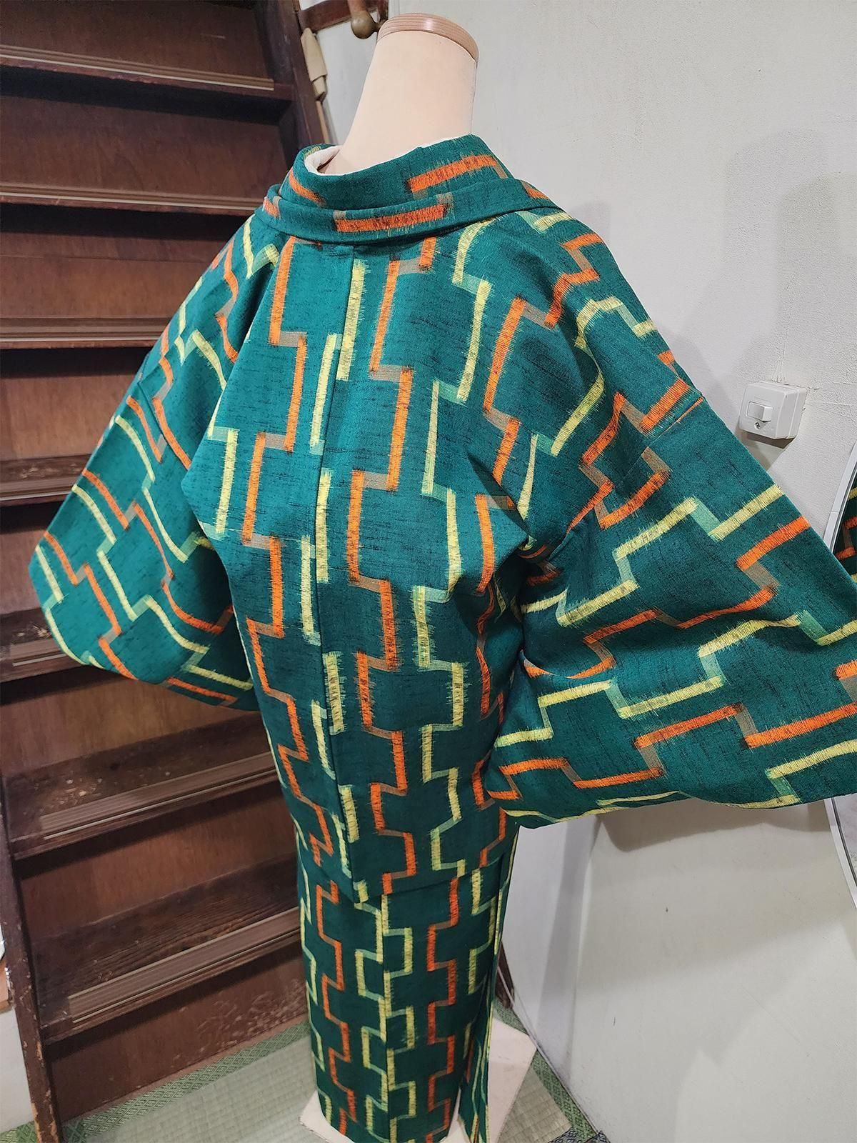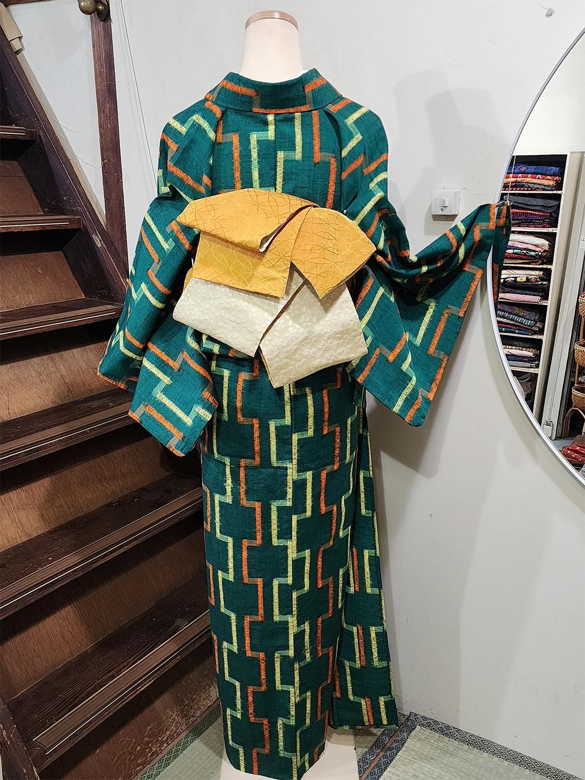 深いグリーンにイエロー×オレンジの幾何柄が映えるモダンでアートなウールのアンサンブル(着物+羽織のセット)