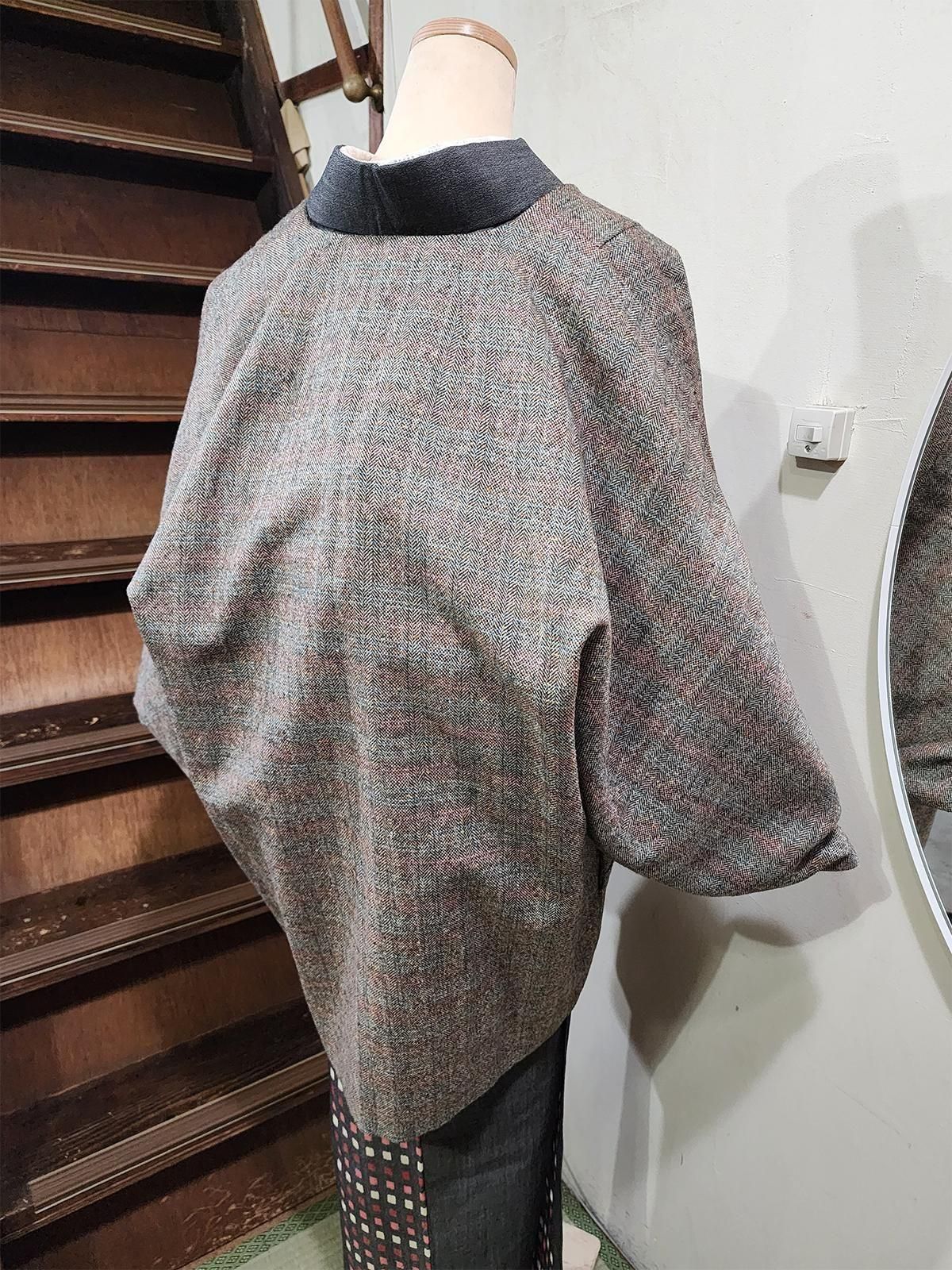 - 印象: 柔らかく落ち着いた色調に、ほんのりとした差し色が奥行きを添え、クラシカルで上品な雰囲気に。すっきりとしたノーカラーの衿がシルエットの完成された美しさをひきたたせて、シンプルすぎず個性的すぎないバランスで、普段着にもお出かけにも使いやすい大人のニュアンスが漂います。