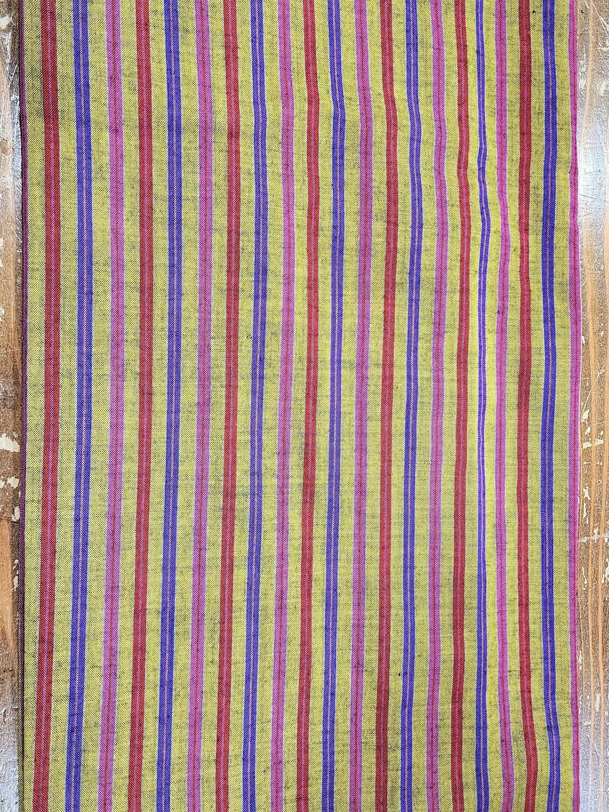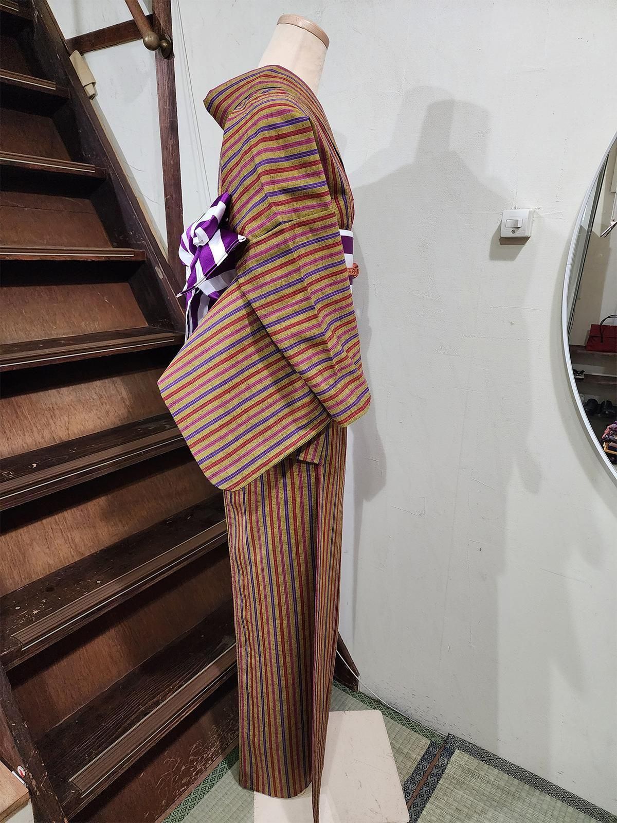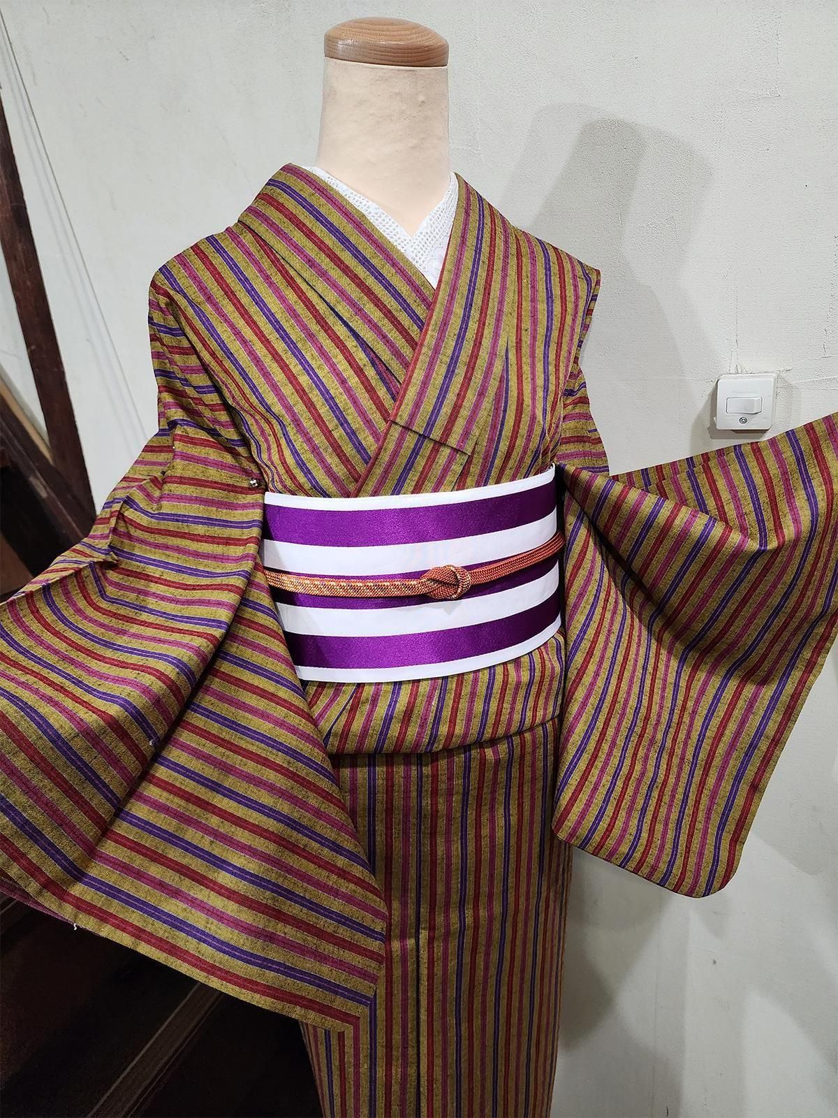 マスタードイエローに葡萄のようなスモークパープル、木苺みたいなピンク、ルージュレッドのストライプが織りだされた単着物
