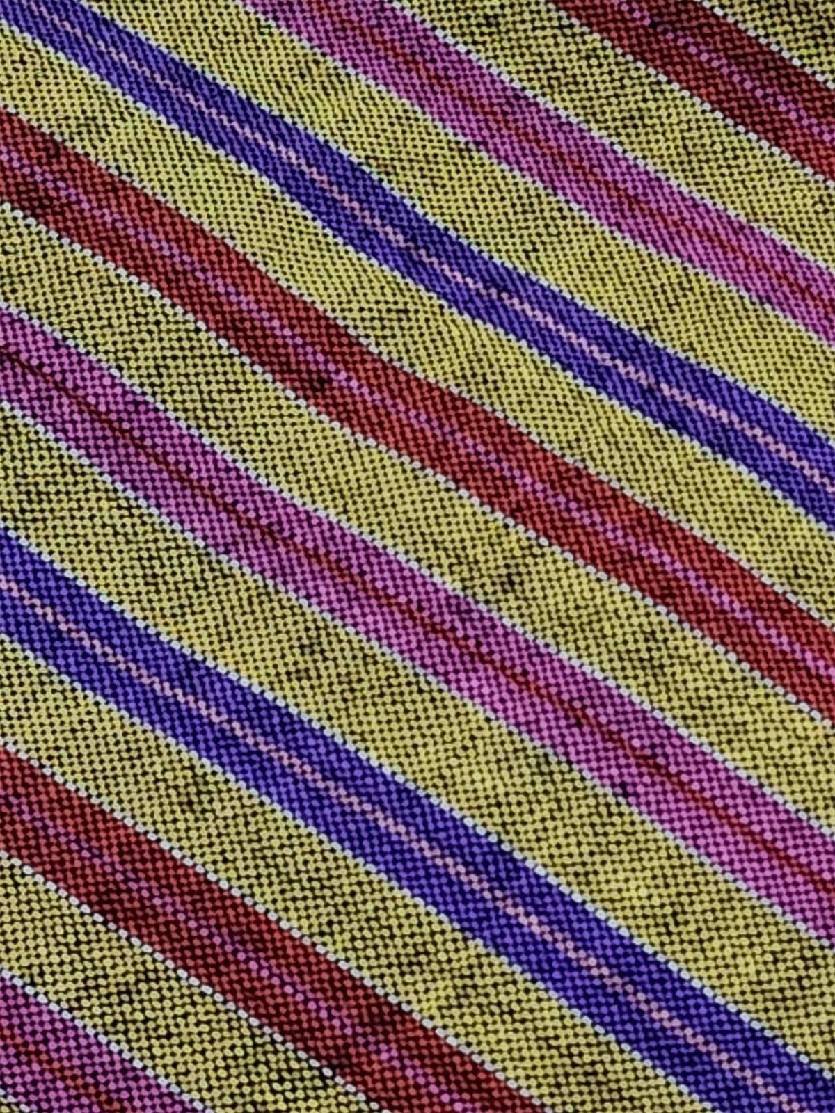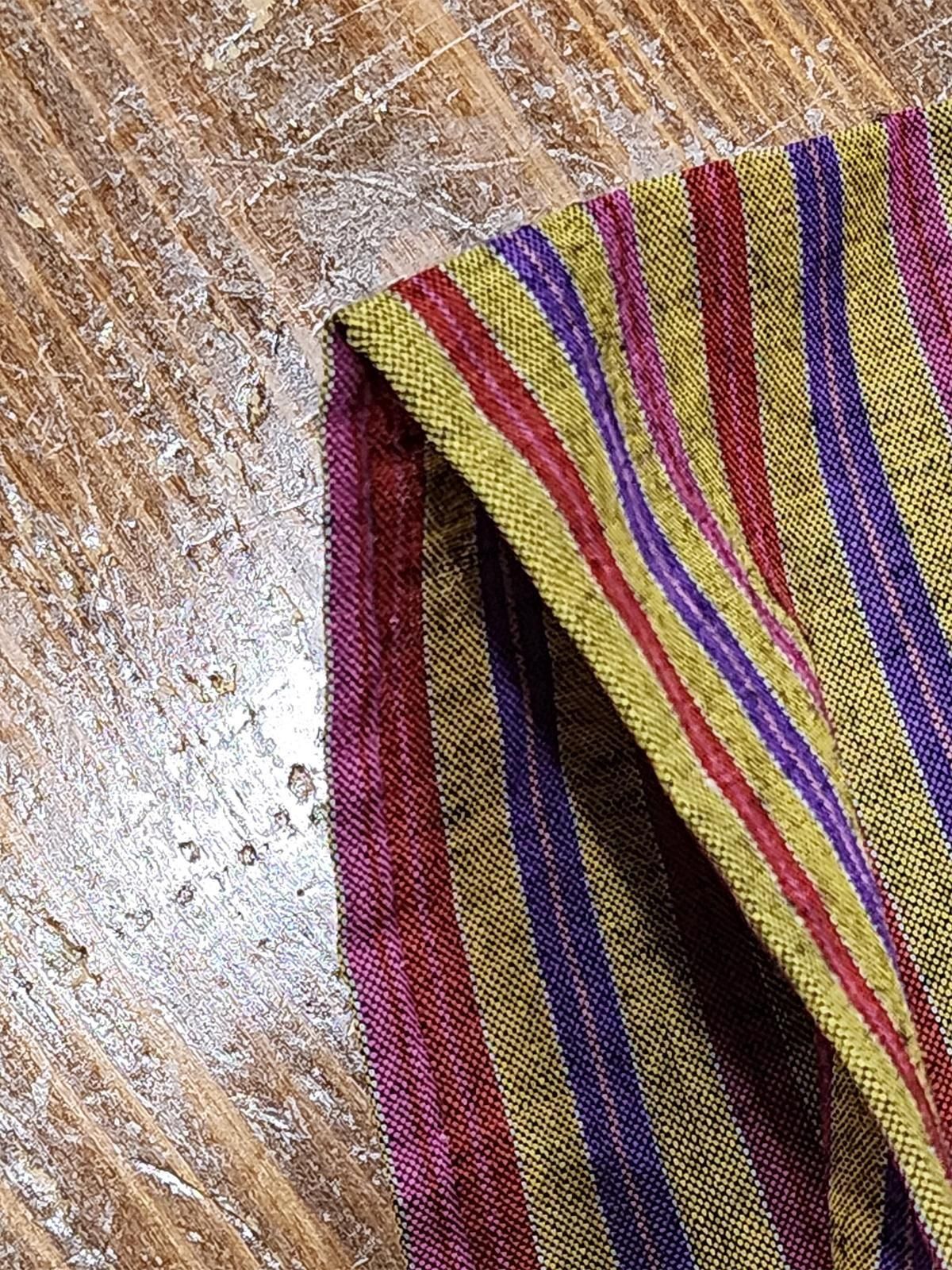 - デザイン: スモークがかったパスタードイエローをベースに、少し幅広のストライプがリズミカルに織りだされたモダンデザイン。葡萄パープルや木苺ピンク、ルージュレッドを重ねたメルヘンだけれど甘くなりすぎない配色が、大人の遊び心を感じさせる一枚です。