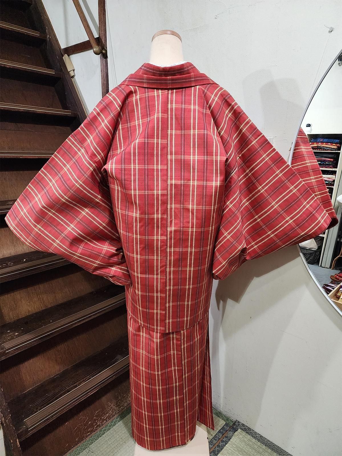 オレンジルージュをおびたブラウンをベースに、クラシックな気品とモダンな遊び心をかねそなえた洗練されたチェックパターンが織りだされたウールアンサンブル(着物+羽織)