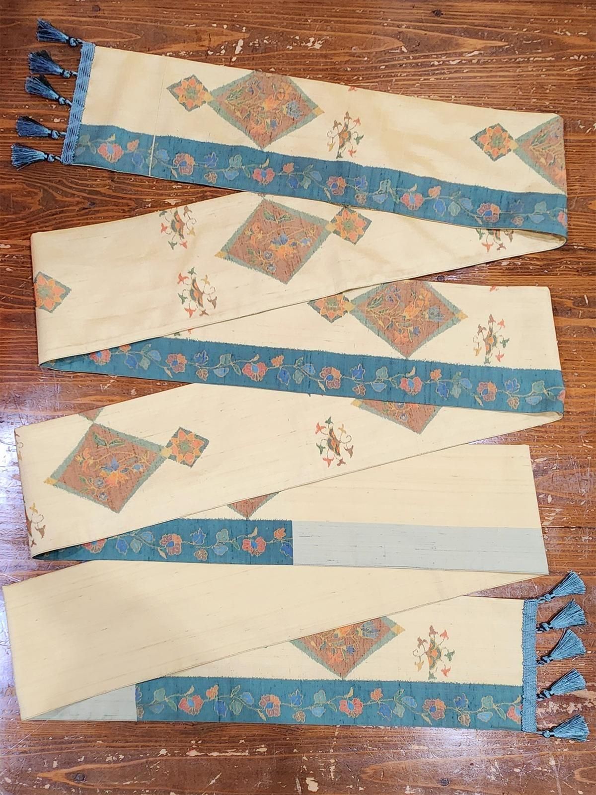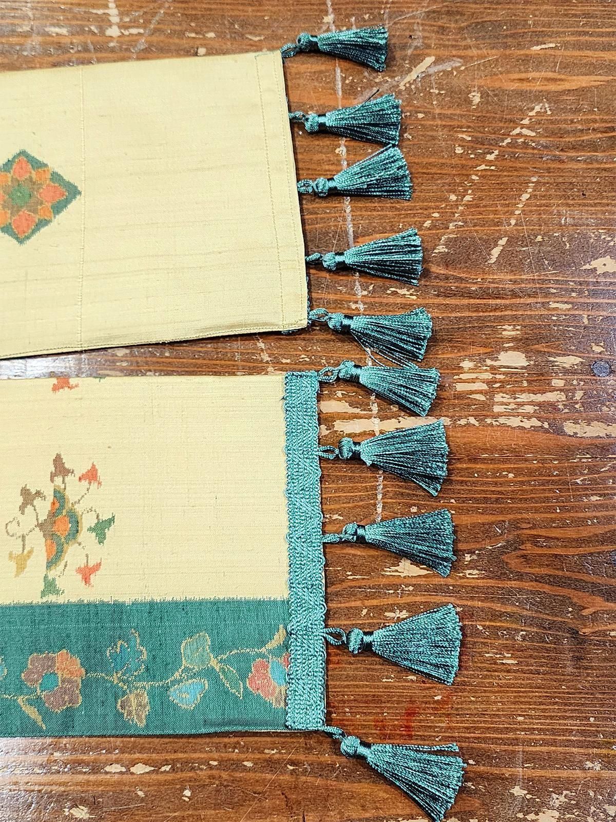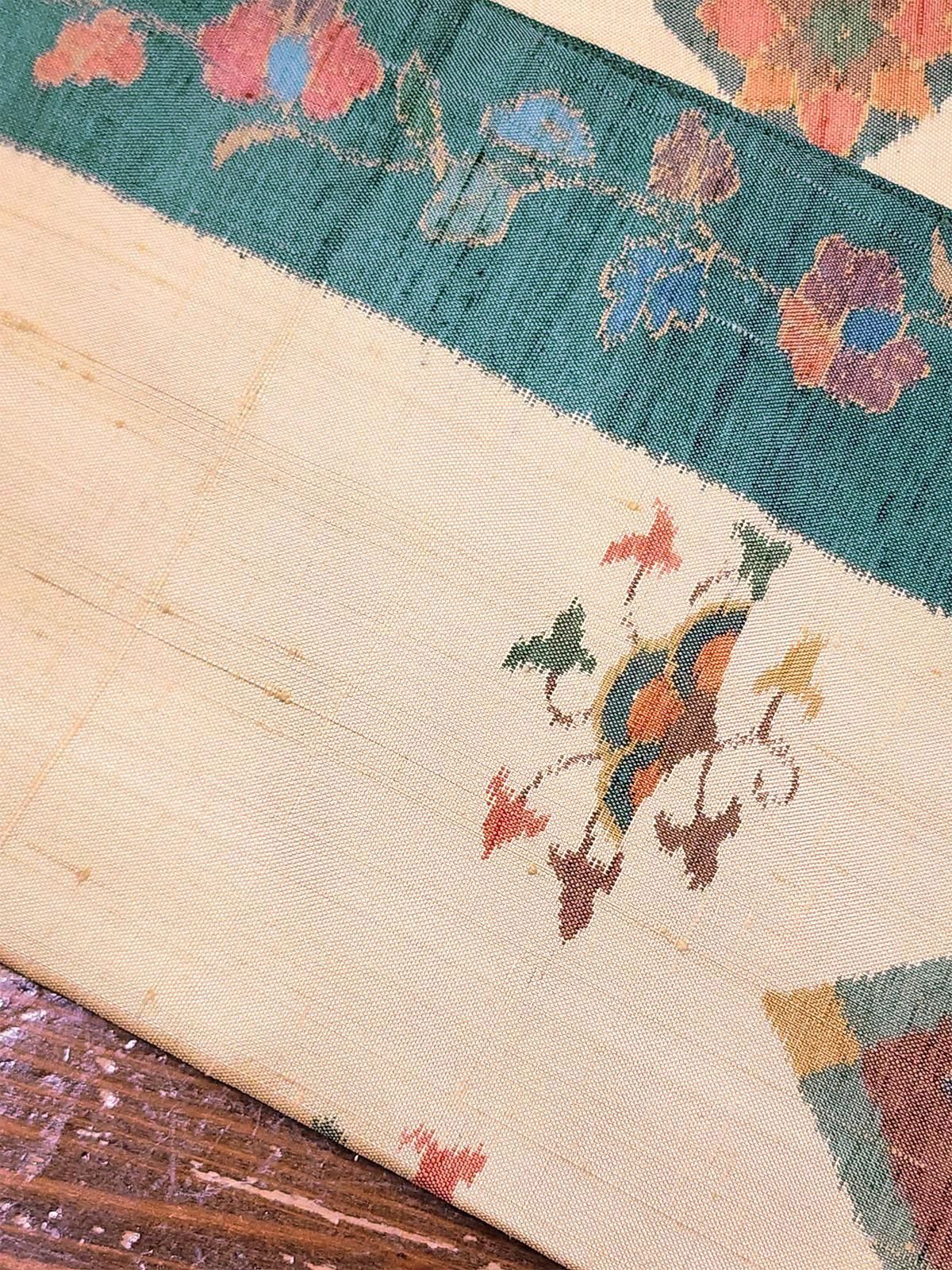 クリーミーなイエローベージュに孔雀石のようなグリーン美しいアラベスク・ボーダーがアクセントになったロングサイズ正絹紬のリファイン半幅帯。ゆらりと揺れる爽やかなグリーンのタッセル飾りがロマンチック。