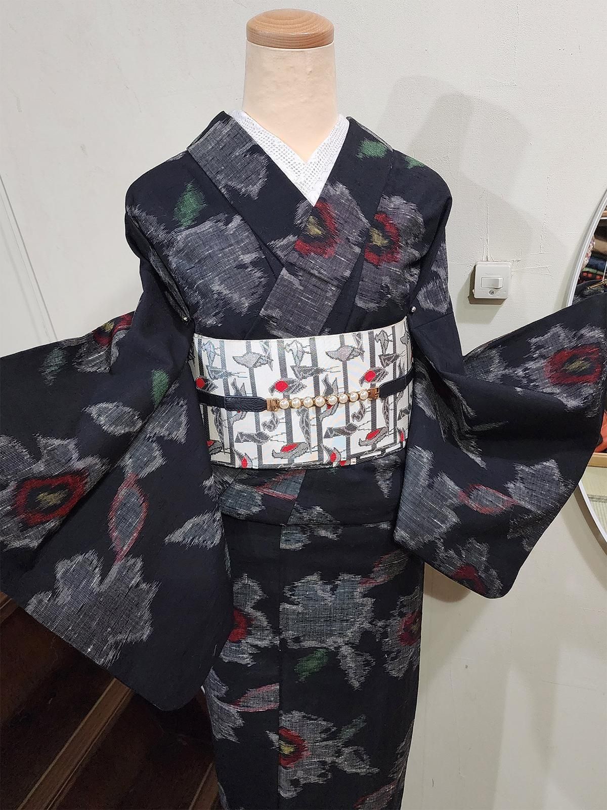 - コーデ提案: Unikkoのようなグラフィカルな強さがあるため、個性的なデザインの帯をあわせてもアートな雰囲気でおしゃれにきまります。ボーダーや水玉の帯でモダンポップな魅力をひきたたせても素敵。白やグレーの帯をあわせると大人っぽく、赤や黄、緑のアクセントカラーとも好相性です。