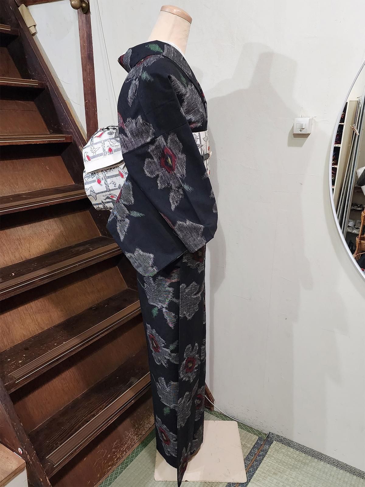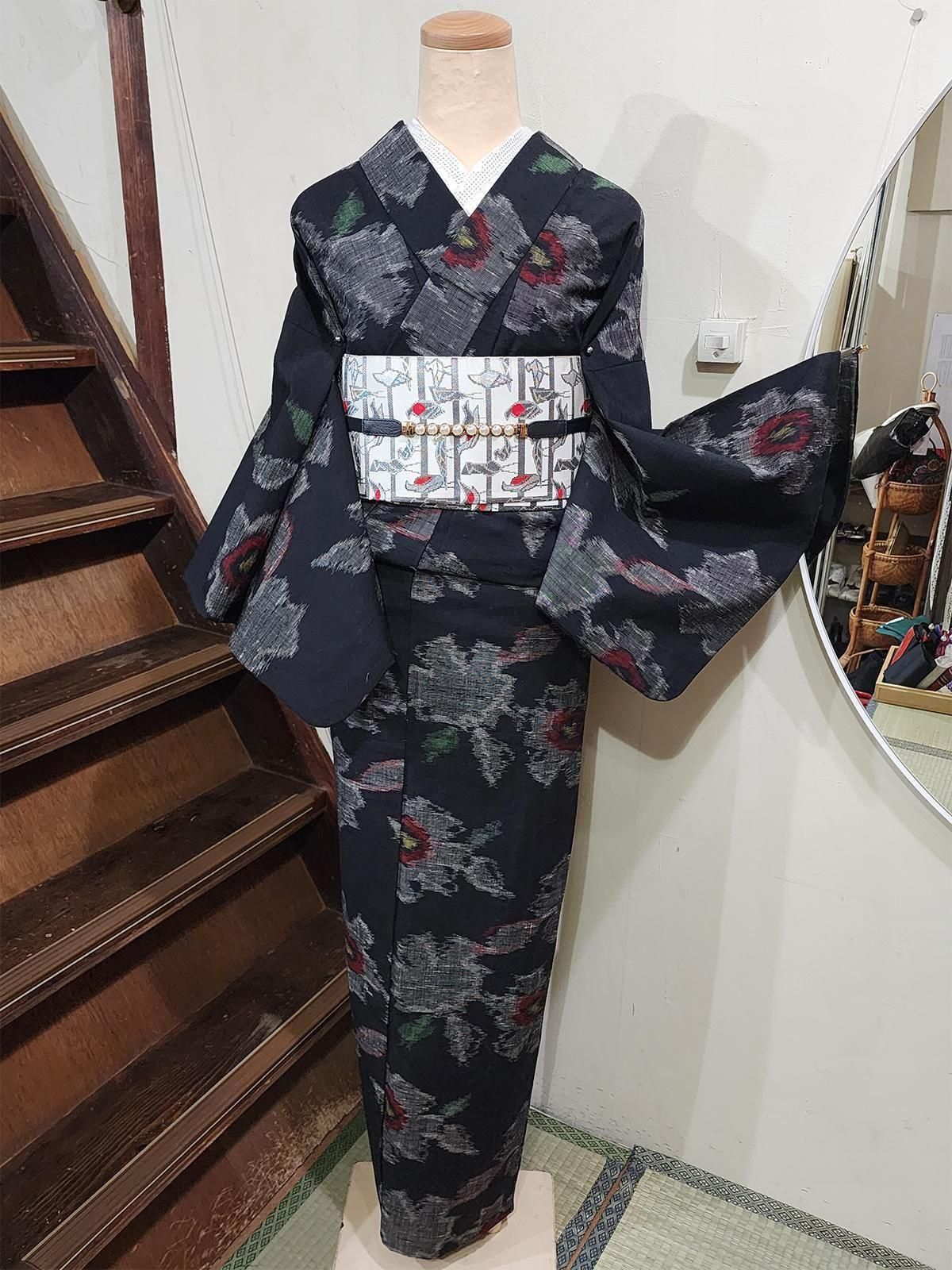 スモークブラックにマリメッコのテキスタイルのようなアートなフラワーパターンが浮かぶウール単着物