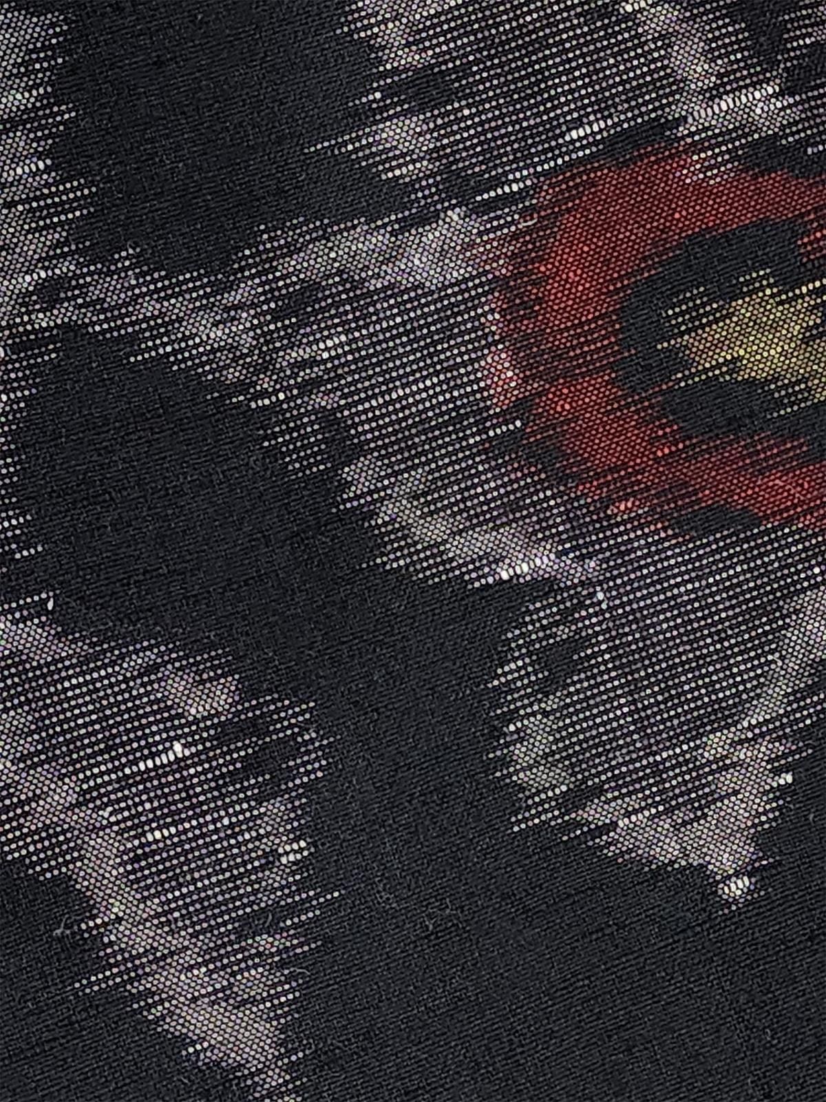 - デザイン: スモークブラックに大きく浮かぶ抽象的なフラワーパターンがマリメッコの名作「Unikko(ウニッコ)」を思わせるモダンでアートなウール単着物。グレイッシュカラーの花に赤と黄、緑がアクセントになったシックでいてモダンな存在感を感じるカラーセレクトも素敵