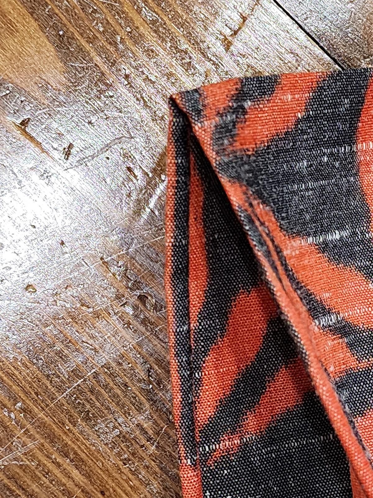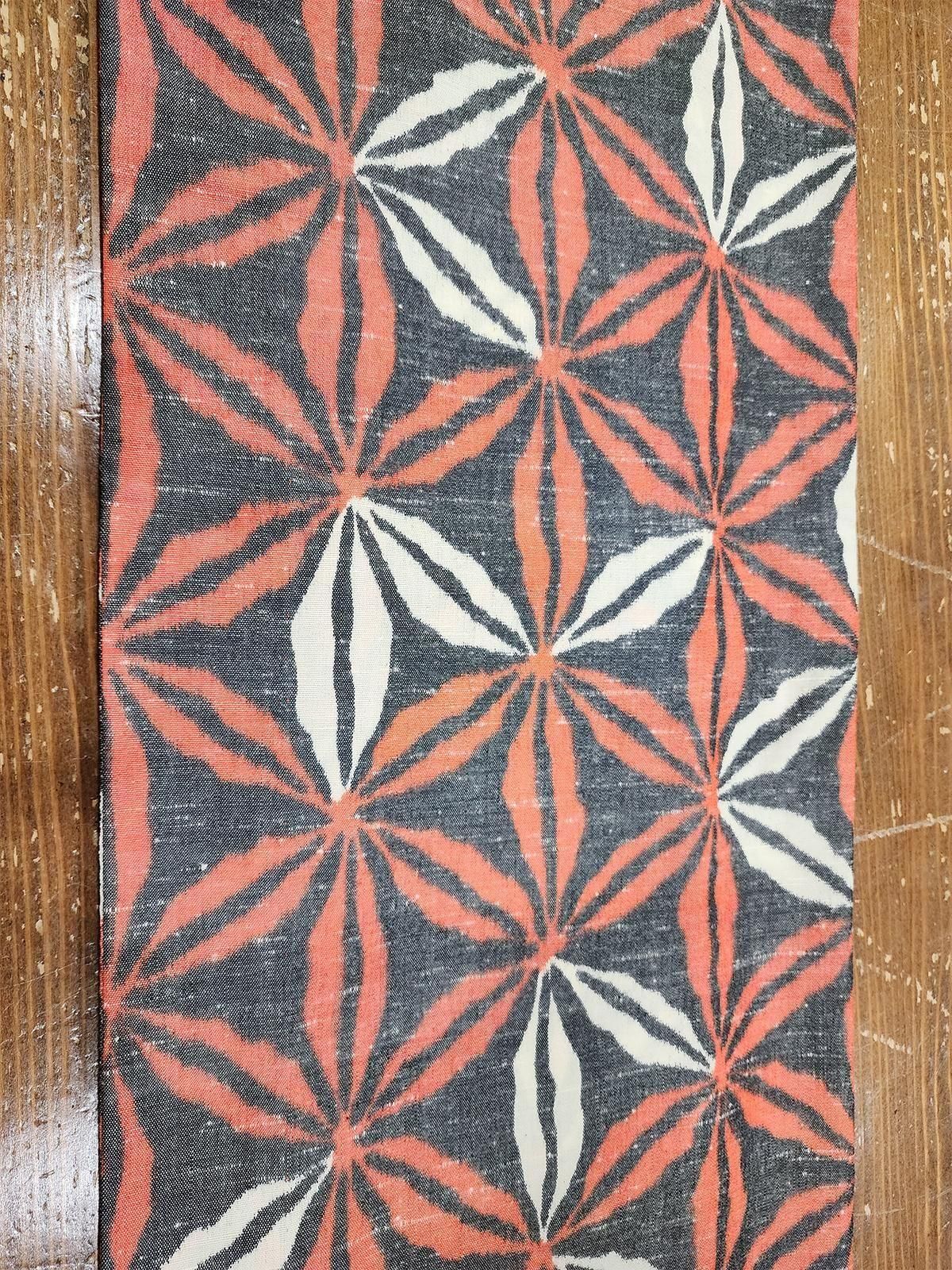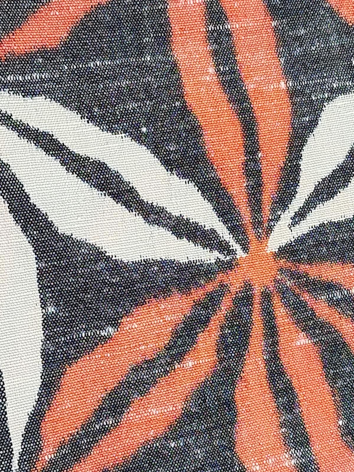 - デザイン: ネップのような節糸がアクセントになった杢調のダークグレーにオレンジルージュとアイボリーの変わり麻の葉が星のように連なる大胆な幾何学パターンがモダンでアートな一枚。軽やかに波うつラインがリズミカルな動きを生み、レトロとモダンが調和した特別な魅力を生みだします。