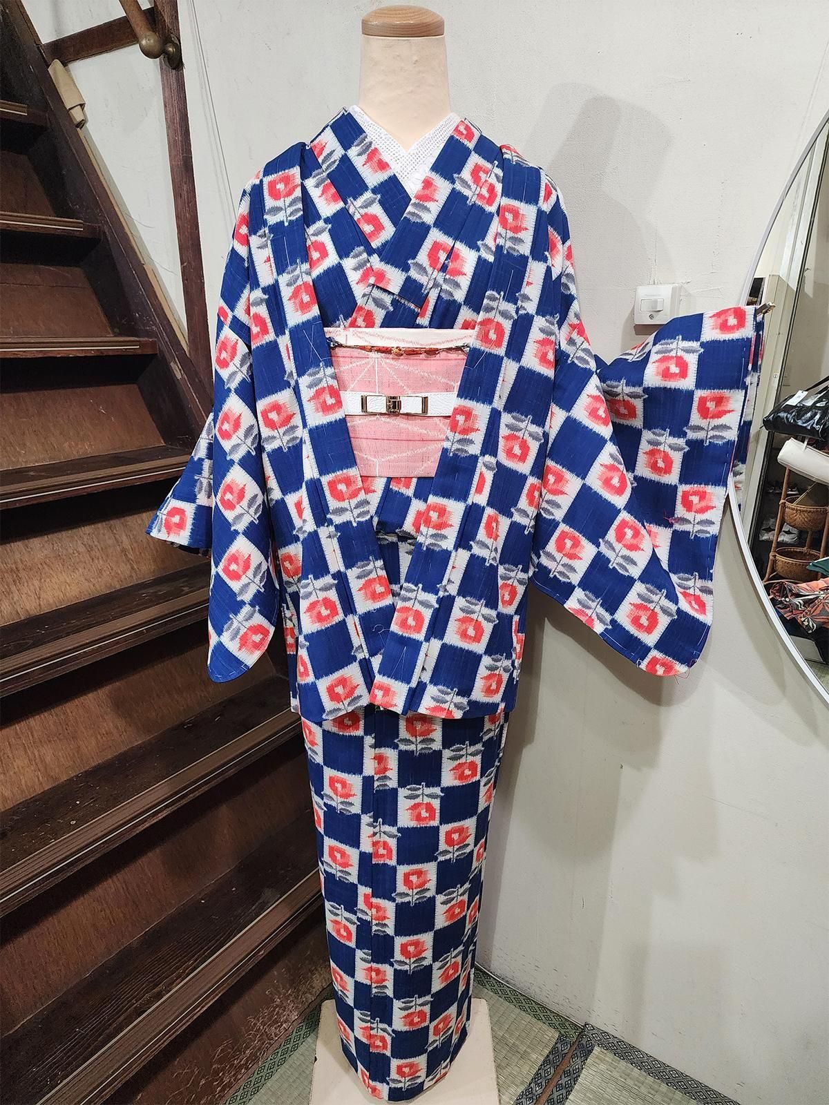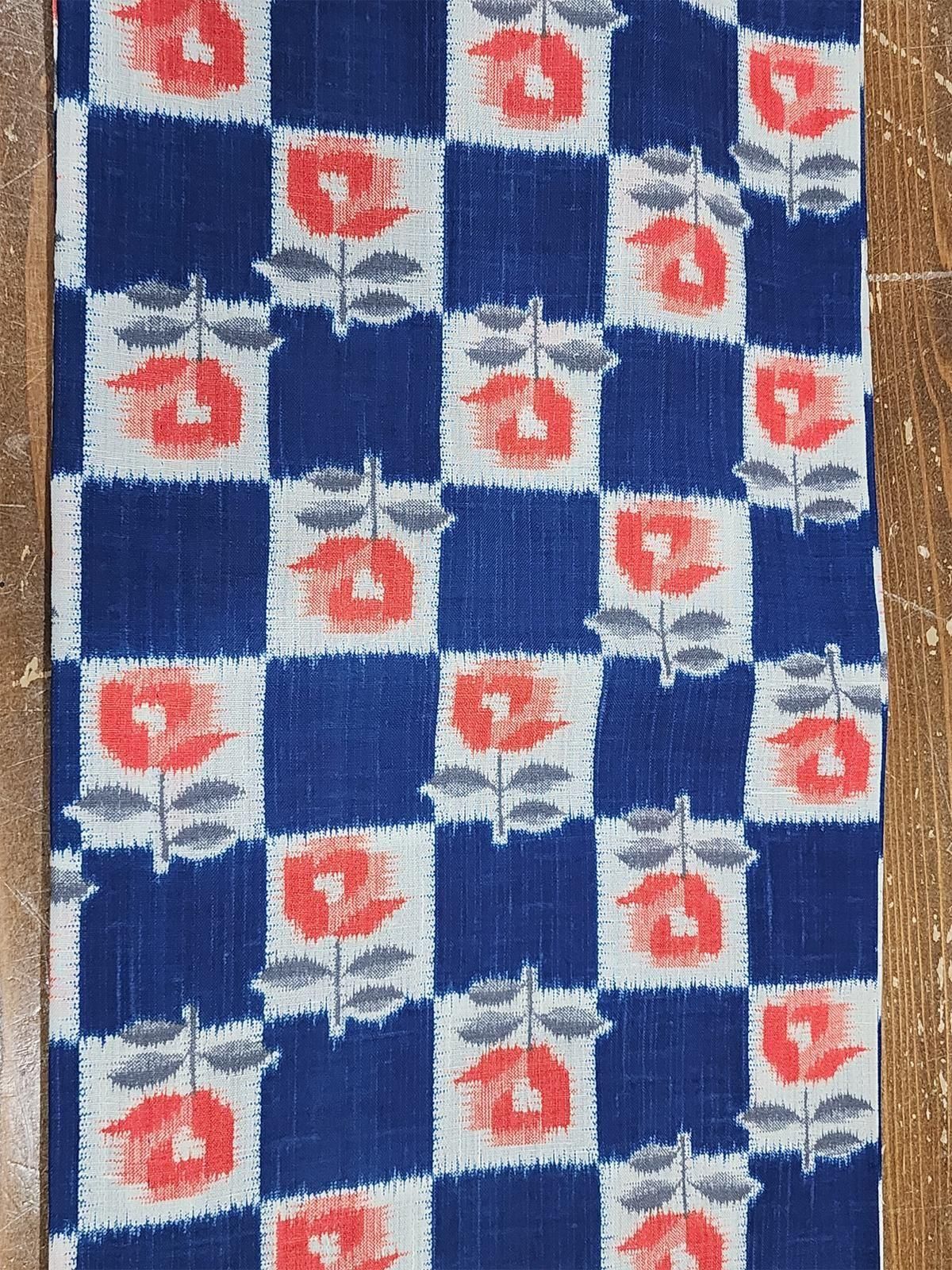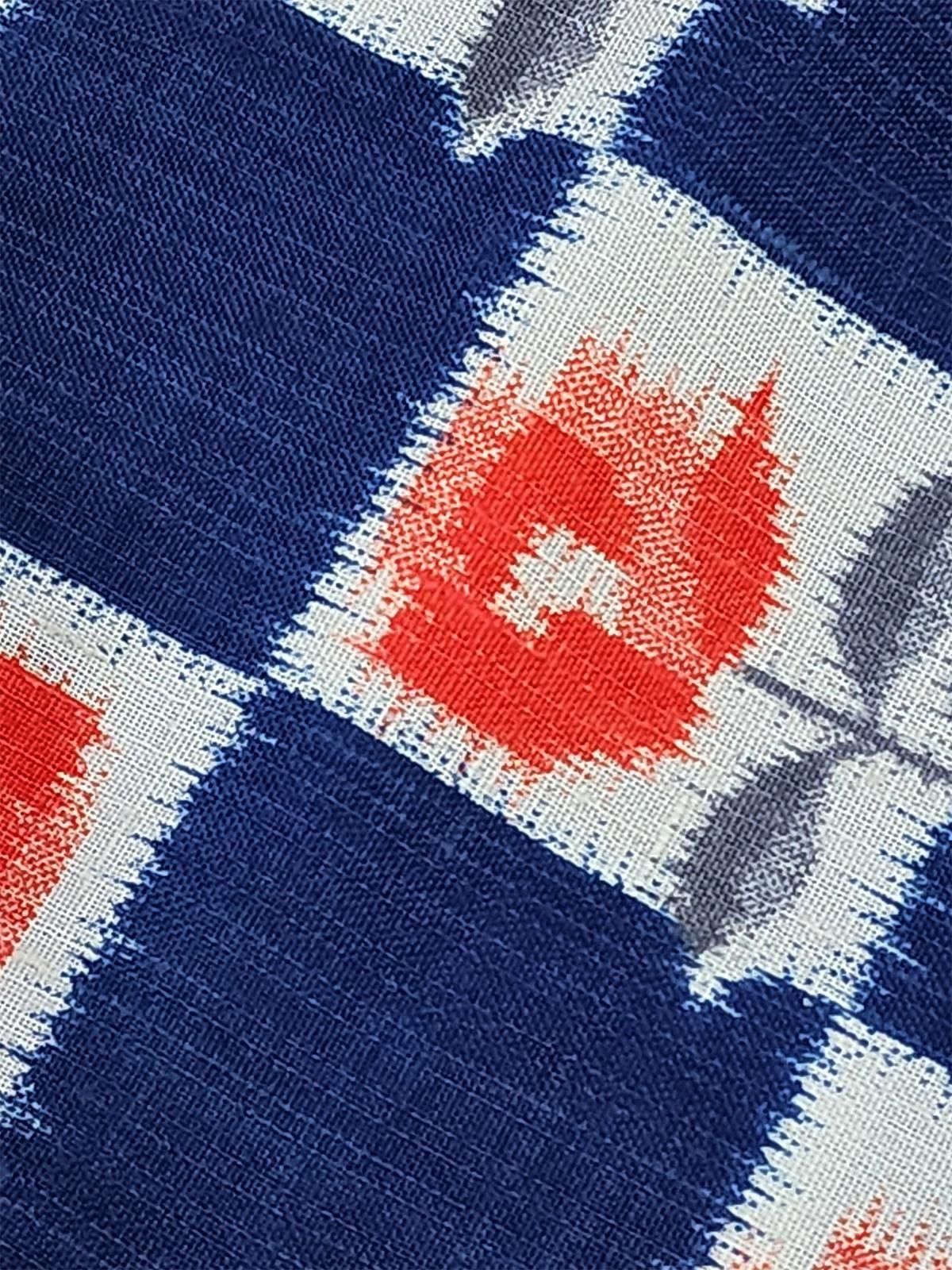 - デザイン: ネイビーブルーとアイボリーの市松に、朱赤色のころんと丸い小さな花が可憐に並ぶレトロポップなアンサンブル。絣調のにじみがやわらかな表情を添え、北欧テキスタイルのような遊び心と昭和レトロな愛らしさをあわせ持つデザインです。