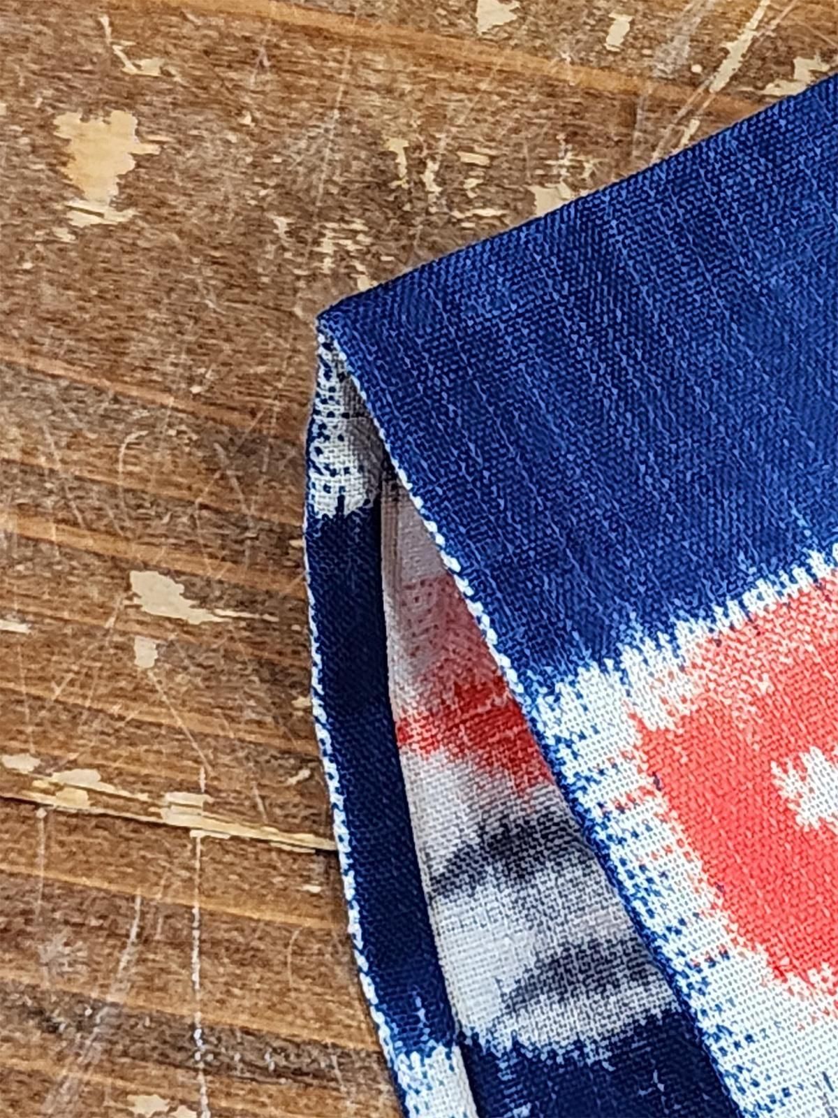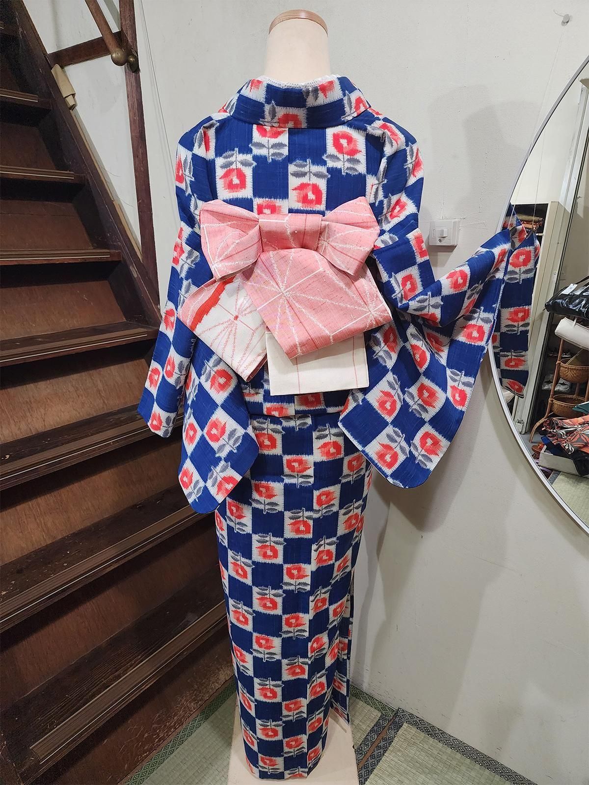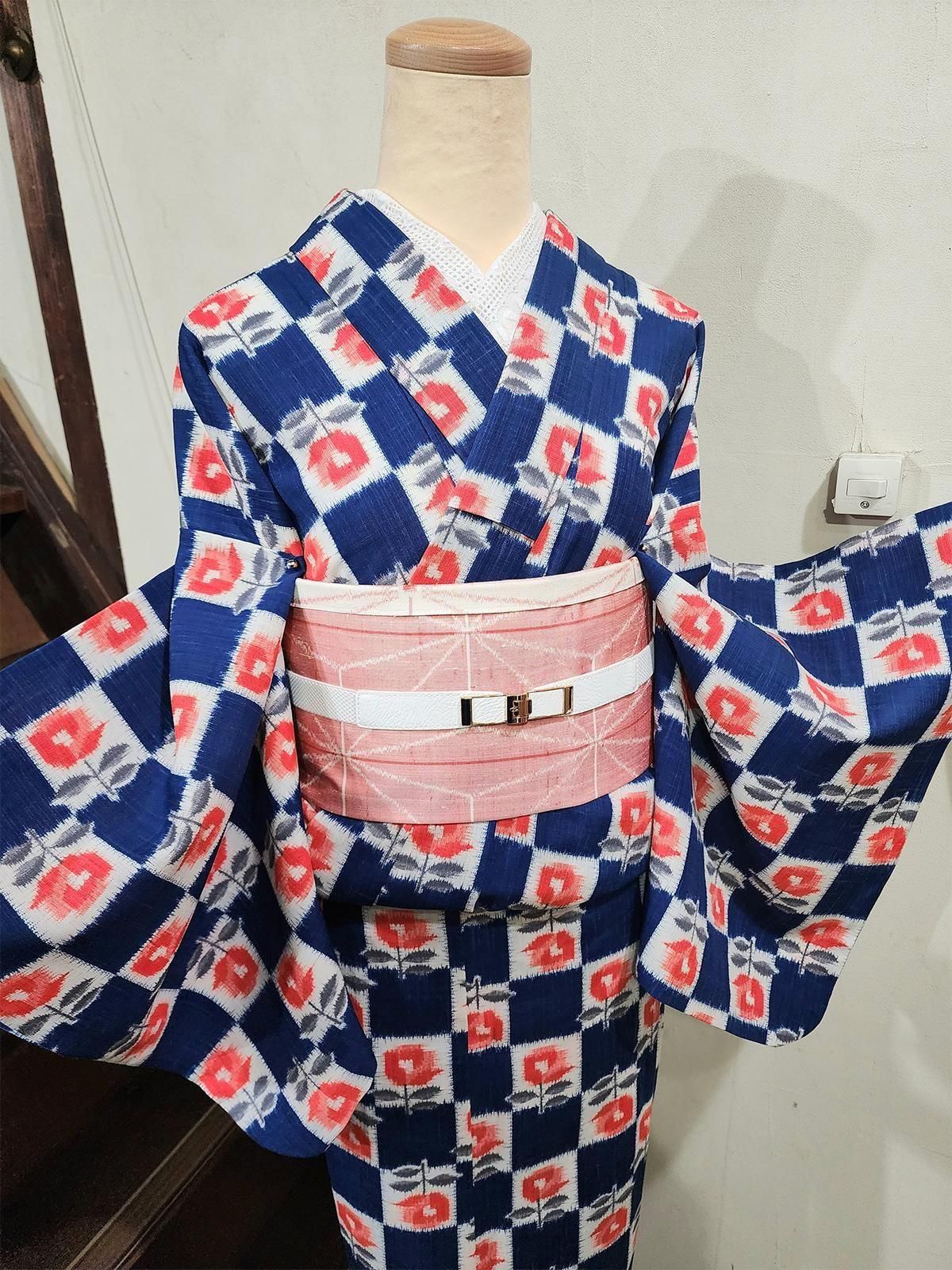 - デザイン: ネイビーブルーとアイボリーの市松に、朱赤色のころんと丸い小さな花が可憐に並ぶレトロポップなアンサンブル。絣調のにじみがやわらかな表情を添え、北欧テキスタイルのような遊び心と昭和レトロな愛らしさをあわせ持つデザインです。