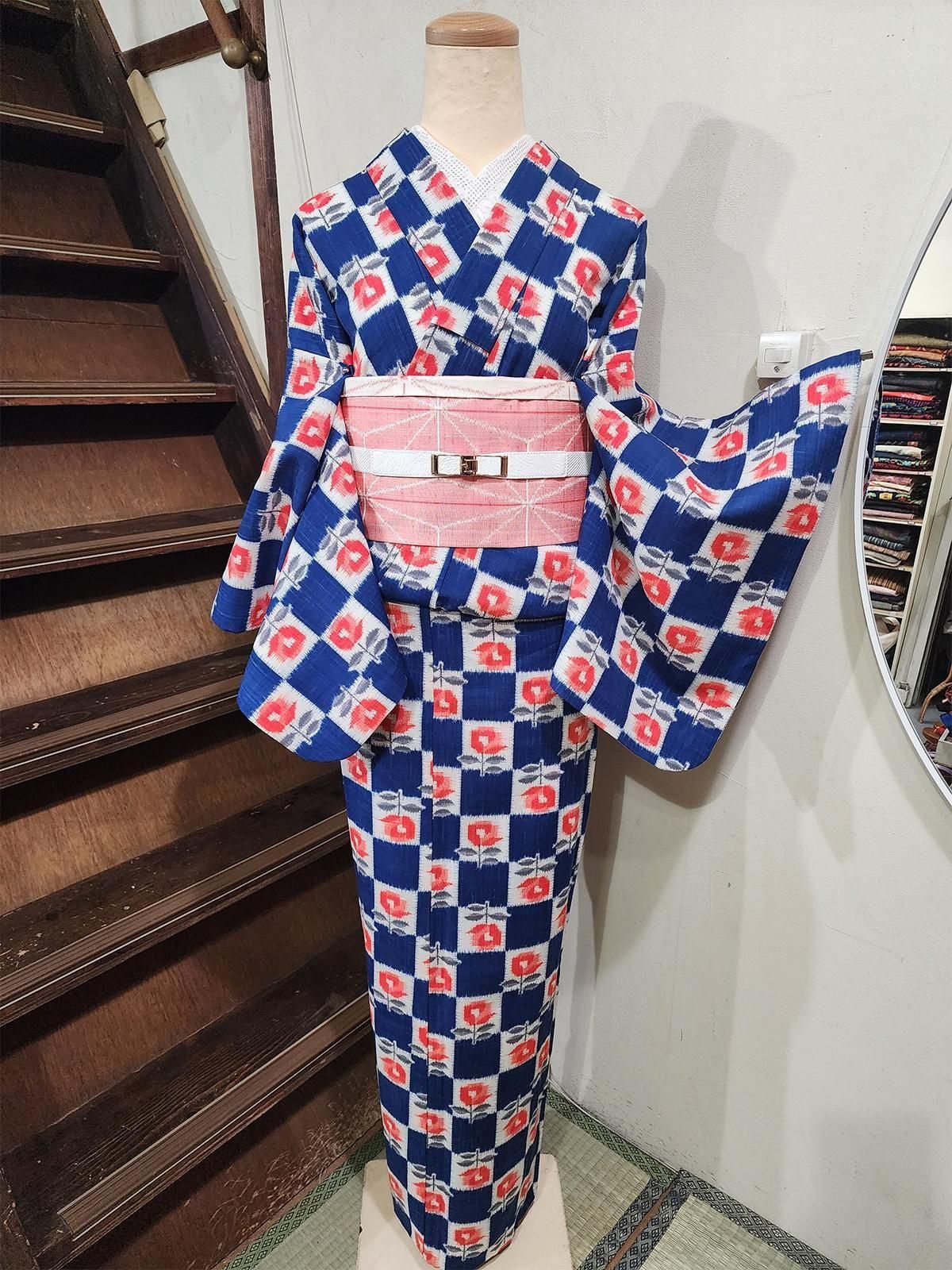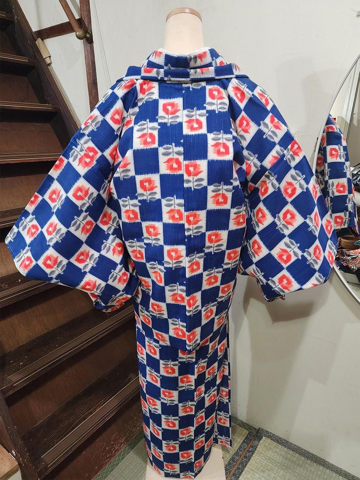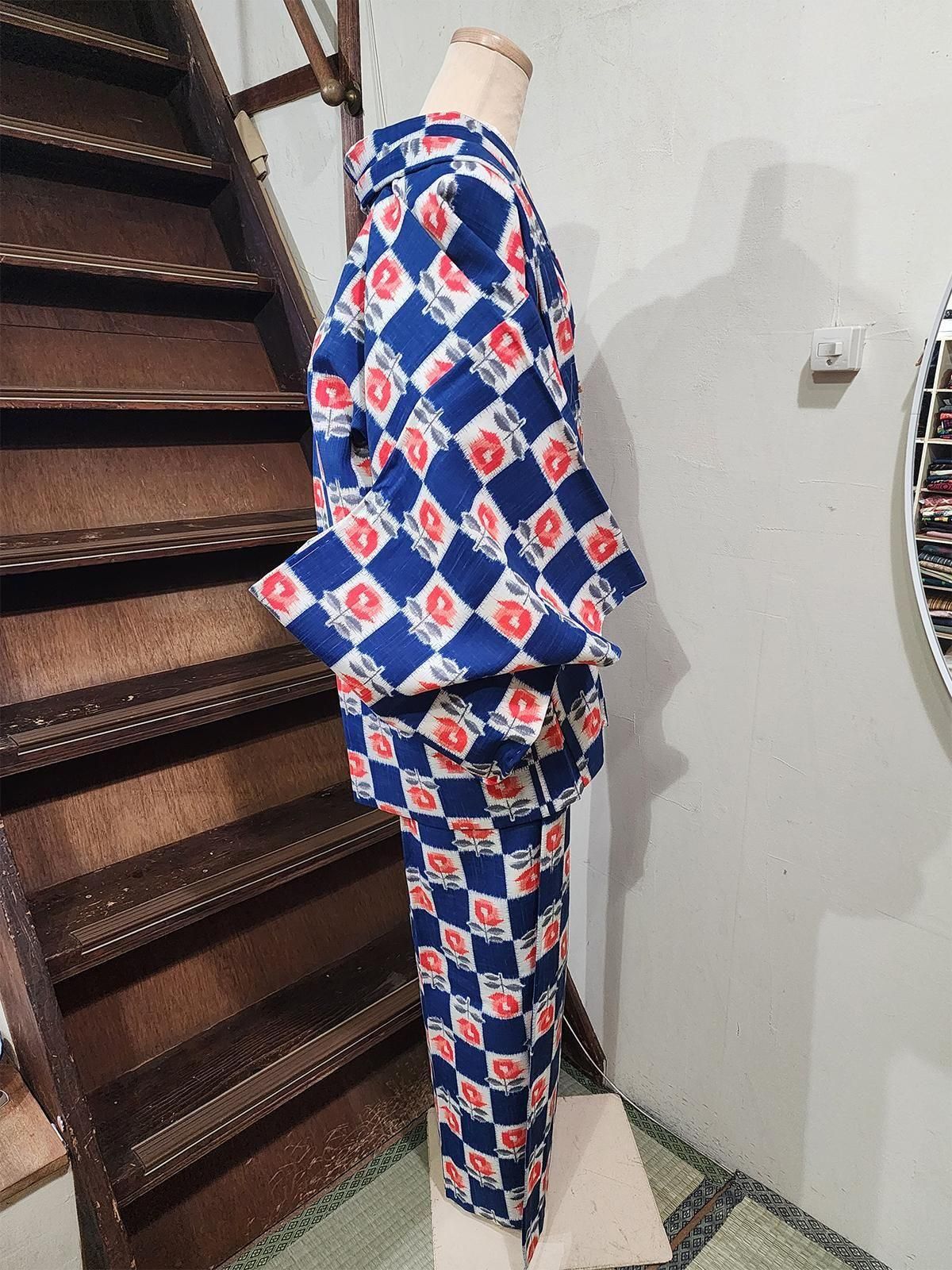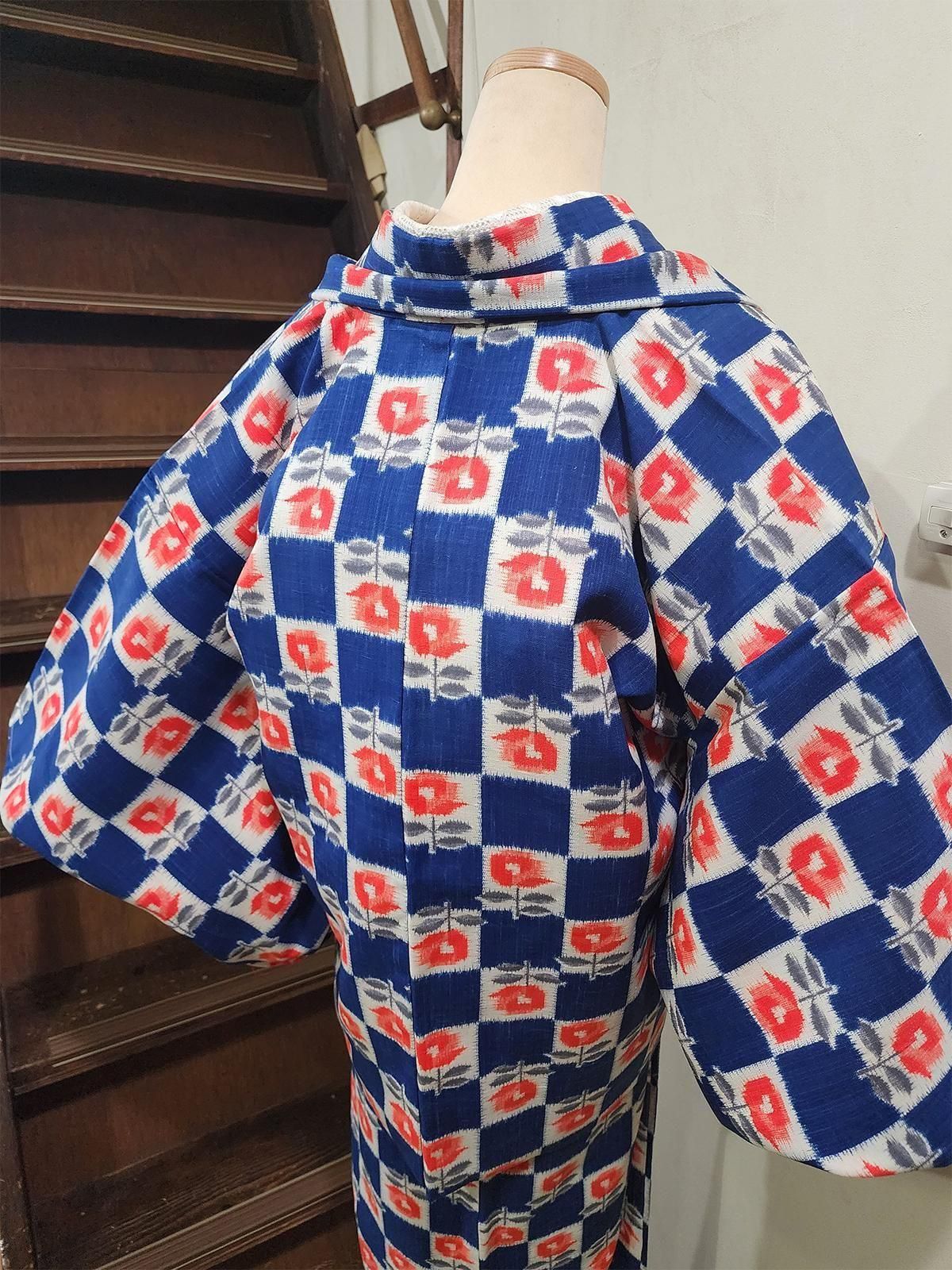 ネイビーブルーの市松に椿のような薔薇のような赤色の花が咲く、レトロポップなウールアンサンブル(着物+羽織のセット)