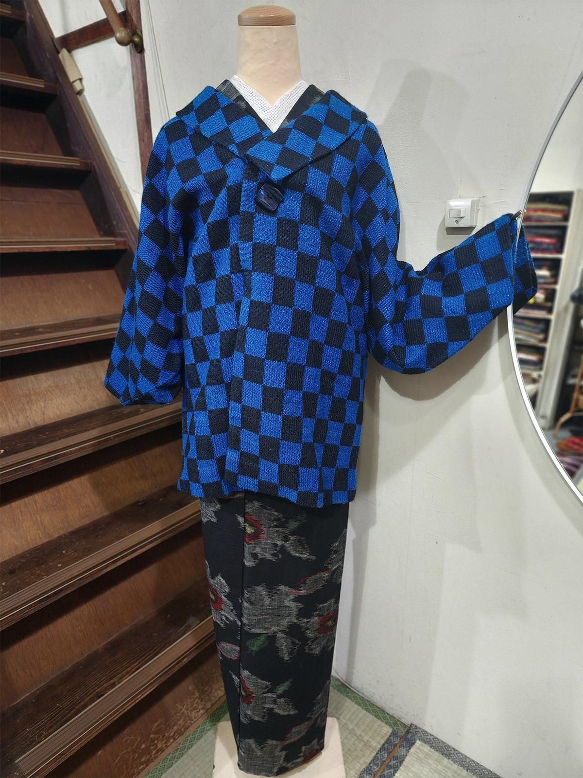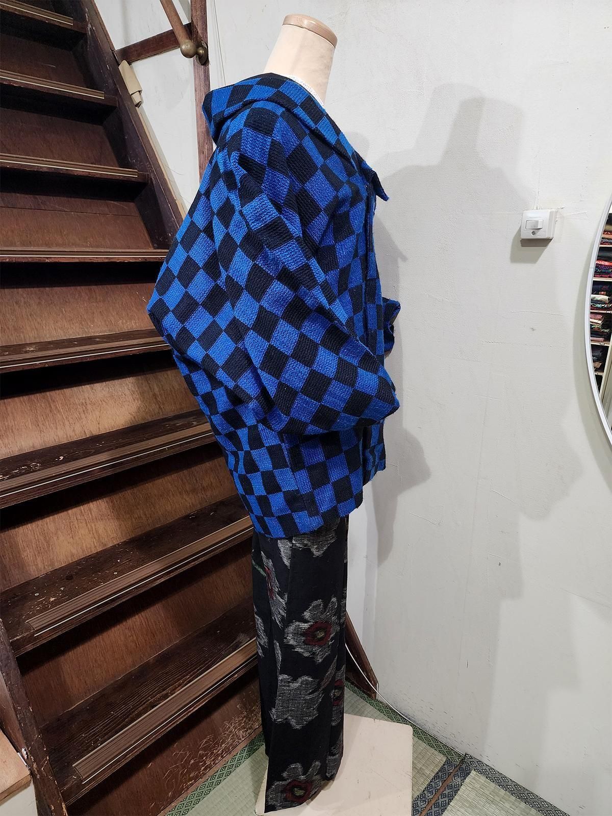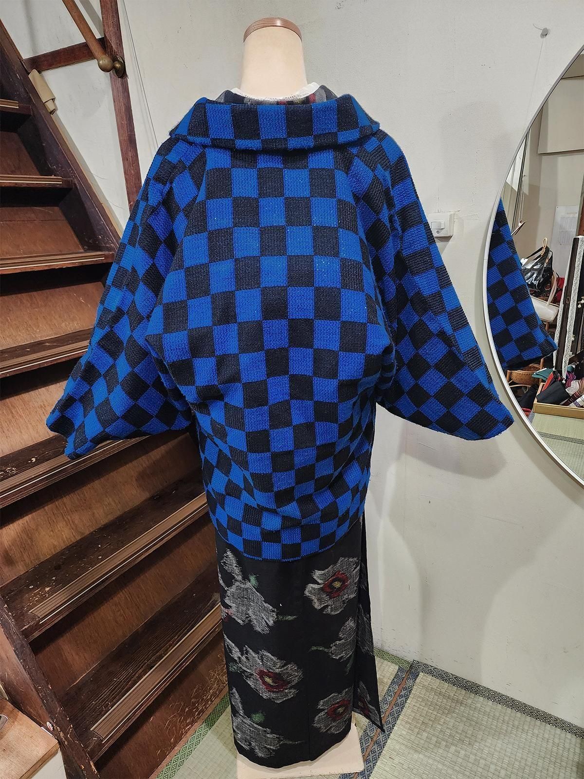 ブラック×ダークブルーの市松にラメがきらめく、モードなビンテージ着物コート