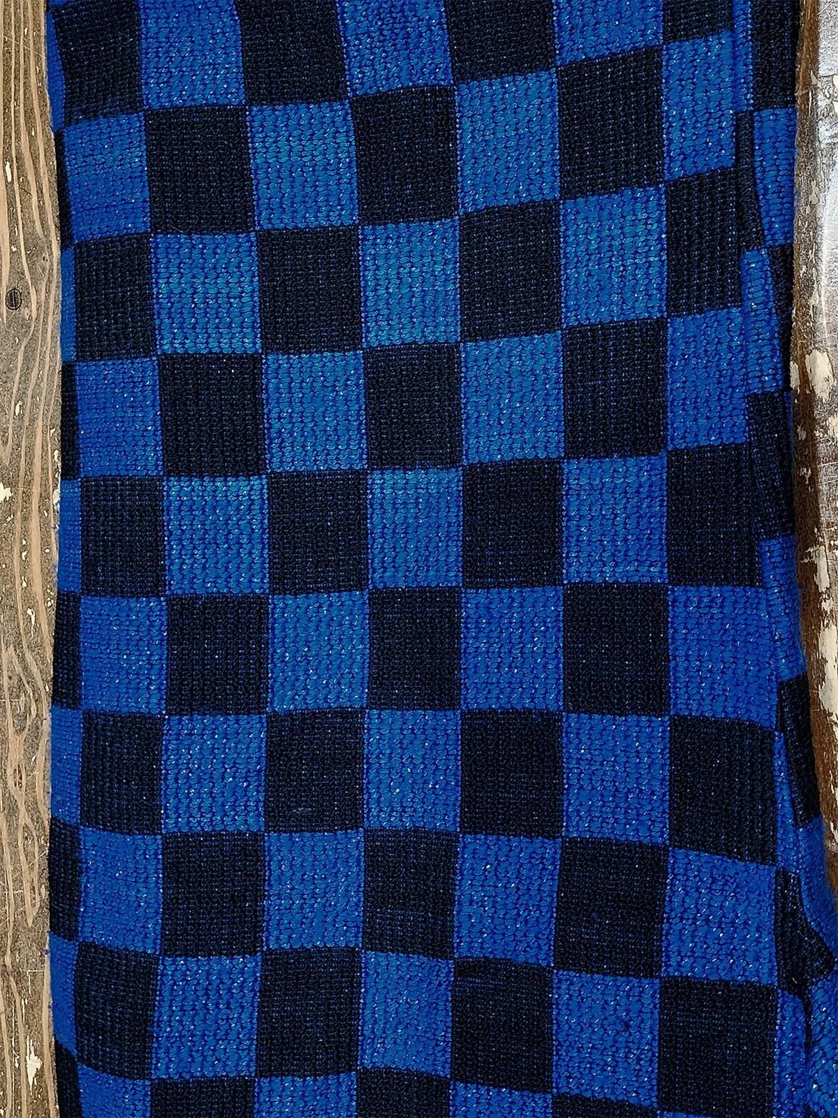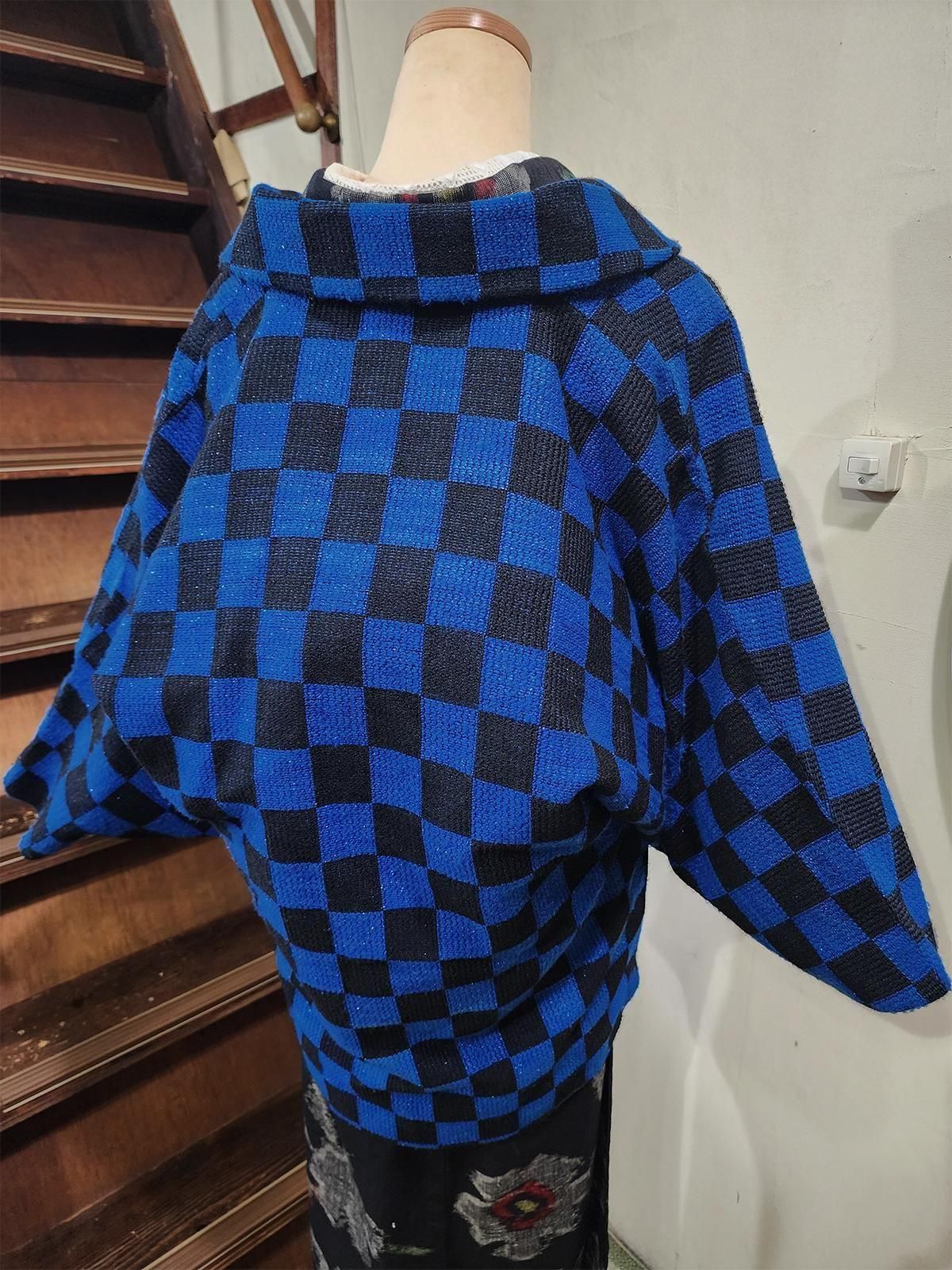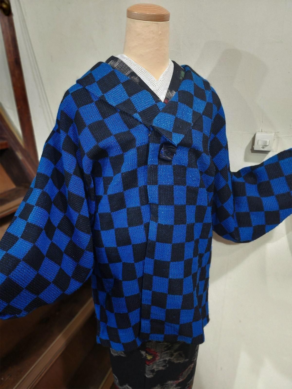 ブラック×ダークブルーの市松にラメがきらめく、モードなビンテージ着物コート