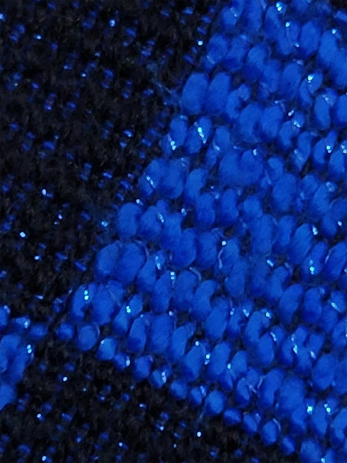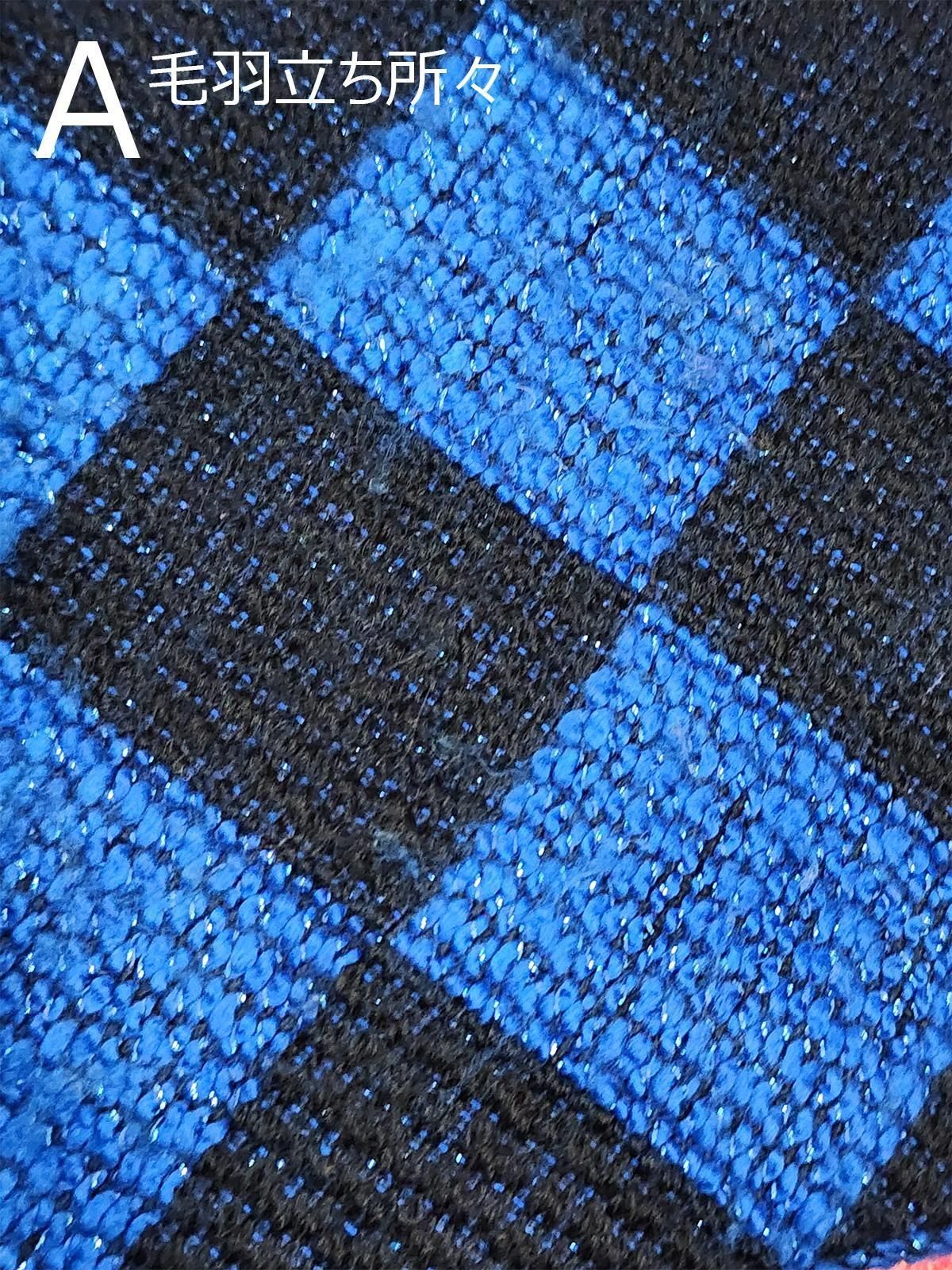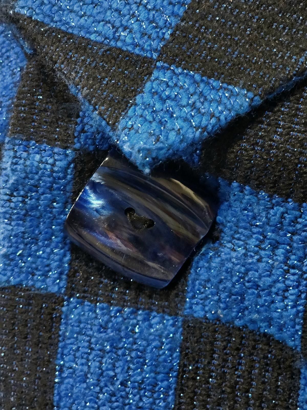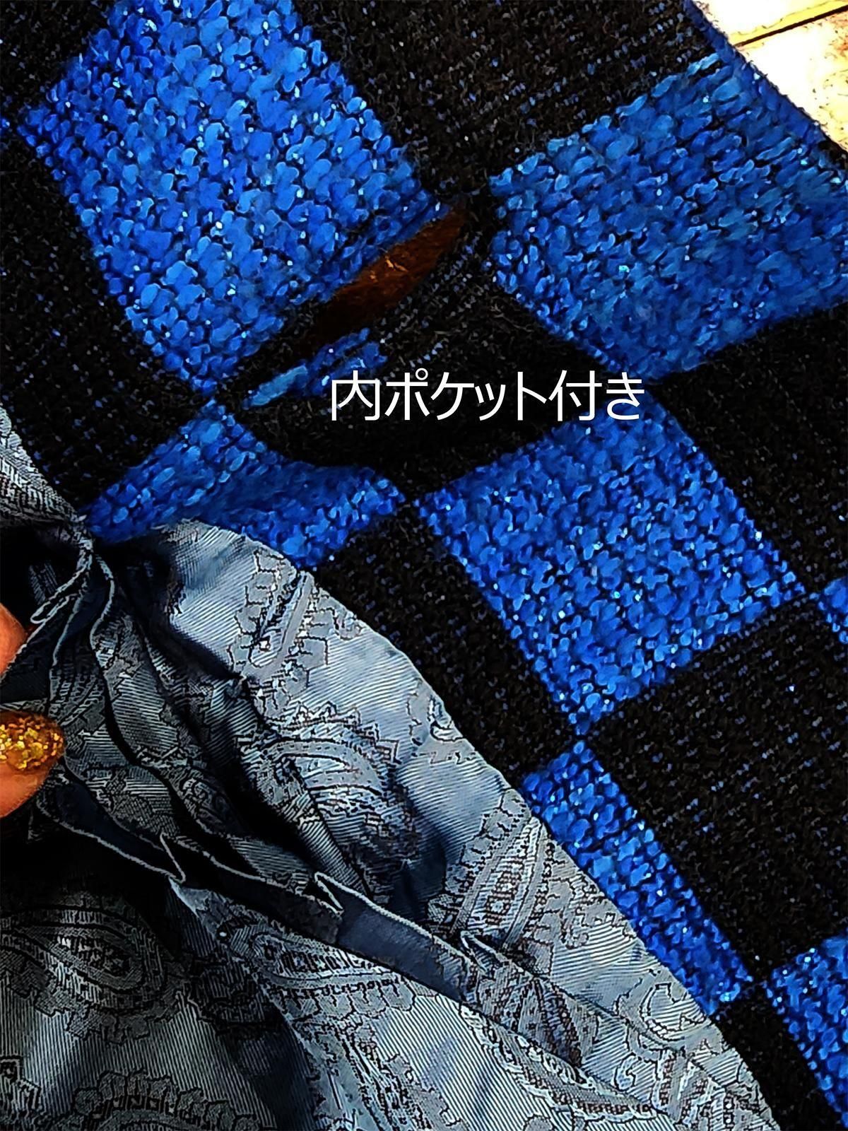 - デザイン: 深いブラックとダークブルーの市松チェックにきらめくラメ糸がモードな遊び心をプラス。すっきり斜めに重なる衿とアートなビンテージボタンがビンテージらしいアクセントになった一枚です。ブルーは光の加減でネイビーのような暗い色味に見えたり、青がコバルトのようにやや鮮やかに見えたりします。便利な内ポケット付きです。