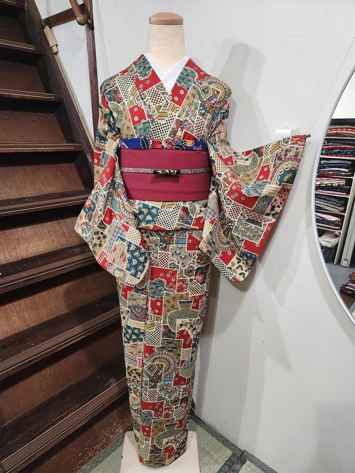 和更紗のようなドラマチックな彩り。鳥や花、装飾模様をパッチワークのように繋いだウール単着物
