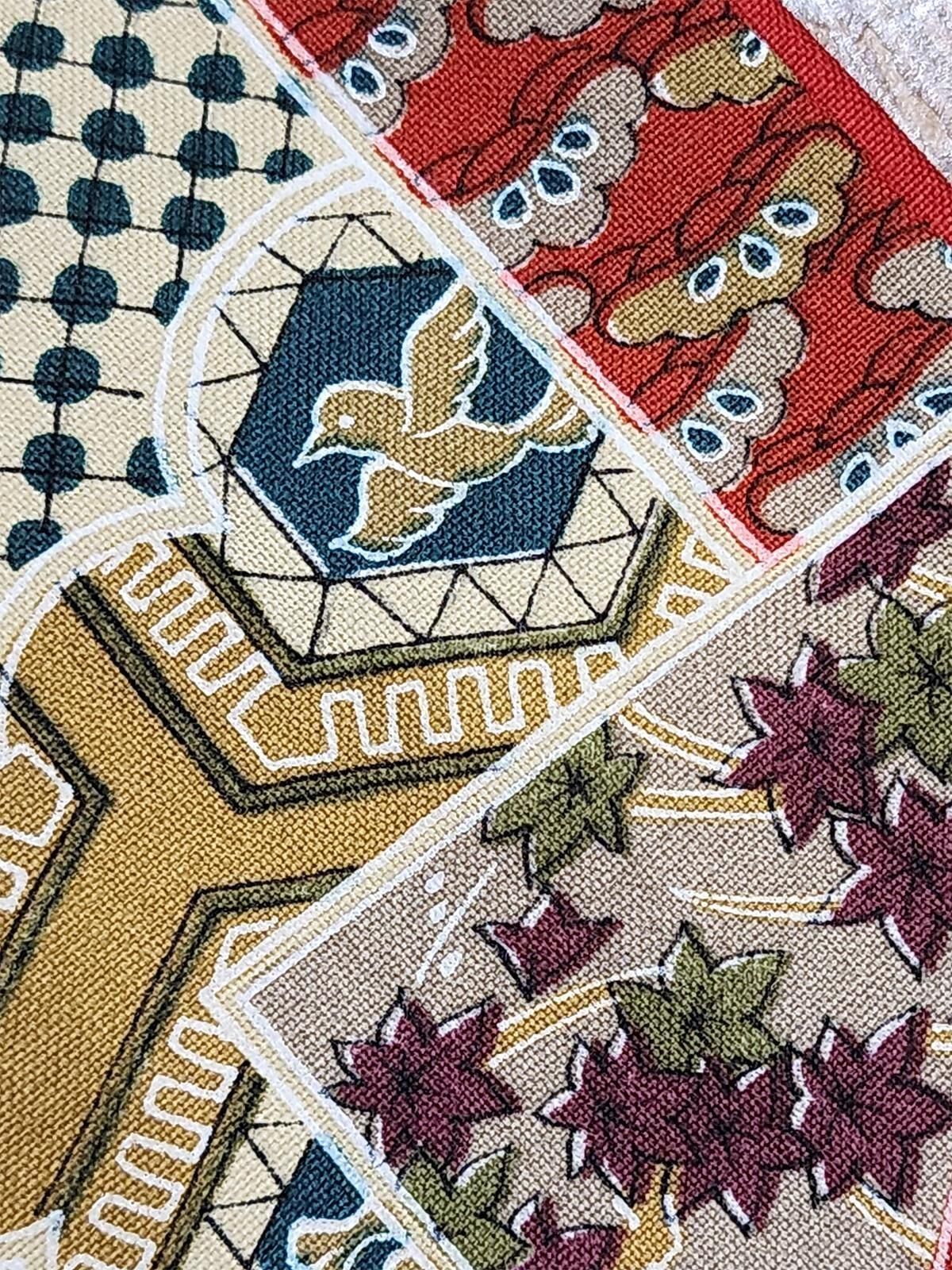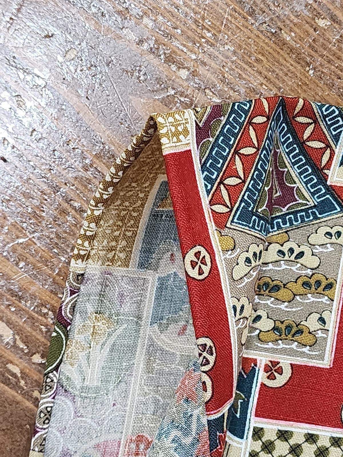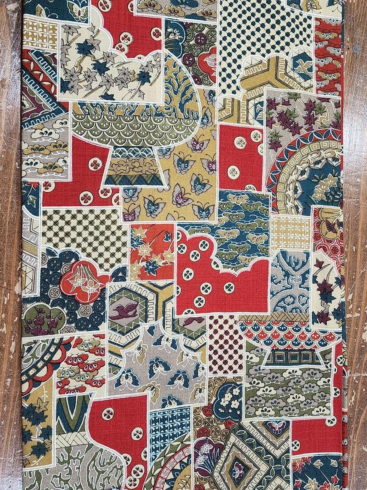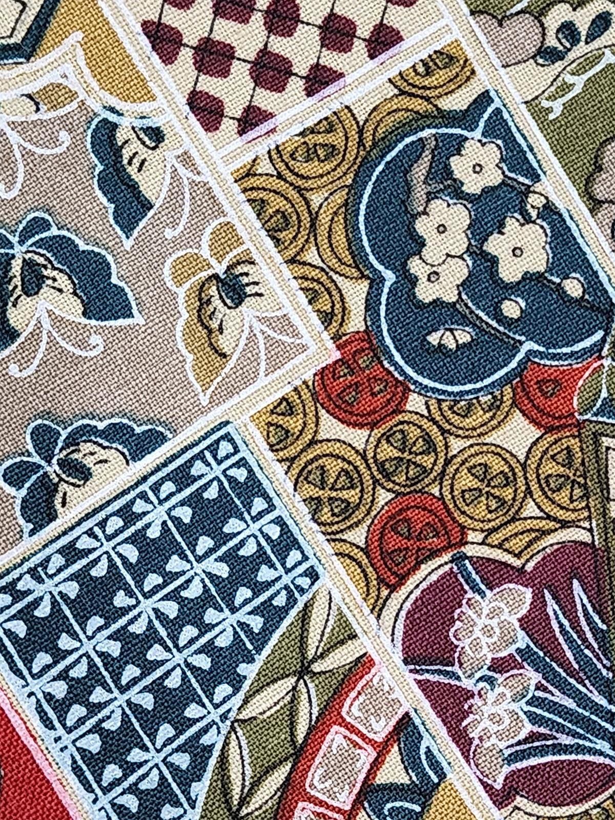 - デザイン: 蝶々、松や楓、梅や杜若などの四季の草花、鳥に亀甲、更紗のような装飾模様、モダンな幾何学模様を、四角形や曲線、壺のような形で型取りして、パッチワークのように組み合わせたデザインです。