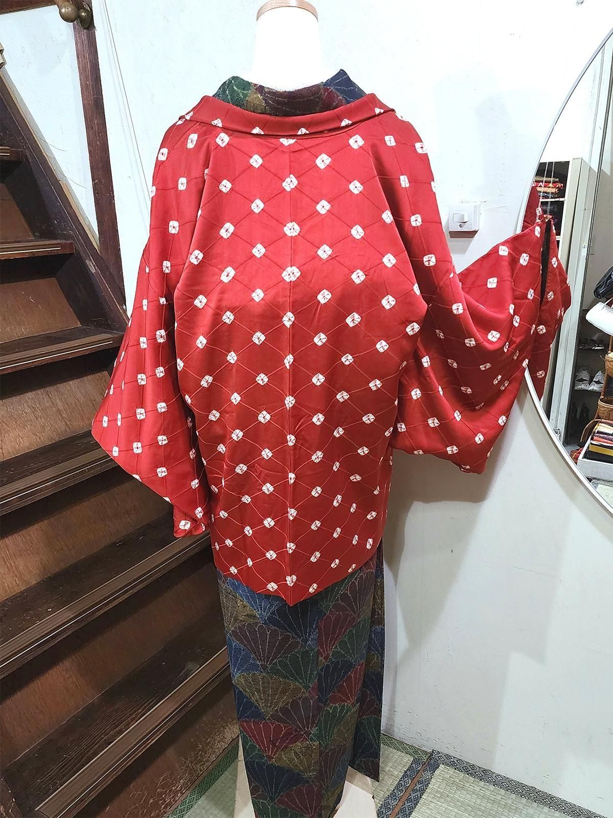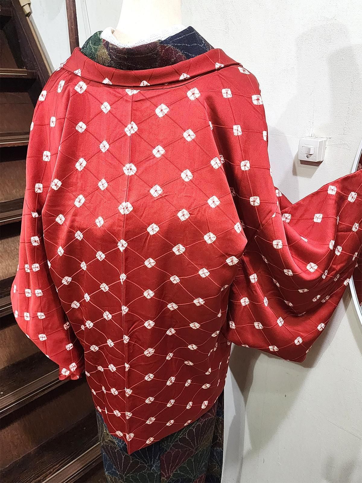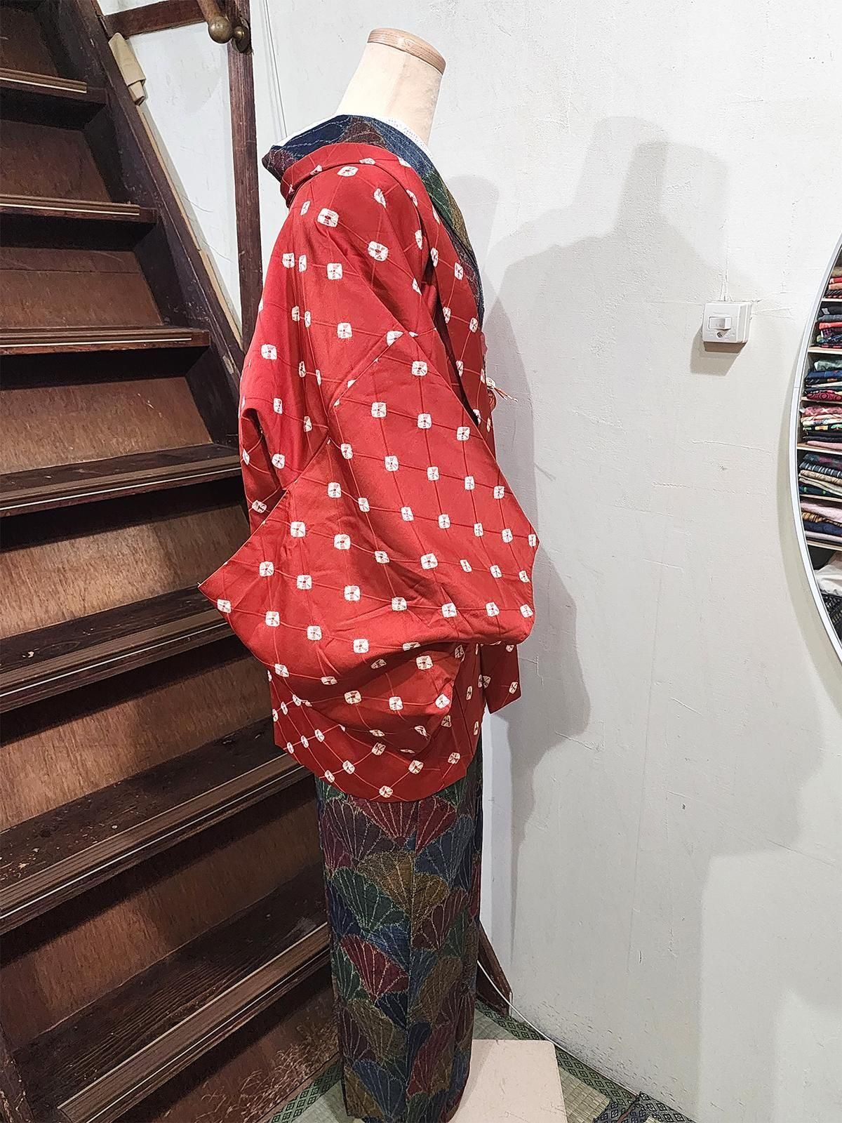 マンダリンブラウンの菱格子に淡雪のような本絞りの水玉がふわりと浮かぶビンテージ正絹羽織