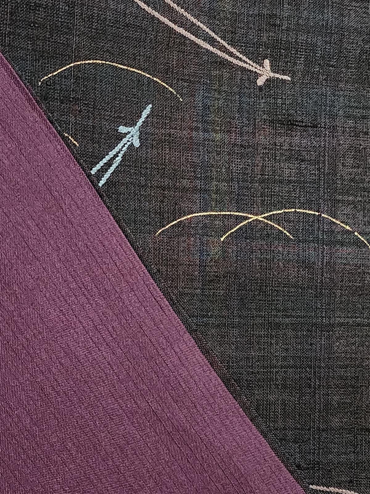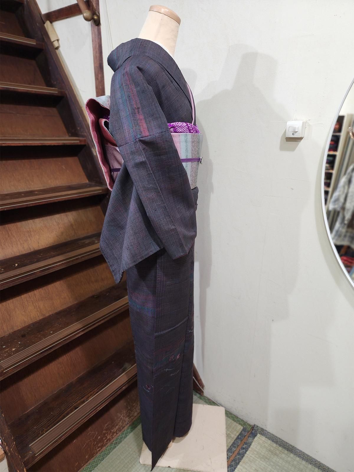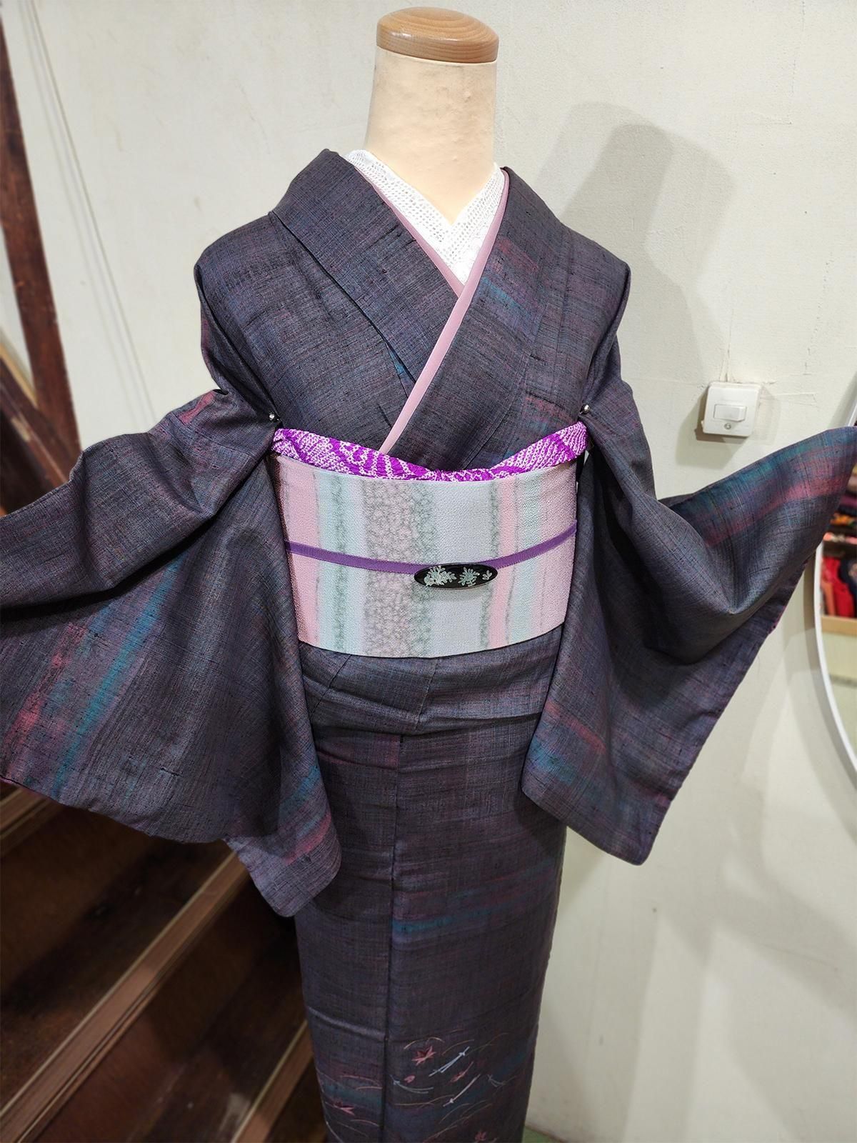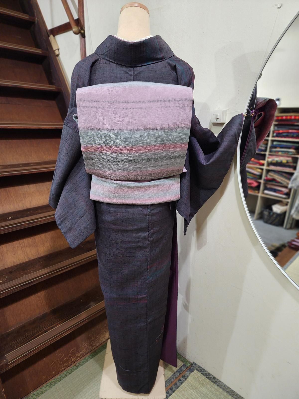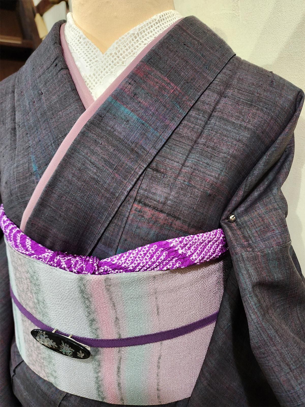 - コーデ提案: 藤色や葡萄色など紫系の帯をあわせると洗練された大人の華やぎが加わります。グレー、ベージュ、白、茶系、黒の帯でシックにまとめても粋。名古屋帯・半幅帯どちらも合わせやすく、帯合わせで表情が大きく変わる楽しみのある一枚です。