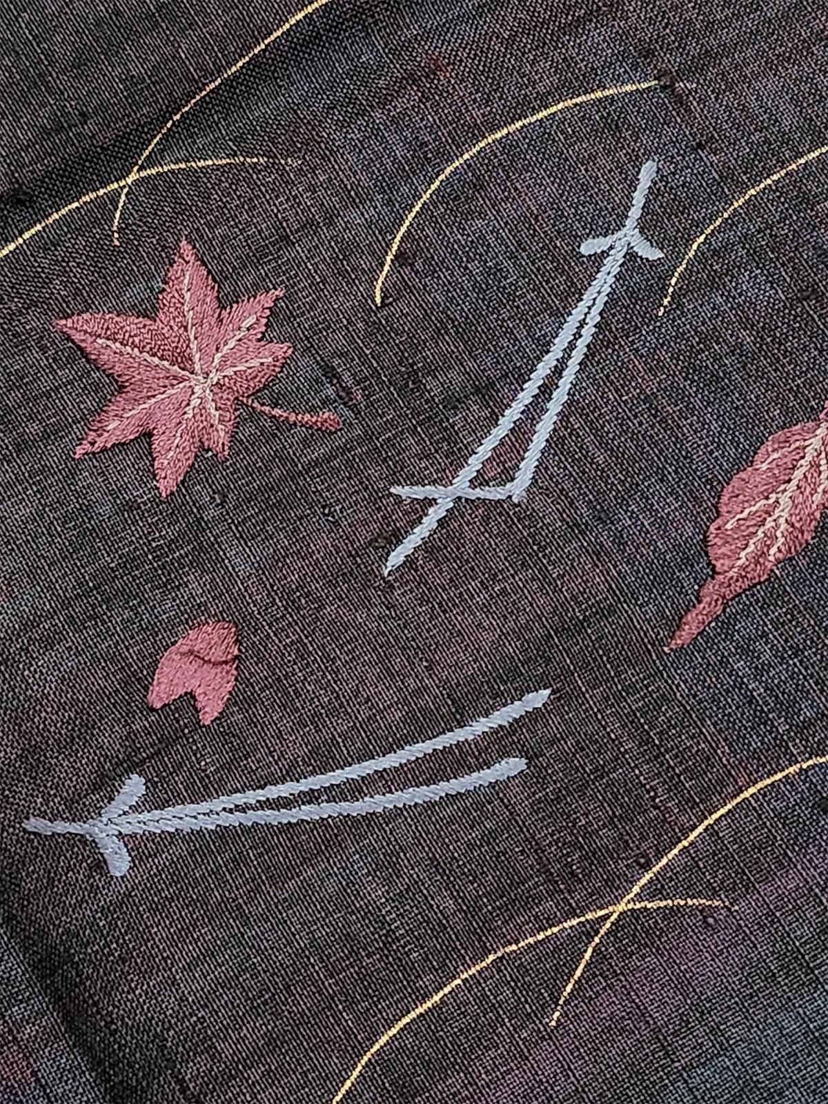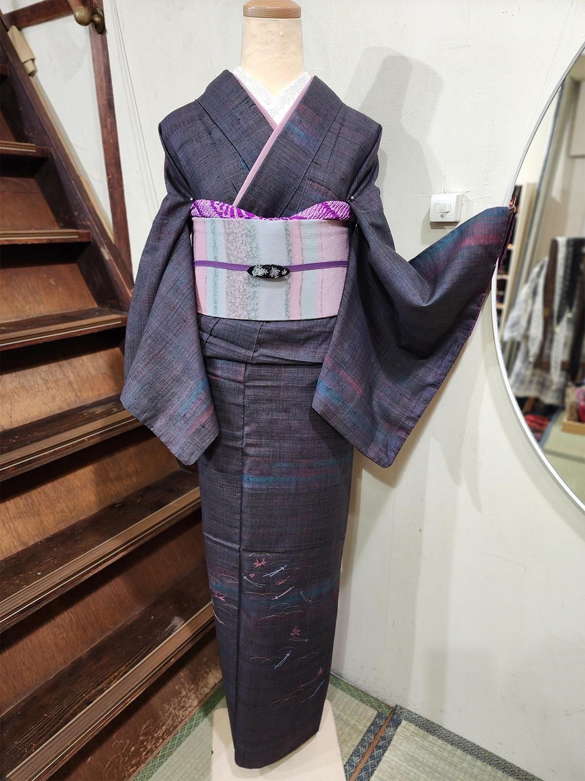 渋染ならではの味わいのある夕闇を思わせる深い紫鼠茶の紬地に、風に吹き寄せられたような刺繍の木の葉模様が浮かぶ、静謐な美をまとう正絹紬の付下げ着物