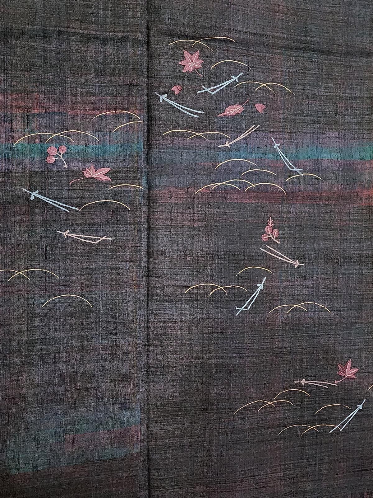 - デザイン: 柿渋染ならでは落ち着いた茶鼠色に、紫や青緑の彩りが浮かび上がる、夕映えの色をほのかに残した宵の空のような正絹紬地。繊細な弧を描く金彩の芝草と、風にふわりと吹き寄せられたような松葉、萩の葉、楓葉、椎の葉のような木の葉の模様が刺繍された、付下げ柄の袷着物です。手仕事ならではの立体感ある刺繍が、落ち着いた地色にそっと色を添え、しっとりとした季節感と風情を生み出します。経糸に密かに織り込まれた赤、青、緑、芥子の色彩が、単色にはない奥行きと、吸い込まれるような深みを生み出しています。縫い取りの一つ紋付きです。